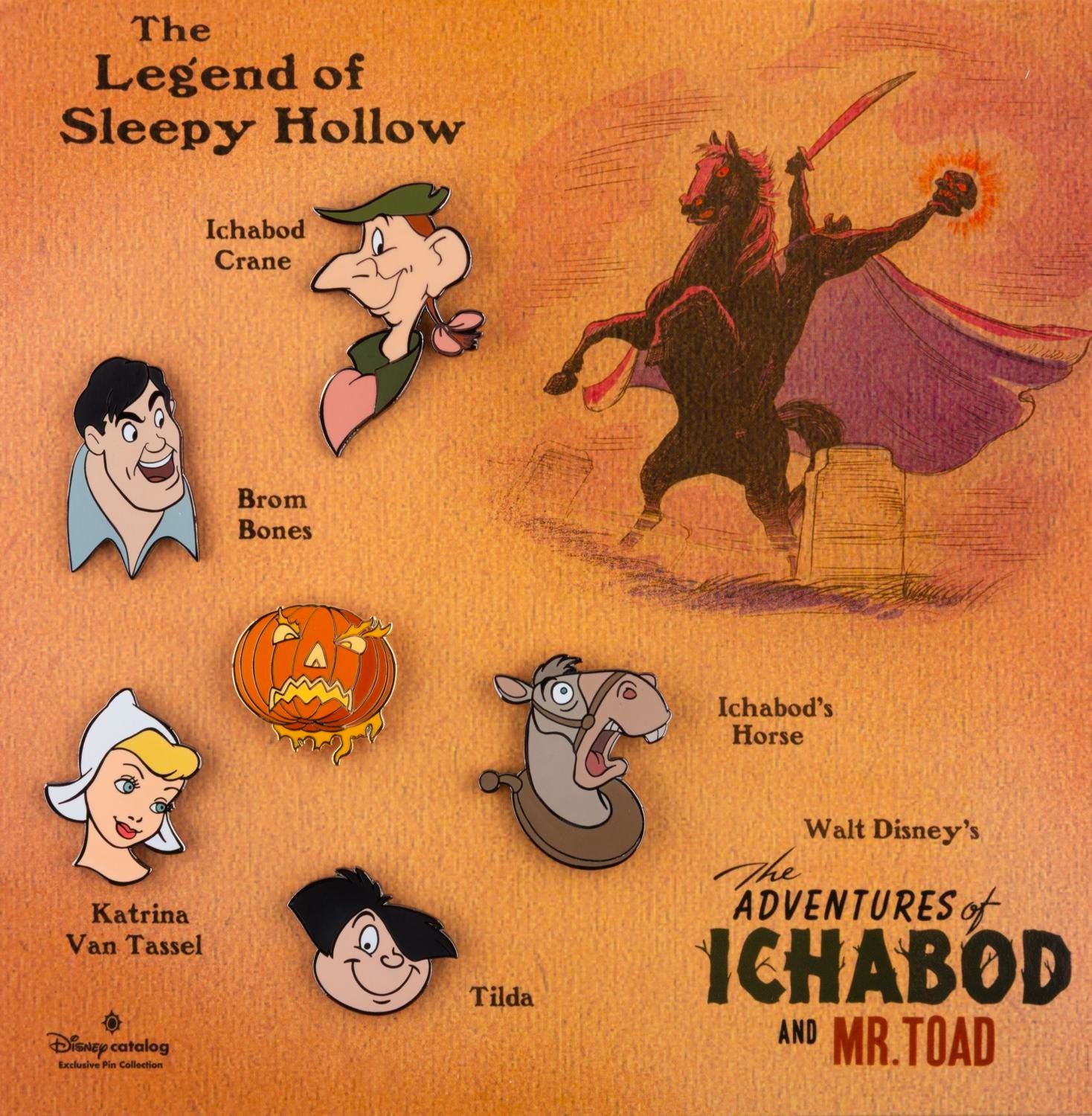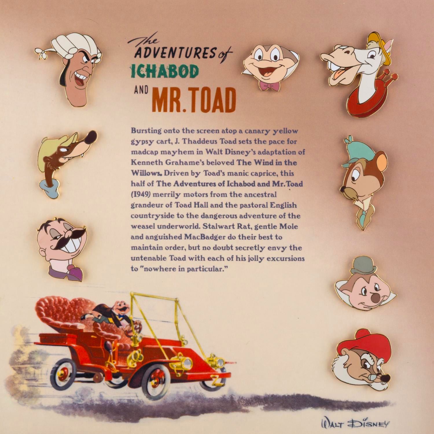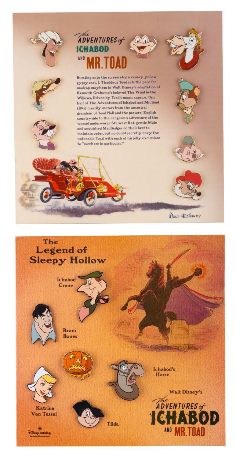 (Disney Catalog, 2002) Two pin sets featuring characters from "The Adventures of Ichabod and Mr. Toad." Included are a set of eight "Mr. Toad" characters and a set of six "Ichabod" segment characters from "The Legend of Sleepy Hollow." Released exclusively by the Disney catalog in a Limited Edition of 1,500 each, the pin sets on 6.75" x 6.75" cards are in fine condition.