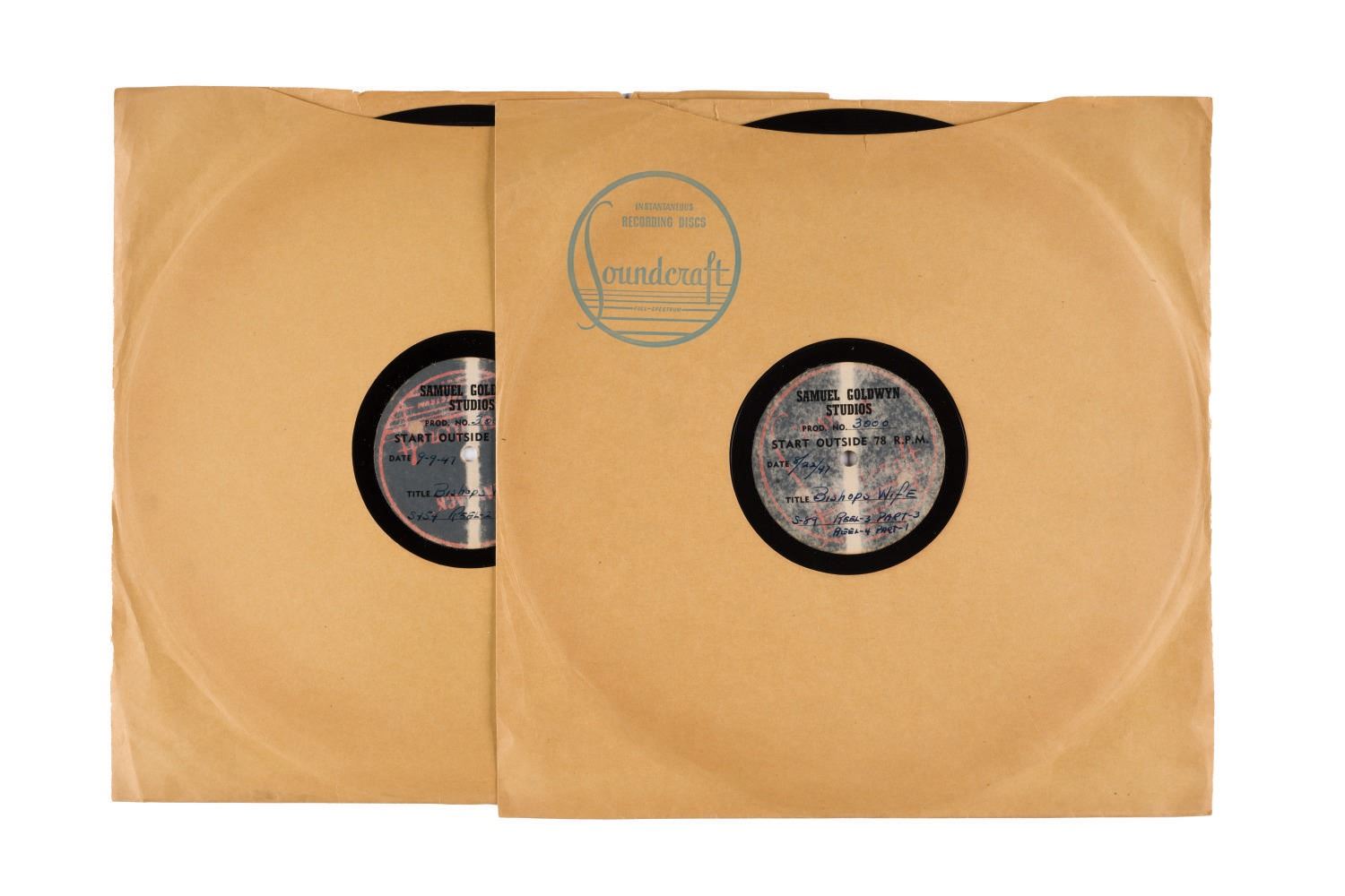 (Samuel Goldwyn, 1947) A pair of acetate recordings prepared by Samuel Goldwyn Studios for the production of "The Bishop's Wife." Both records feature various cuts of orchestrated music produced for "The Bishop's Wife," recorded 8-22-47 and 9-9-47. Measuring 12", the acetate records are in very good to fine condition with the slightest wear.