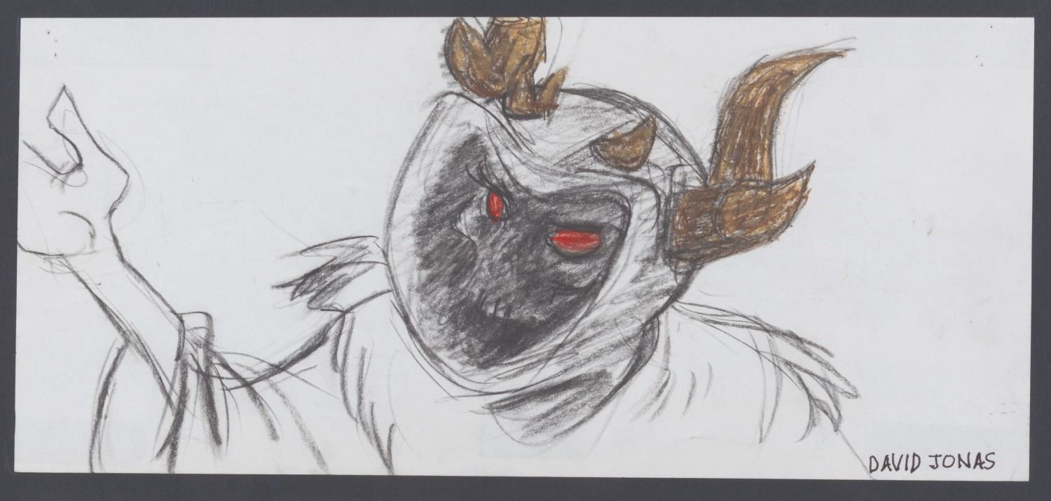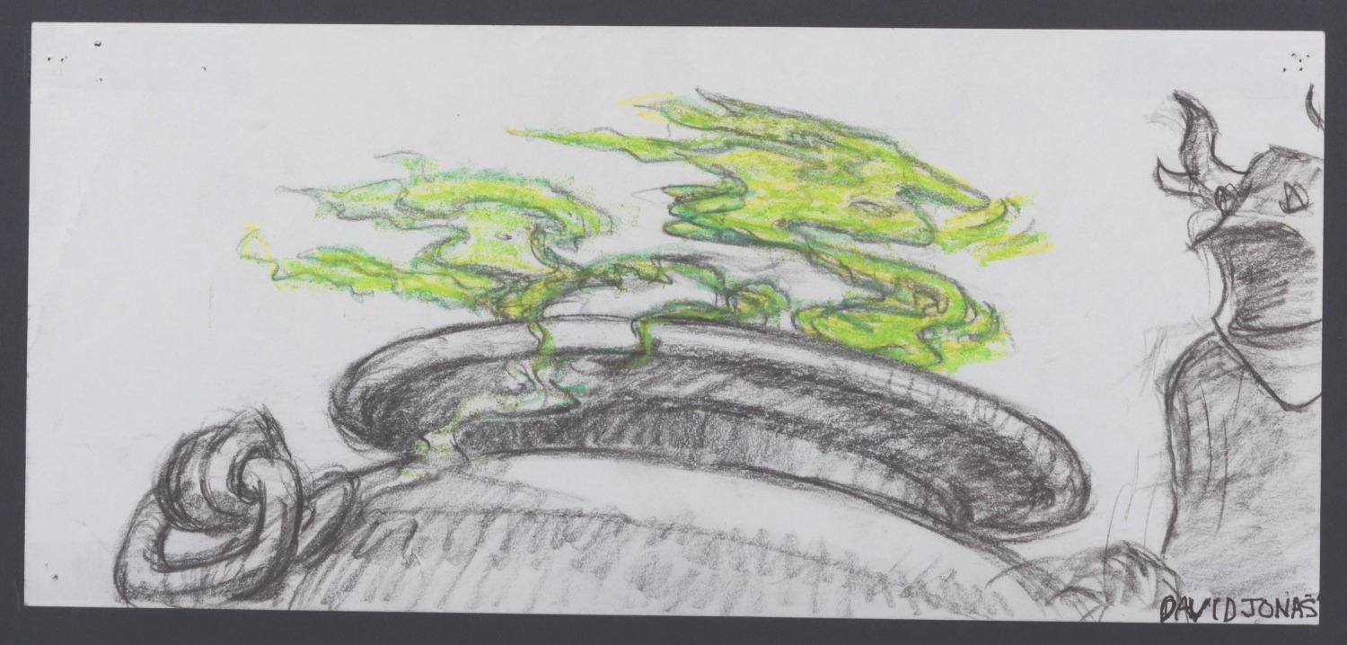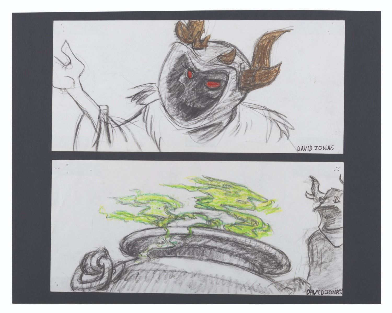 (Disney, 1985) A pair of storyboard panels by David Jonas of the Horned King and his cauldron from "The Black Cauldron." The panels are mounted on a piece of 11.25" x 14" black construction paper for display at the Studio. Measuring 5" x 11" each, the panels are in very good condition with light creases and pinholes from Studio use.