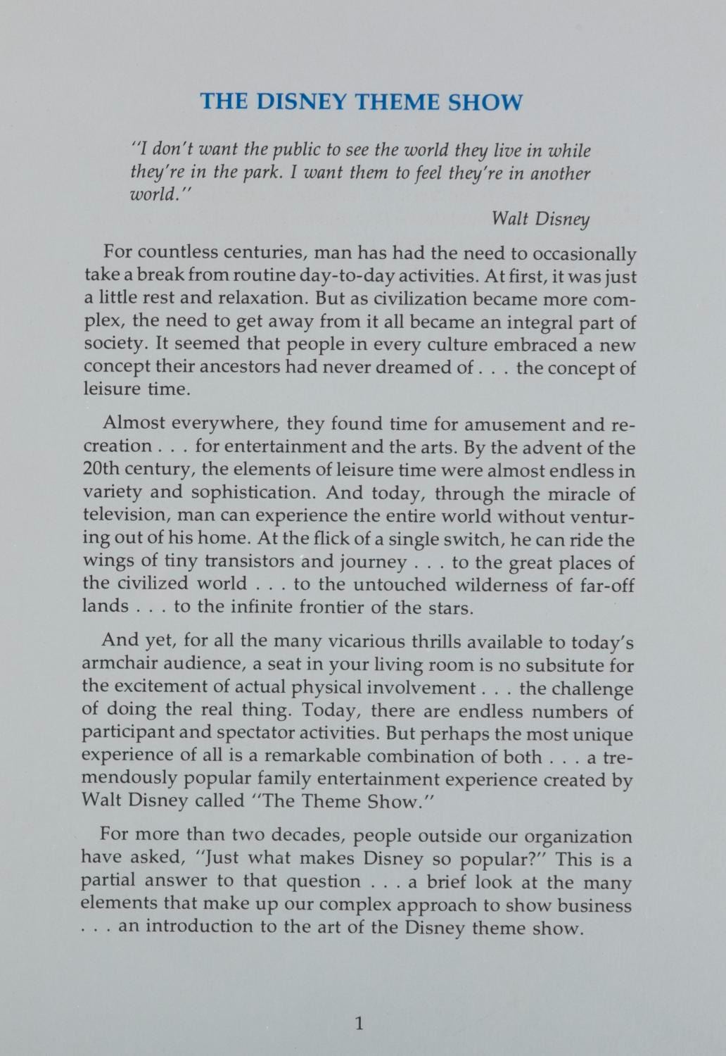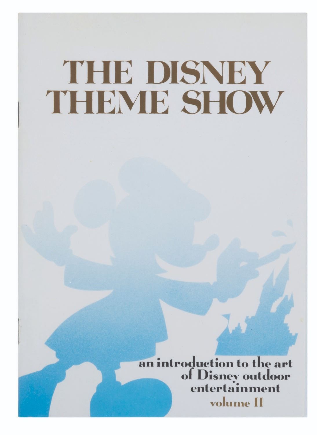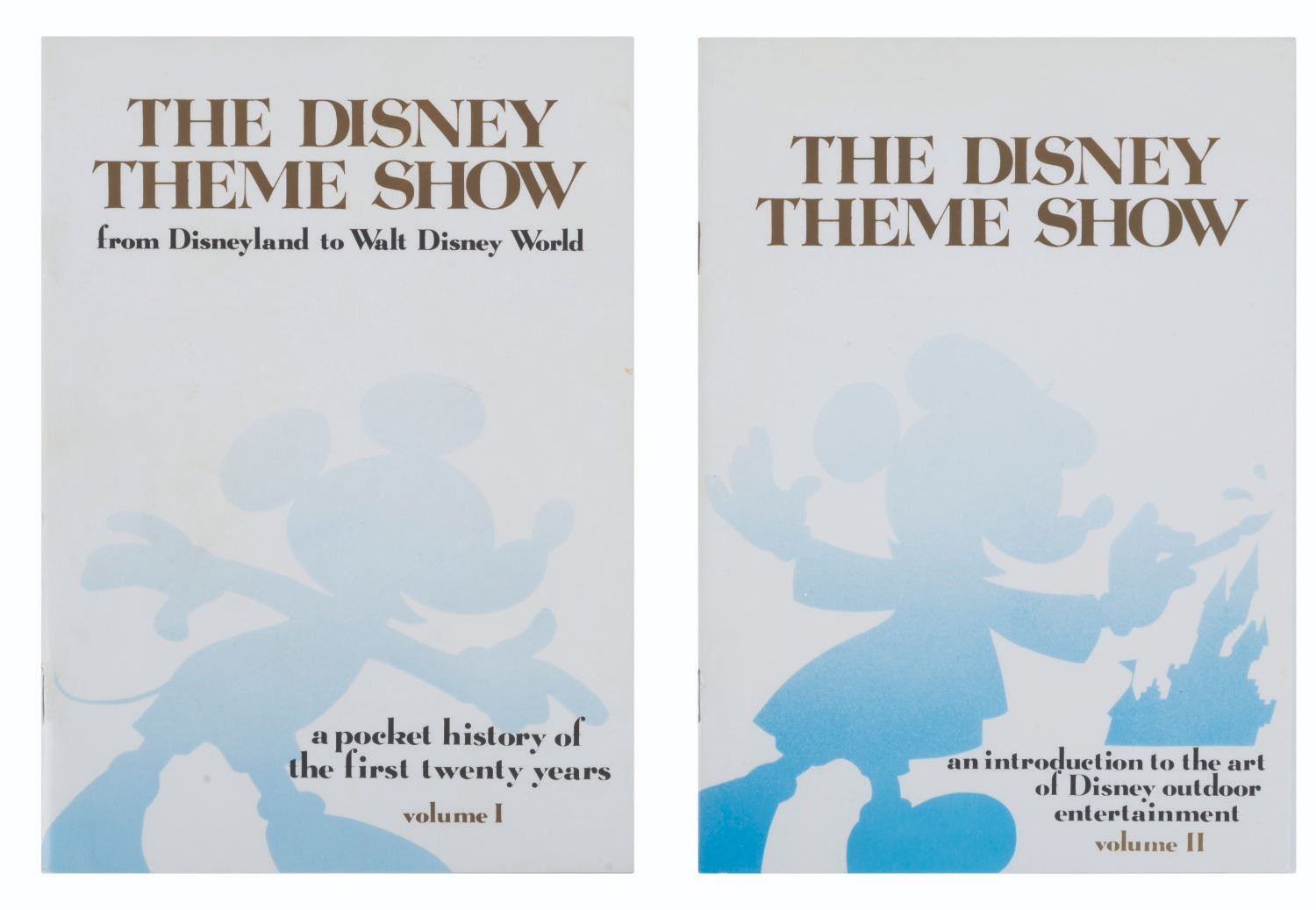 (Disneyland, 1976) A pair of "The Disney Theme Show" Volume I & II booklets distributed to Cast Members for a quick reference on the history of the Walt Disney Studios and Disneyland. Measuring 7.75" x 5.5", both booklets are in very good condition with light wear to the covers and spines.