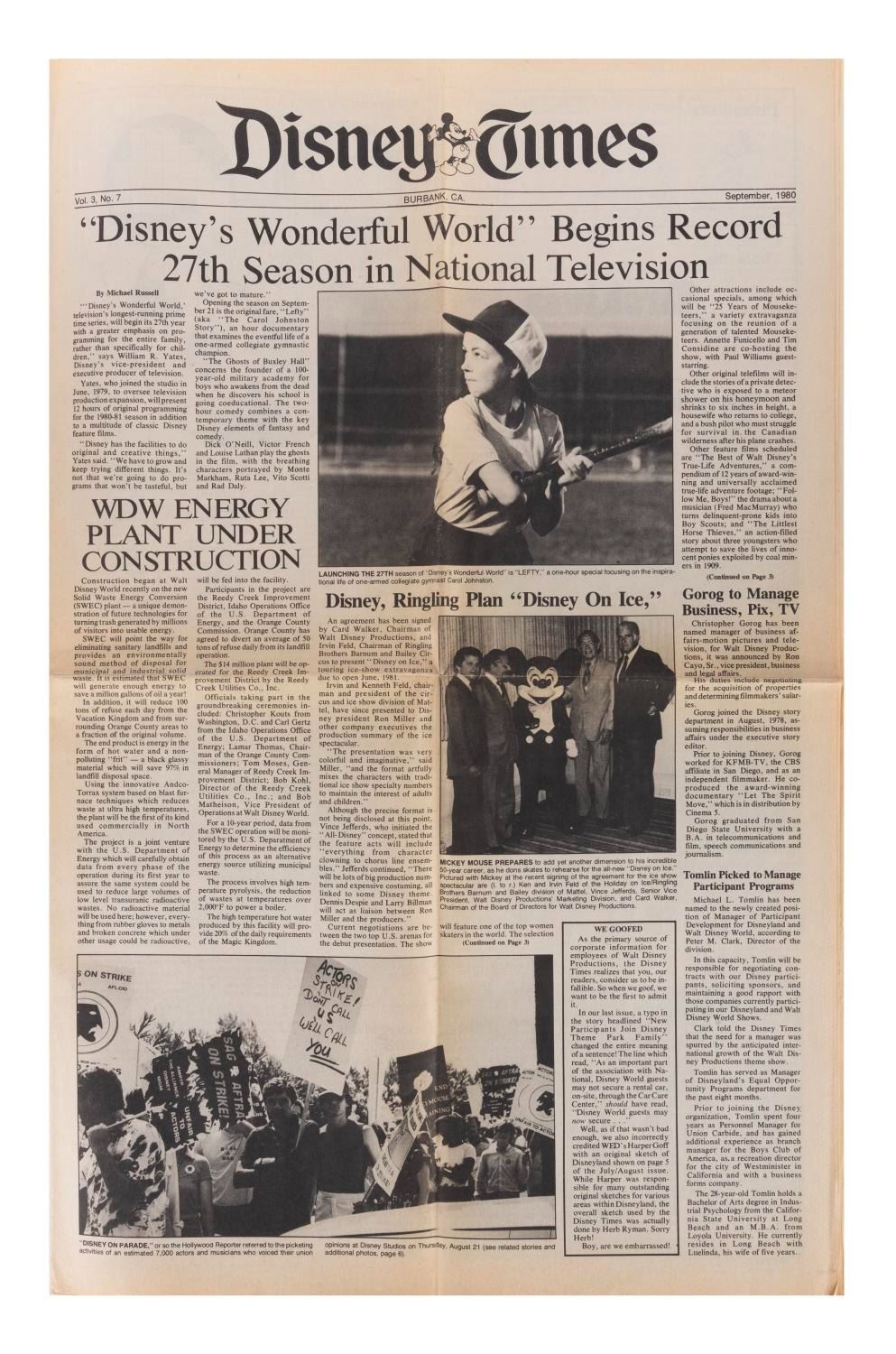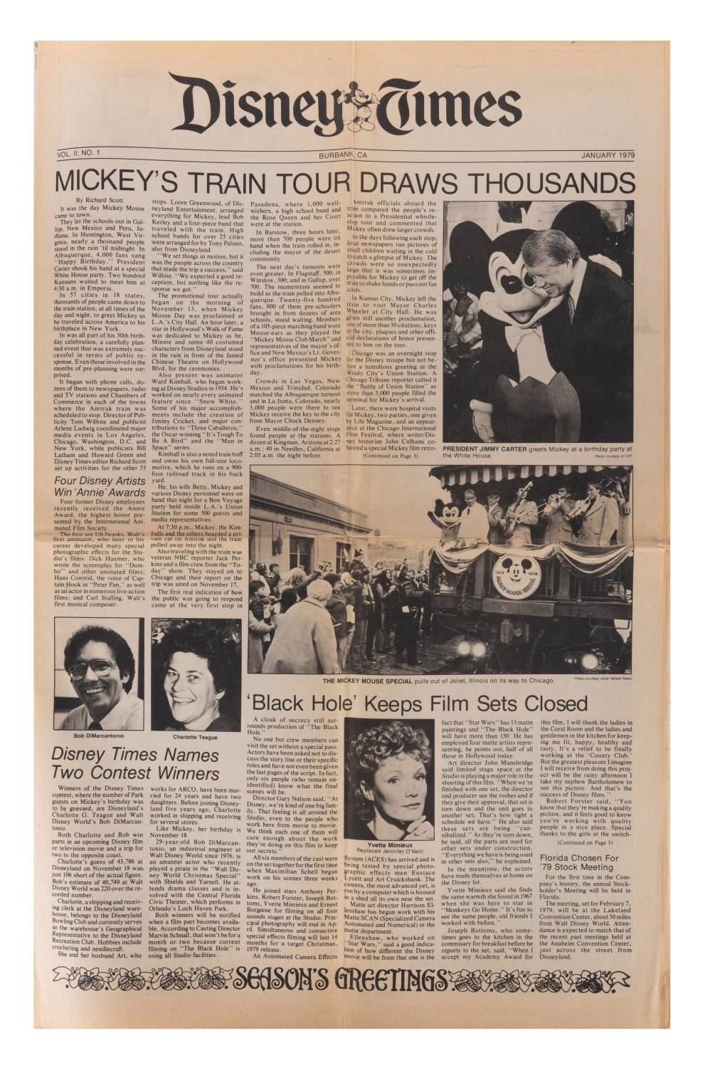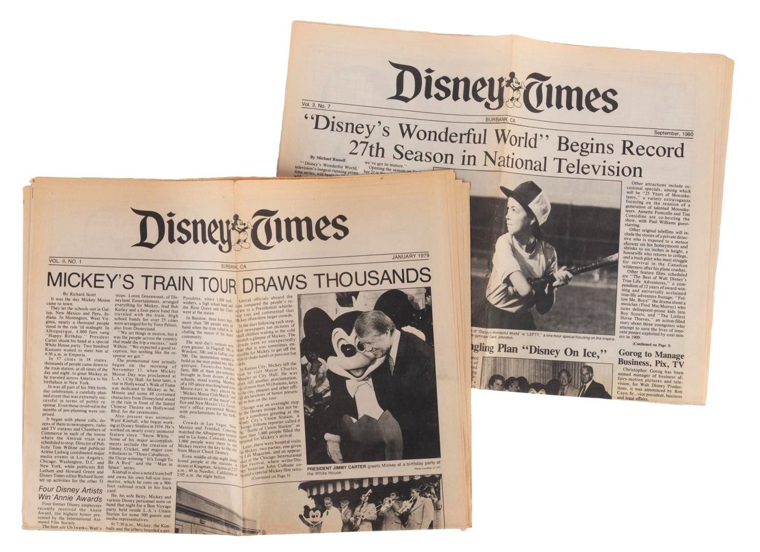 (Disney, 1979/80) A pair of The Disney Times newspapers featuring stories about Mickey's Train Tour to Washington and 27 seasons of the long-running "Disney's Wonderful World." Measuring 14.5"x11.5" when folded, each paper is in good condition exhibiting additional vertical folds, yellowing, and wear to their folds, edges, and corners.