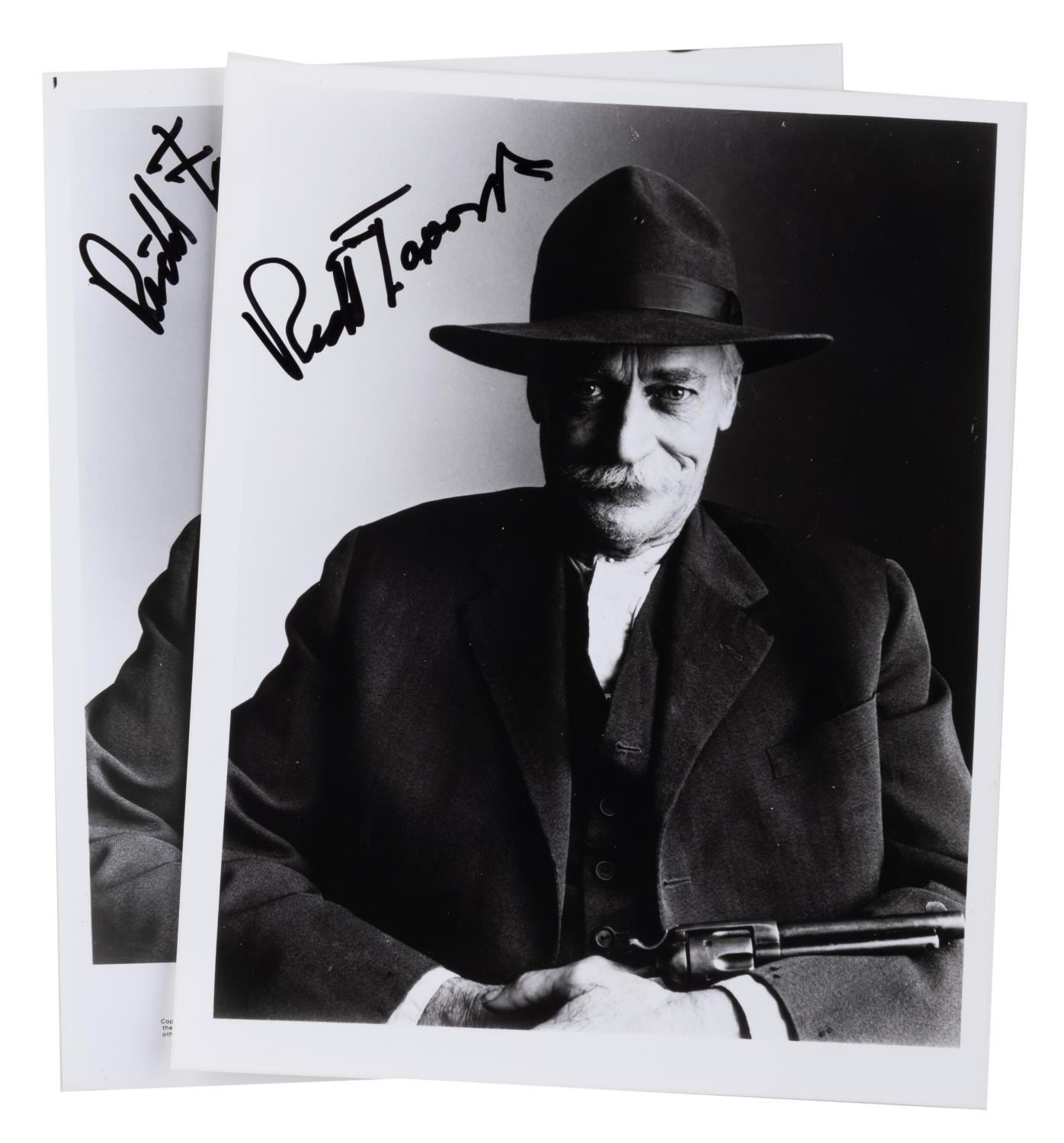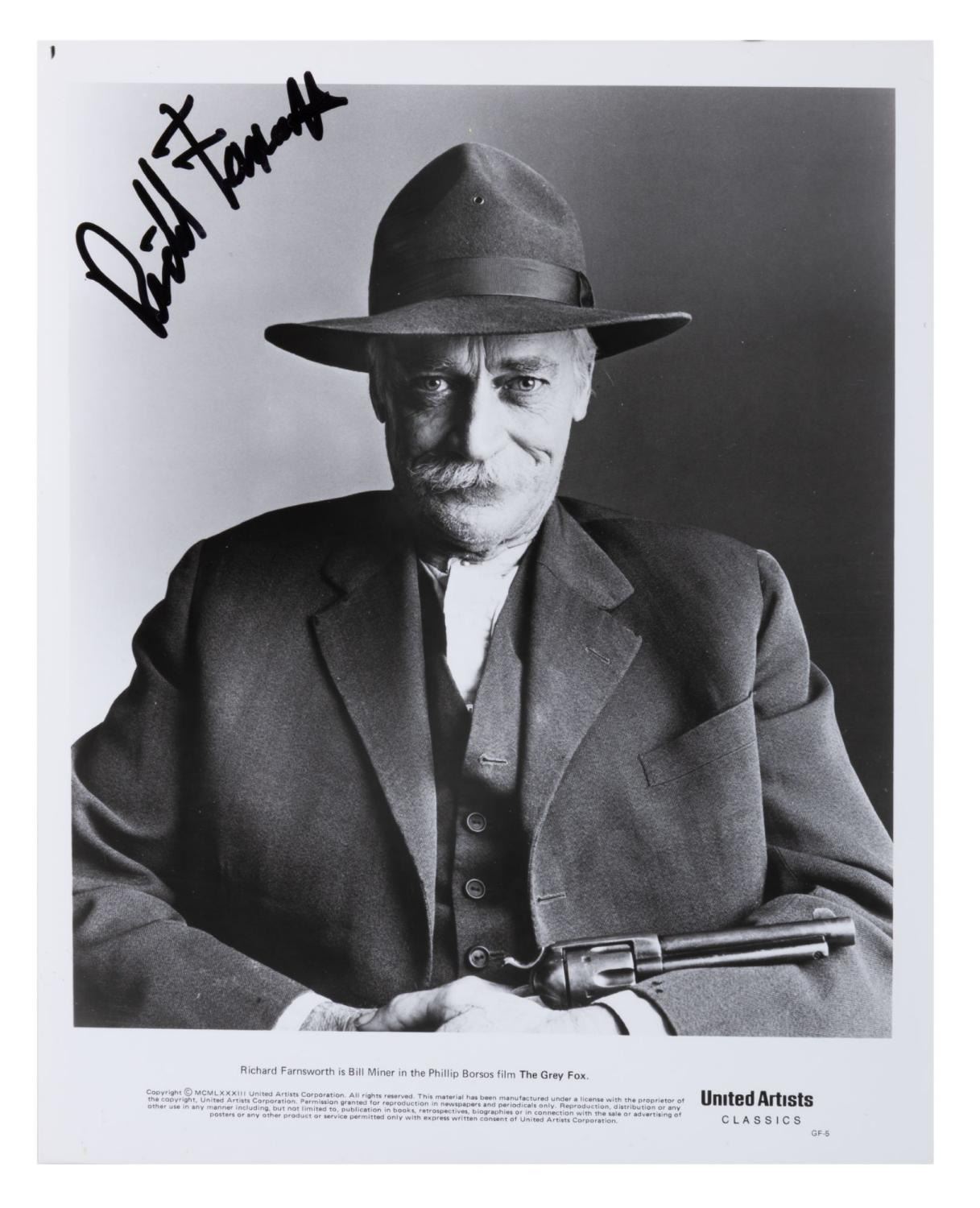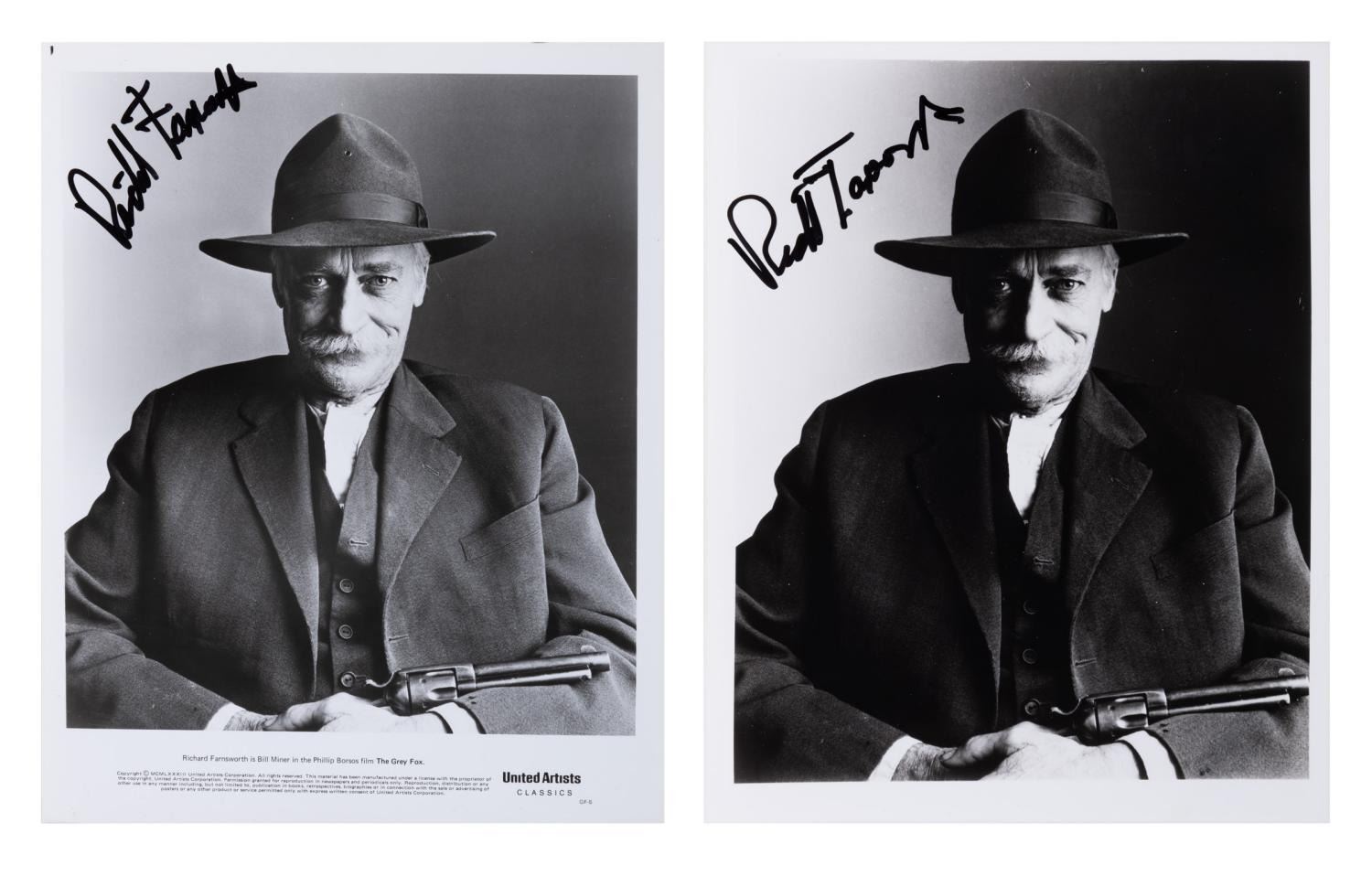 (United Artists, 1982) A pair of publicity photos for "The Grey Fox" signed by lead actor Richard Farnsworth. The signed photos are in very good condition.