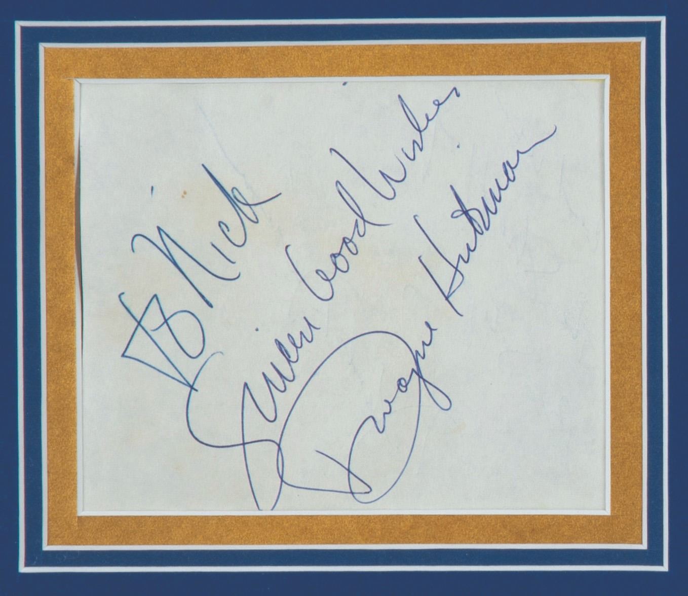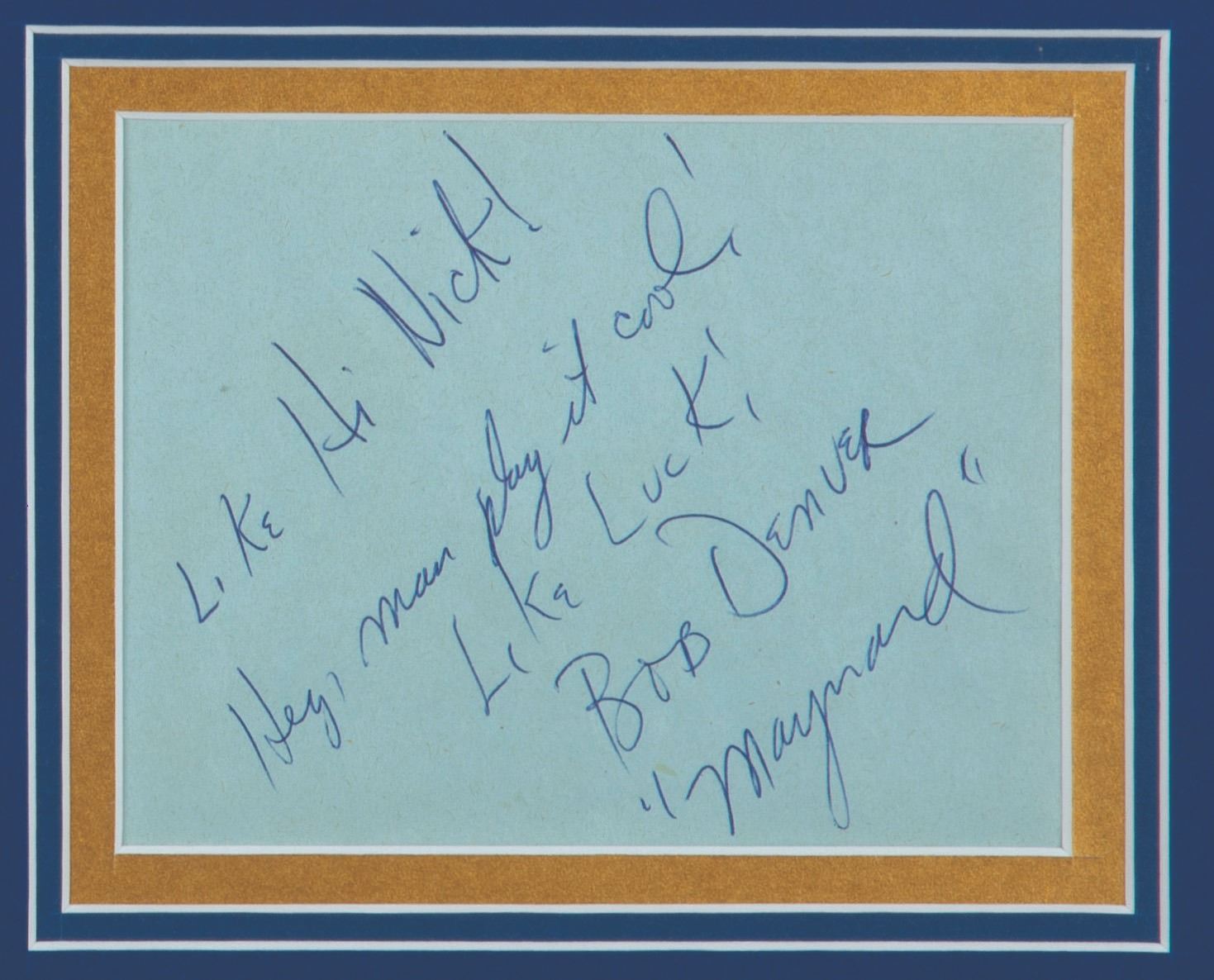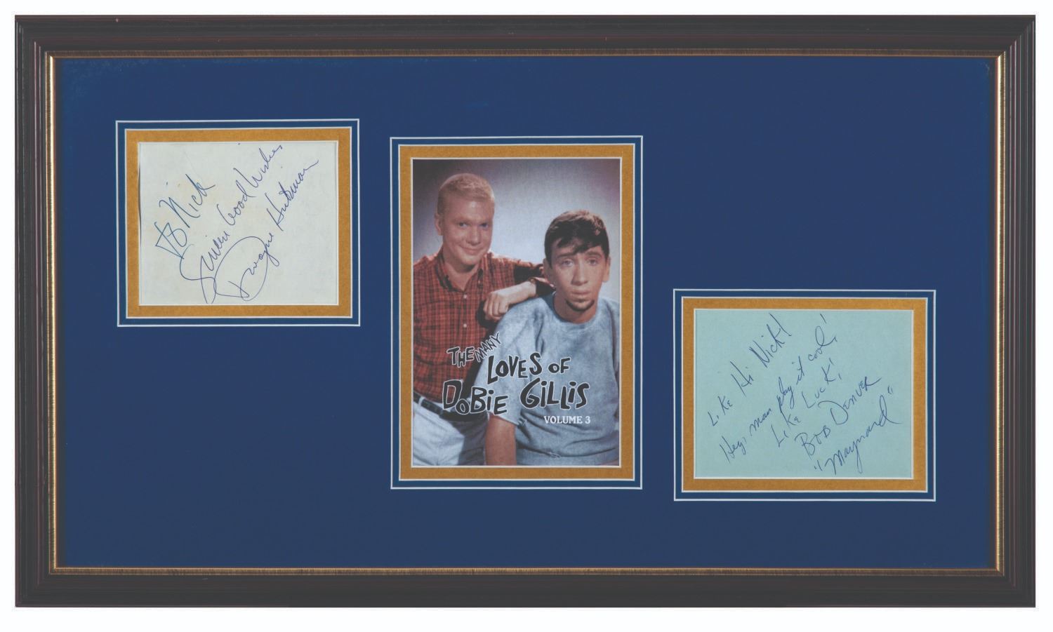 (20th Century Fox, 1959) A pair of autographs from the stars of the classic sitcom,"The Many Loves of Dobie Gillis." Signatures of the series stars Dwayne Hickman (Dobie) and Bob Denver (Maynard G. Krebs) with dedication are matted and framed with an image of the pair. Hickman's signature piece measures 3.5"x4.5" visible and is in good condition, with slight waviness and writing visible from the reverse side. Denver's autograph on 4"x5" visible is in very good condition.