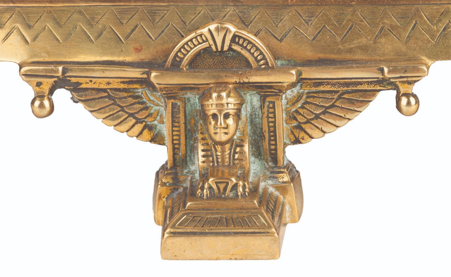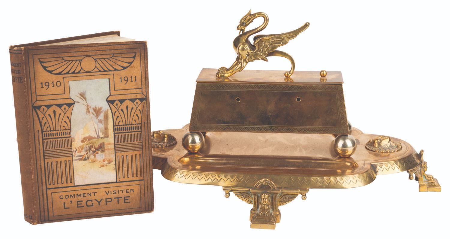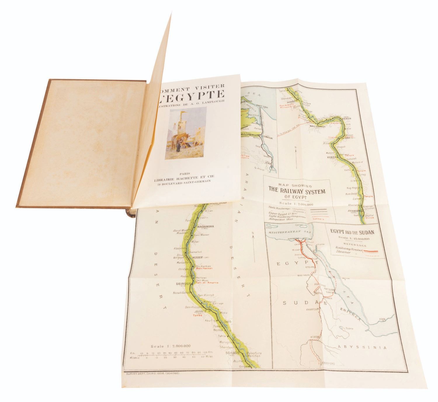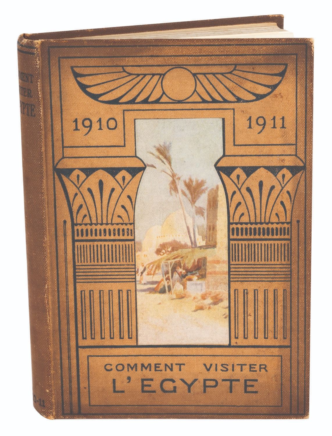 (Universal/Librairie Hatchett Et Cie, 1999-2001/1911) A pair of set dressing props from "The Mummy” and "The Mummy Returns.” Included are an ornate gold-toned Egyptian-style metal statue and a Comment Visiter L’Egypte guidebook. Published in 1910-1911, the 222-page French guidebook features travel information with fold-out maps and was used by production to decorate the library. Measuring 13.5” x 9” x 8” and 4.76” x 6.75”, the statue and book are both in good condition with scuffs, scratches, oxidation, spotting, and wear from production use and age.