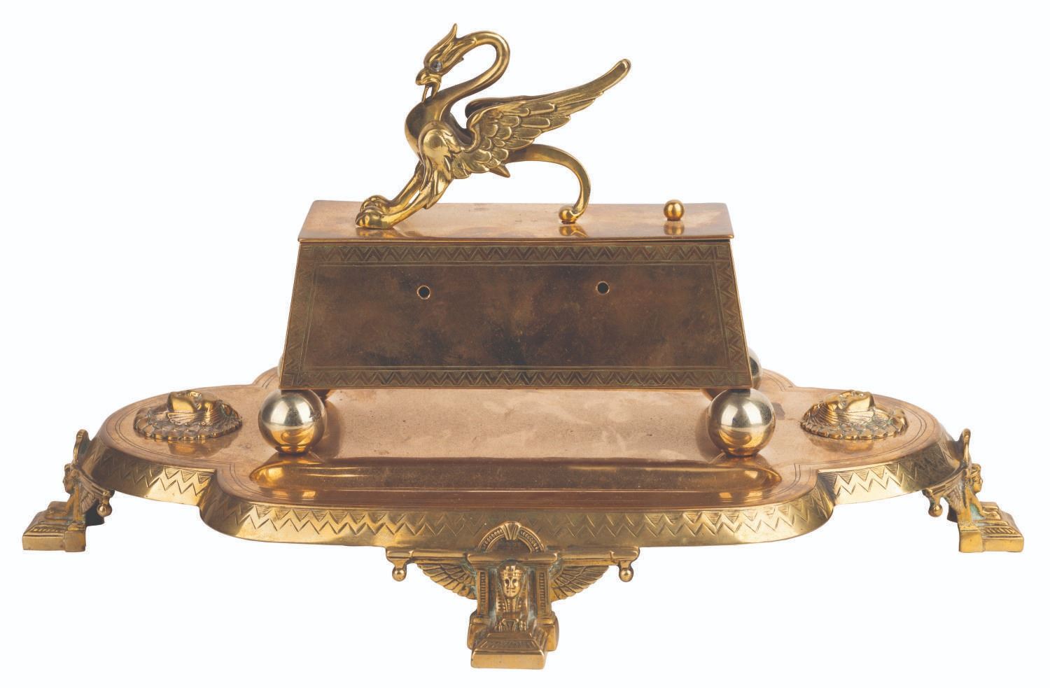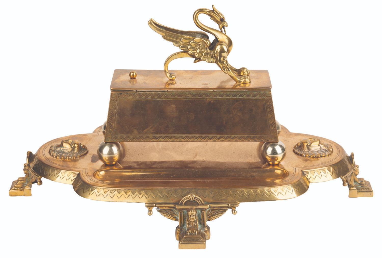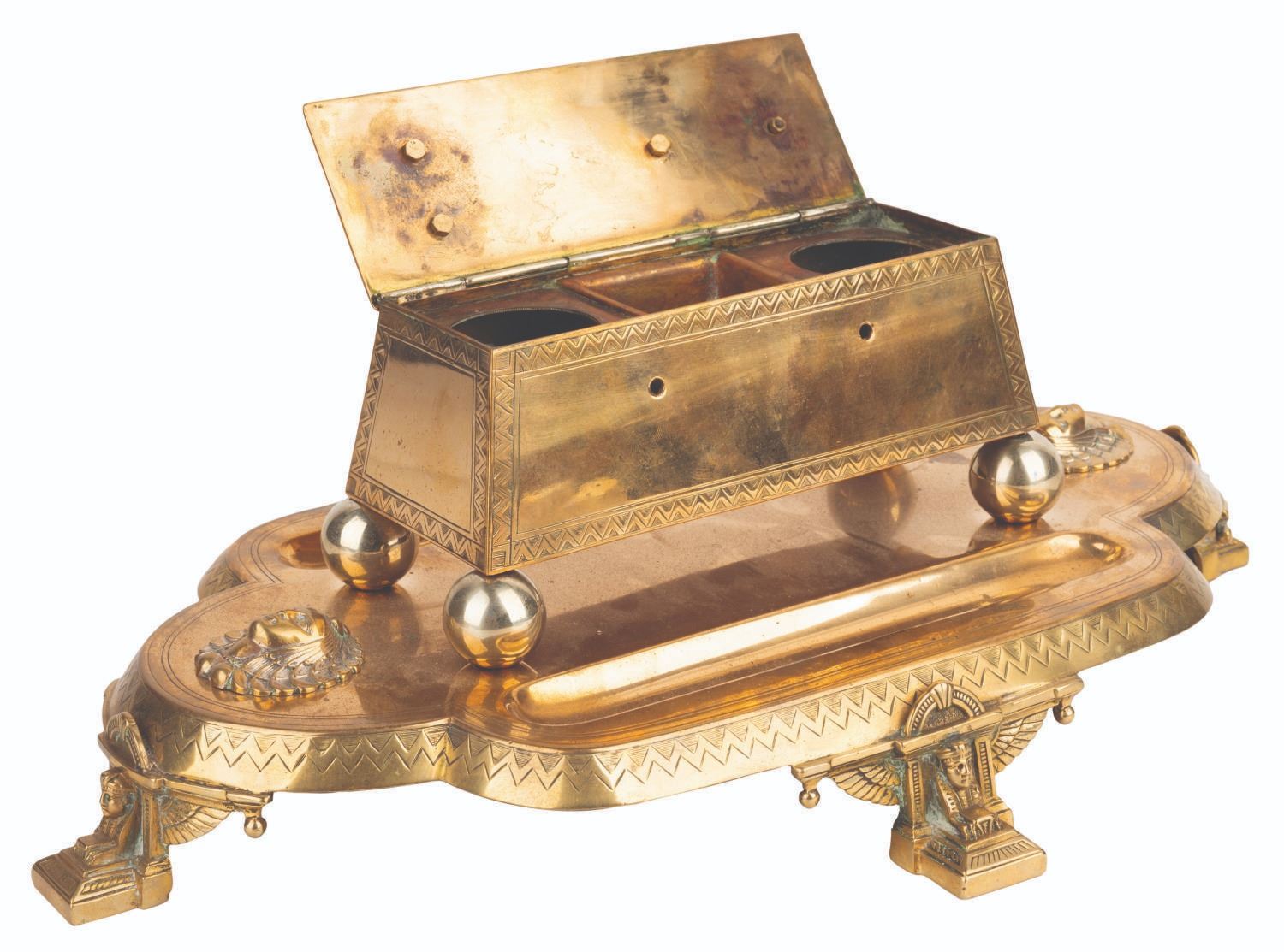 (Universal/Librairie Hatchett Et Cie, 1999-2001/1911) A pair of set dressing props from "The Mummy” and "The Mummy Returns.” Included are an ornate gold-toned Egyptian-style metal statue and a Comment Visiter L’Egypte guidebook. Published in 1910-1911, the 222-page French guidebook features travel information with fold-out maps and was used by production to decorate the library. Measuring 13.5” x 9” x 8” and 4.76” x 6.75”, the statue and book are both in good condition with scuffs, scratches, oxidation, spotting, and wear from production use and age.