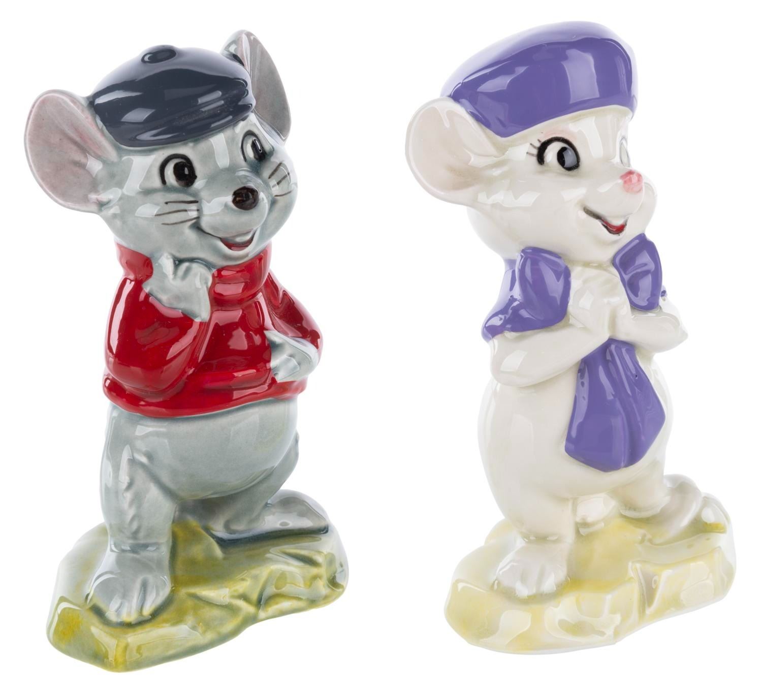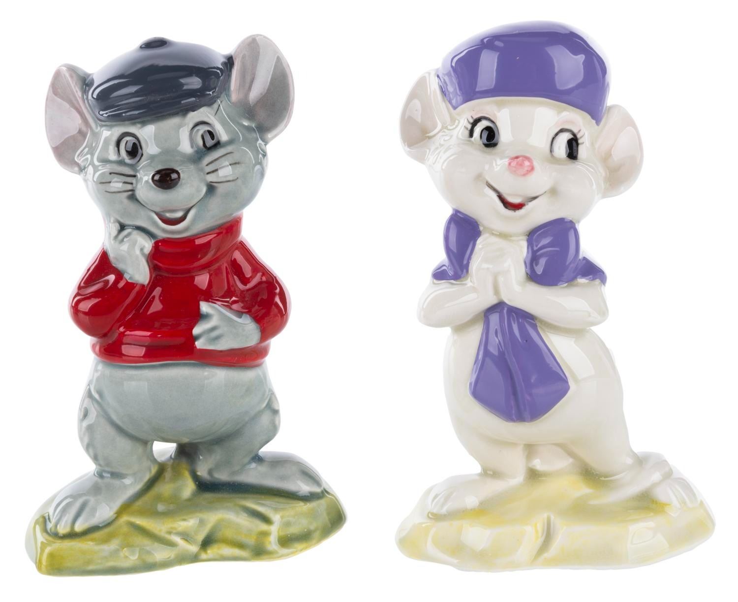 (Disney, 1990s) A pair of ceramic figurines of Bernard and Bianca from “The Rescuers." Measuring 2.5" x 1.5" and 3.5" tall, and 2.25" x 1.75" x 3.75" tall, the figurines are in very good to fine condition with light scratches to Bernard’s hat and a production flaw above his eye.