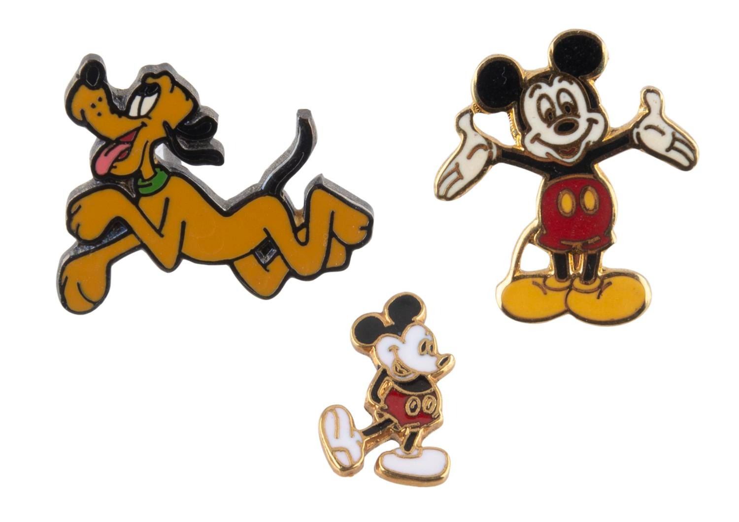 (Disney, 1990s-2000) A pair of tiny Mickey and Pluto pins, together with a tinier Mickey front missing the pin. Measuring from 0.5” to 1”, the pins are in very good condition.