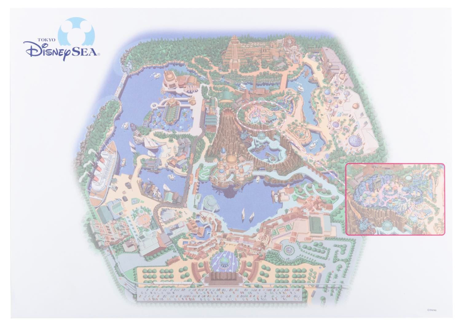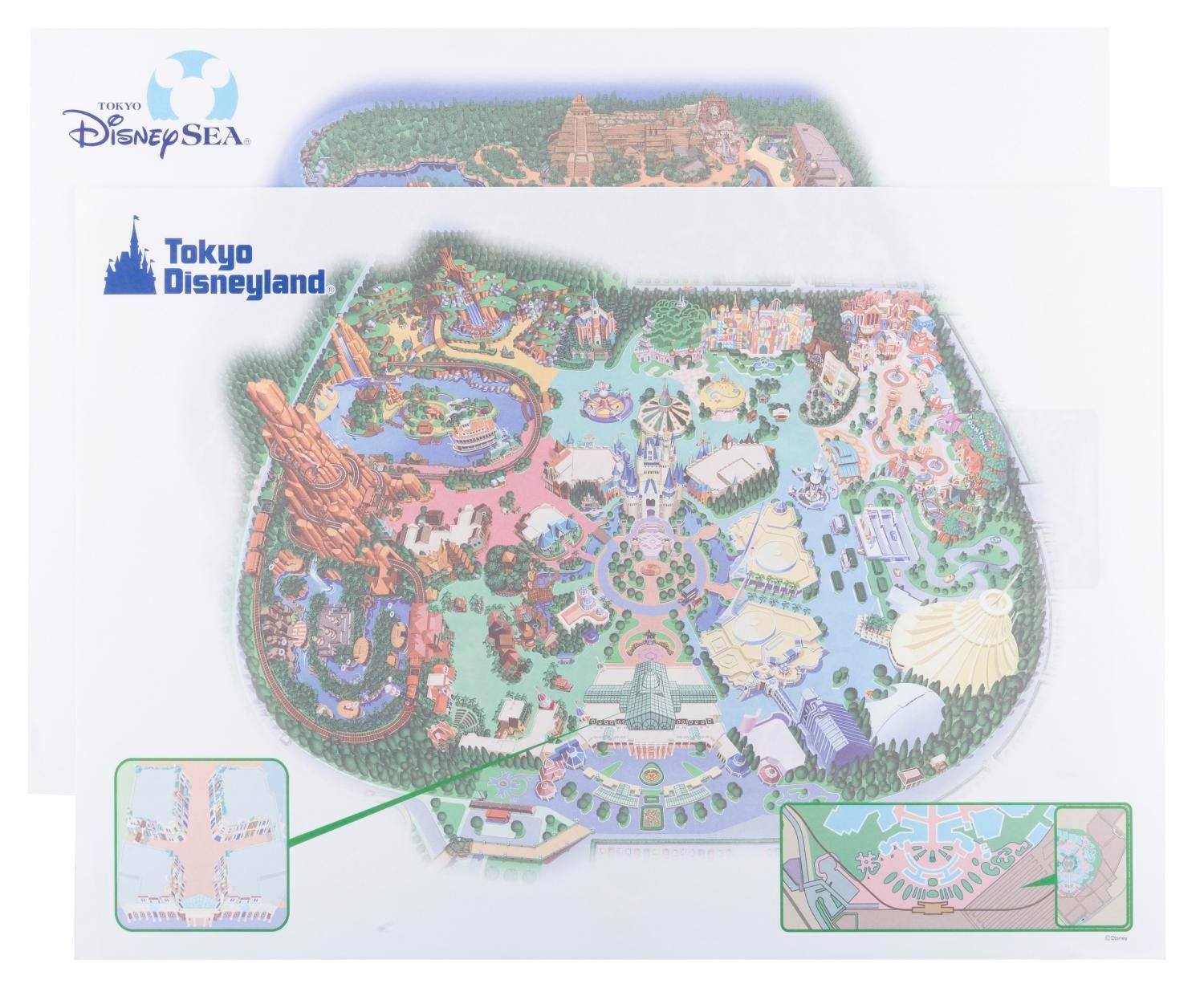 (Tokyo Disneyland Resort, 2000s) A pair of maps of Tokyo Disneyland and Tokyo DisneySea. Each map features a pleasant textless overview of the Park, with insets detailing the interior of the World Bazaar and Mermaid Lagoon. Measuring 11.75" x 16.5" each, the paper maps are in very good condition with light handling wear.