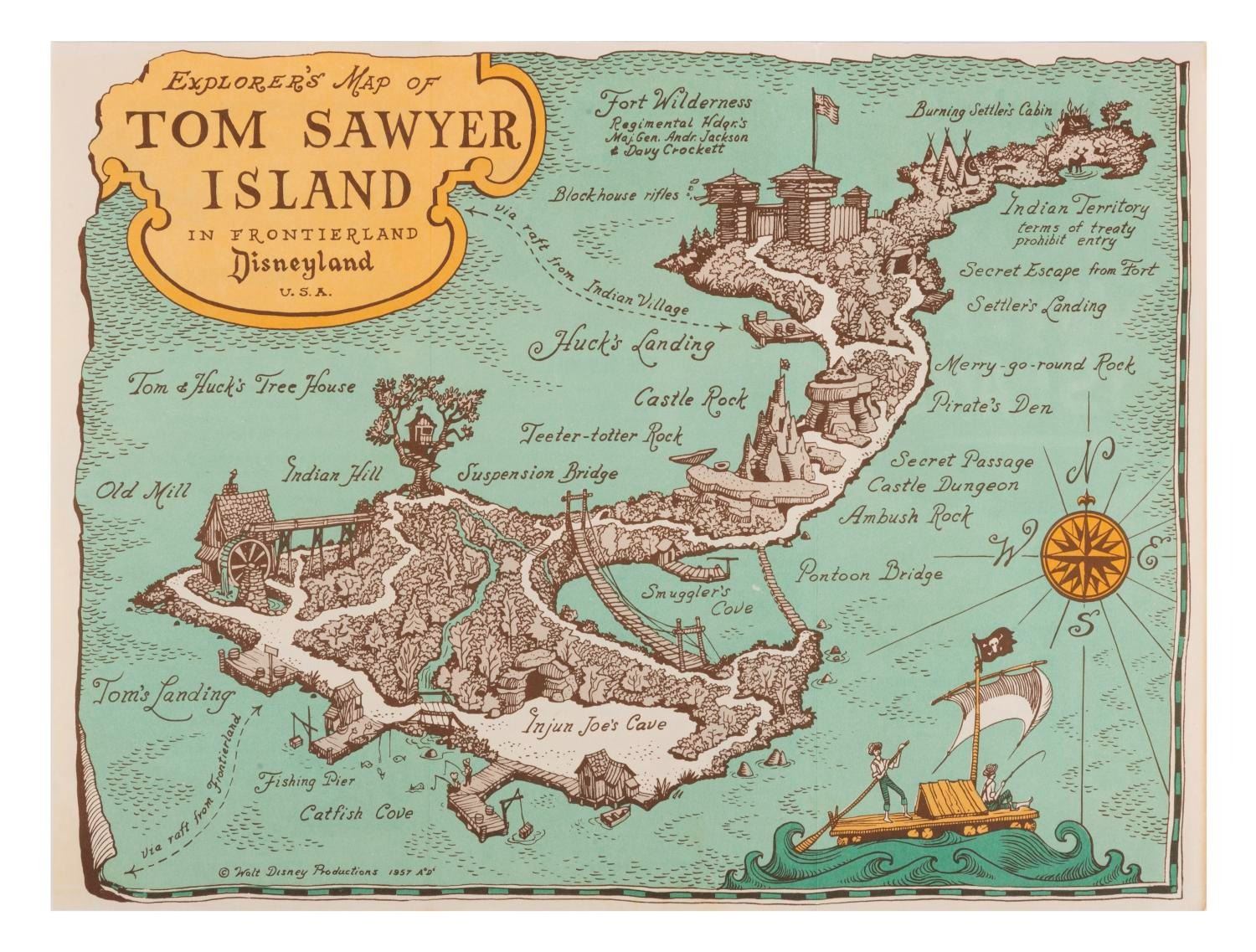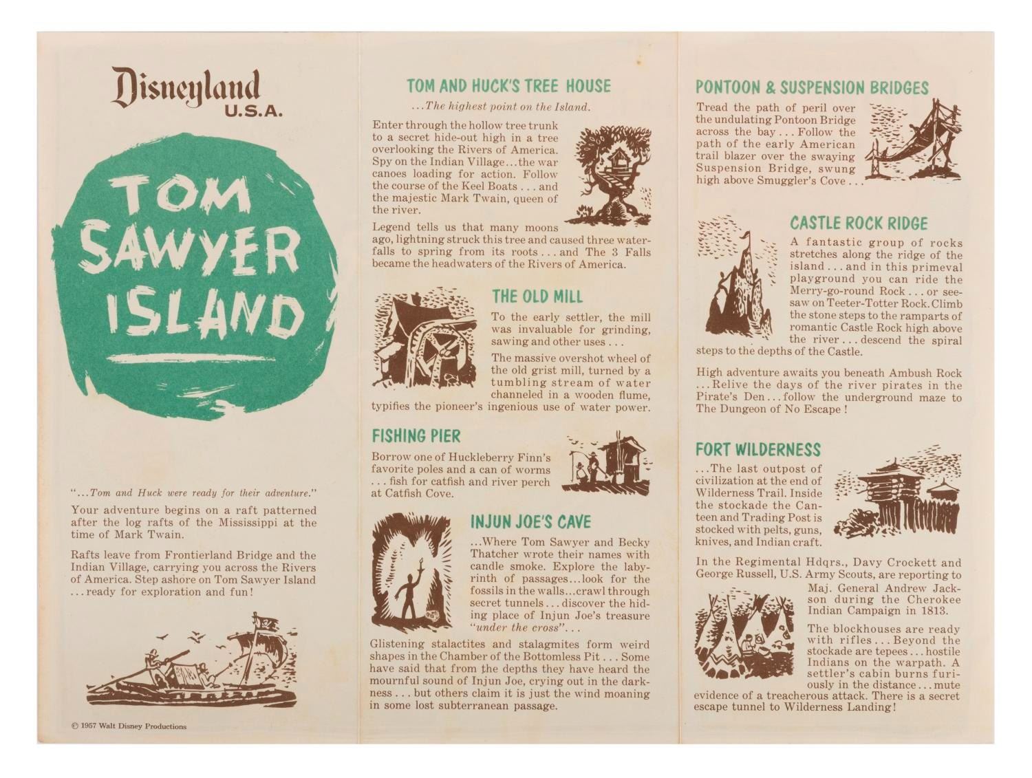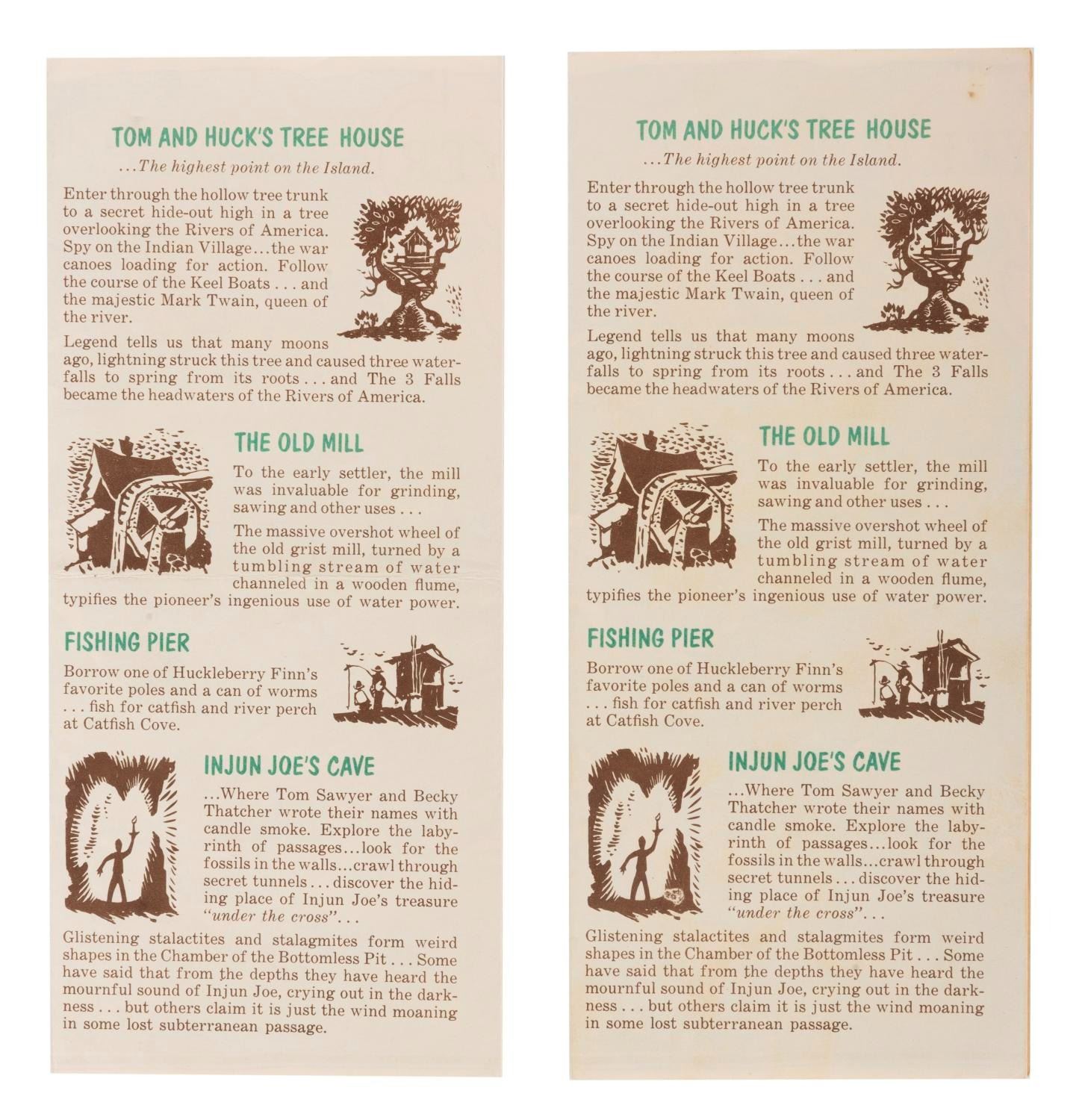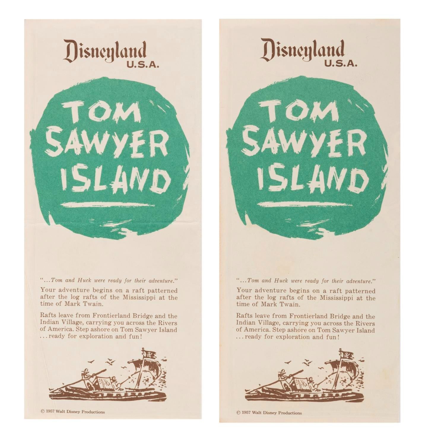 (Disneyland, 1957) This pair of early fold-out "Disneyland U.S.A. Tom Sawyer Island" maps. Measuring 8.5"x3.75", each piece is in good condition, with a few creases, discoloration, and wear.