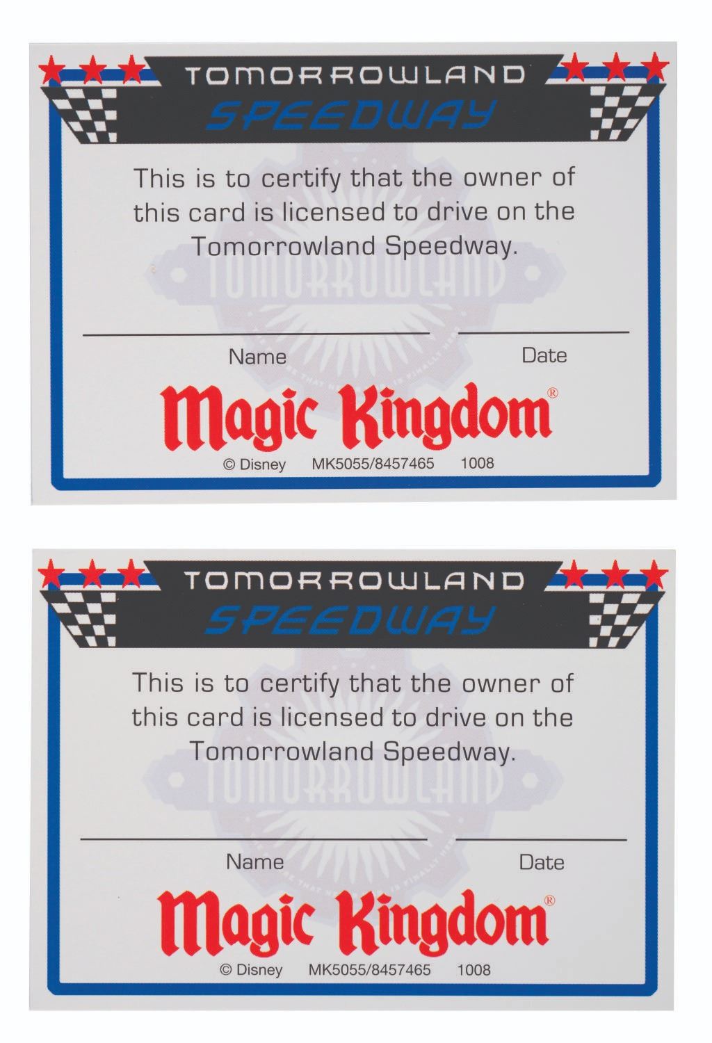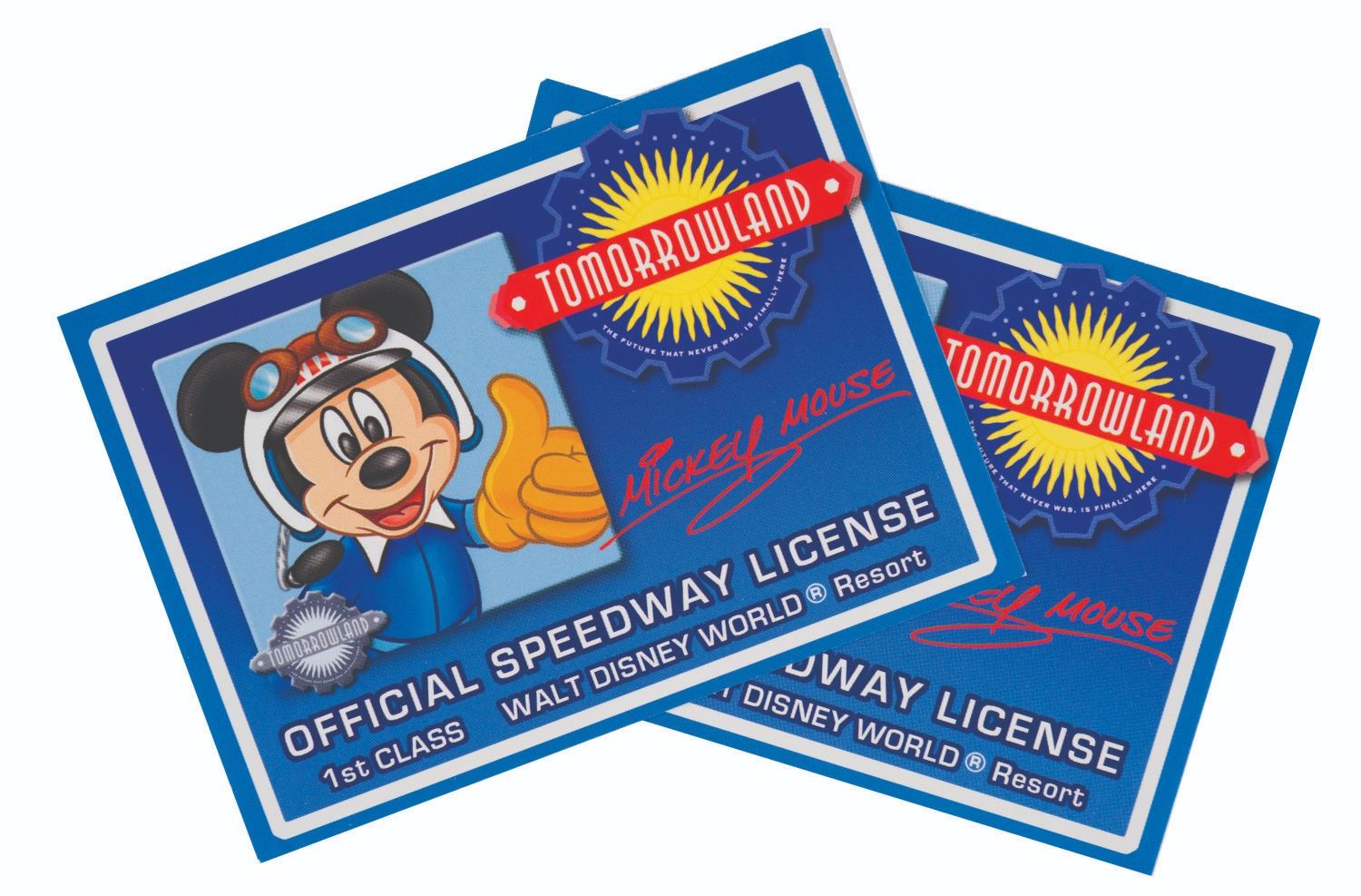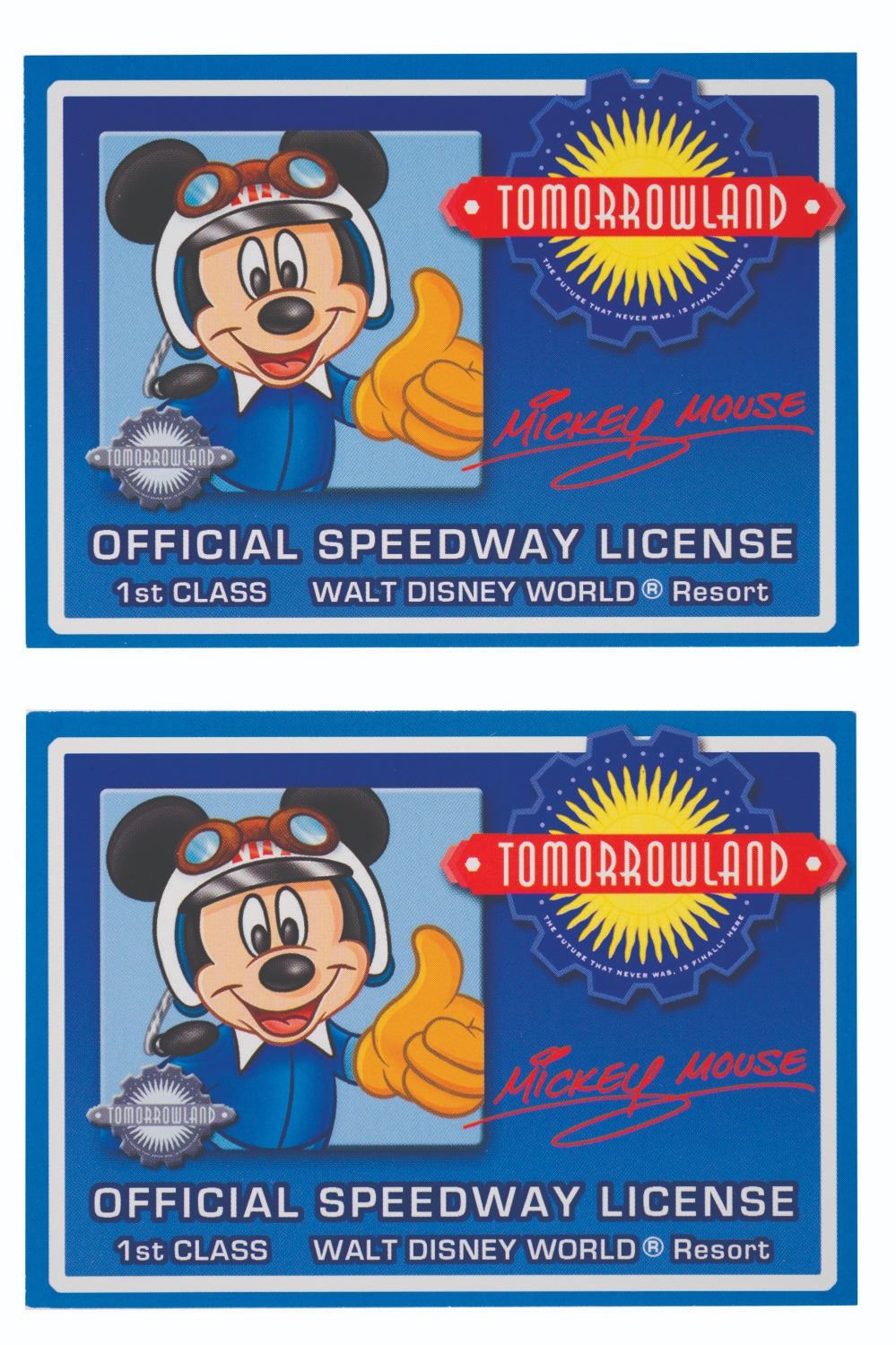 (Walt Disney World, 2010s) A pair of complimentary Tomorrowland Speedway Licenses from The Magic Kingdom. Measuring 3.5" x 2.5", the unused souvenir cards are in fine condition.