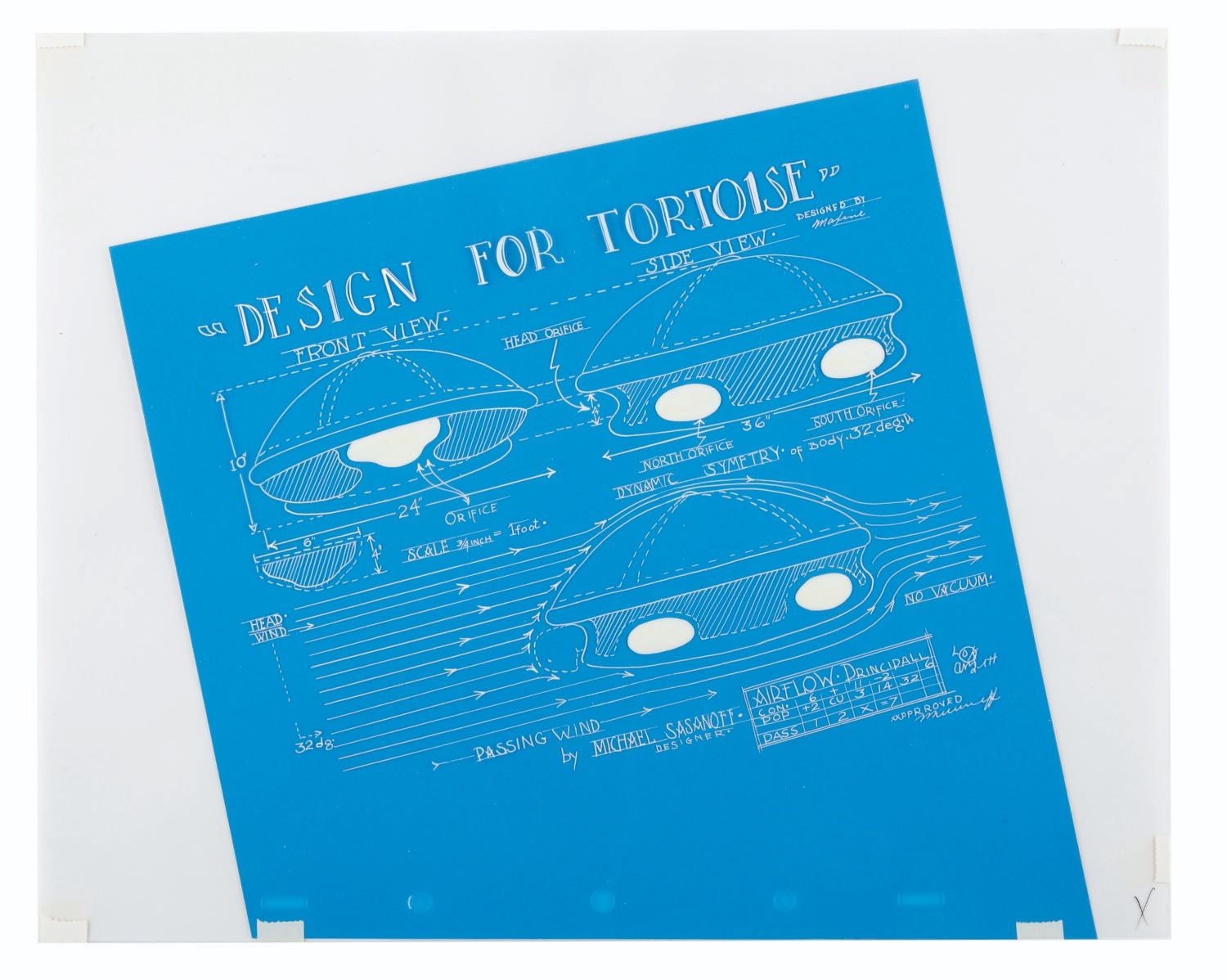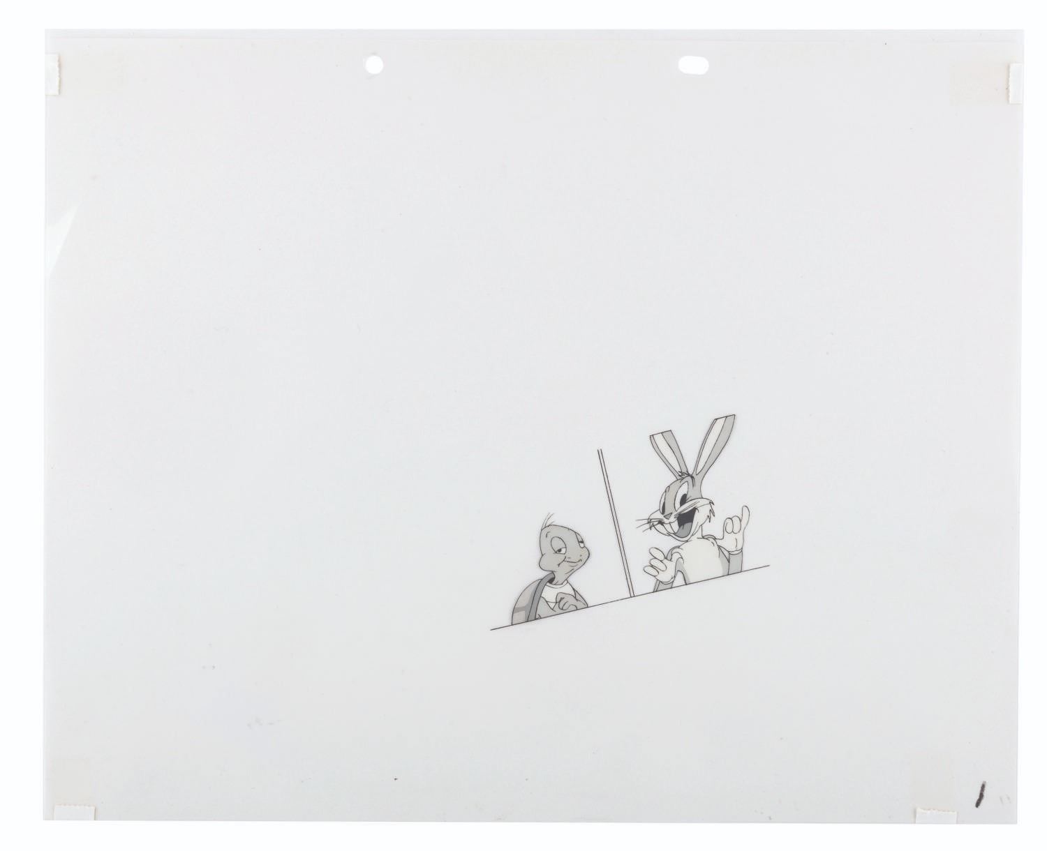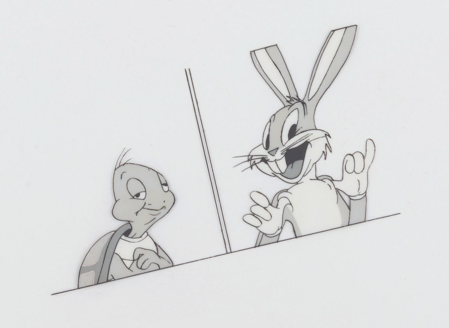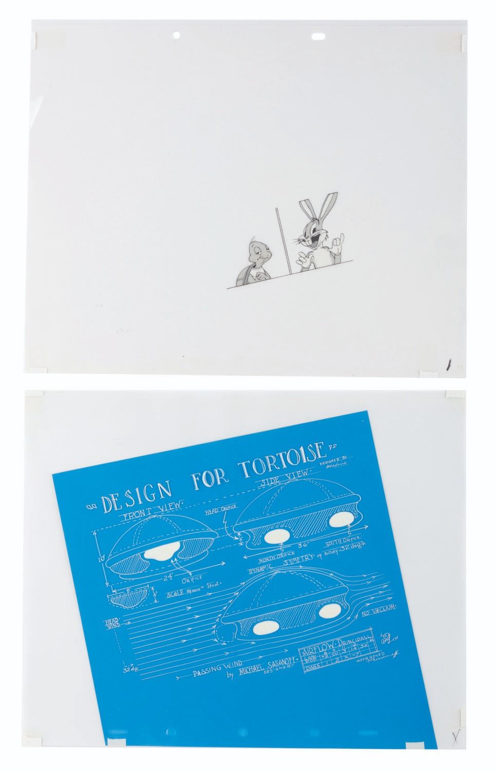 (Schlesinger, 1943) A pair of original production cels of Bugs Bunny, Cecil Turtle, and a blueprint from the Merrie Melodie short “Tortoise Wins by a Hare,” directed by Bob Clampett. With character image sizes of 2.75” x 3.5” and 9.5” x 10.5” on 10” x 12.25” cels, the pair are in fine production-used condition.