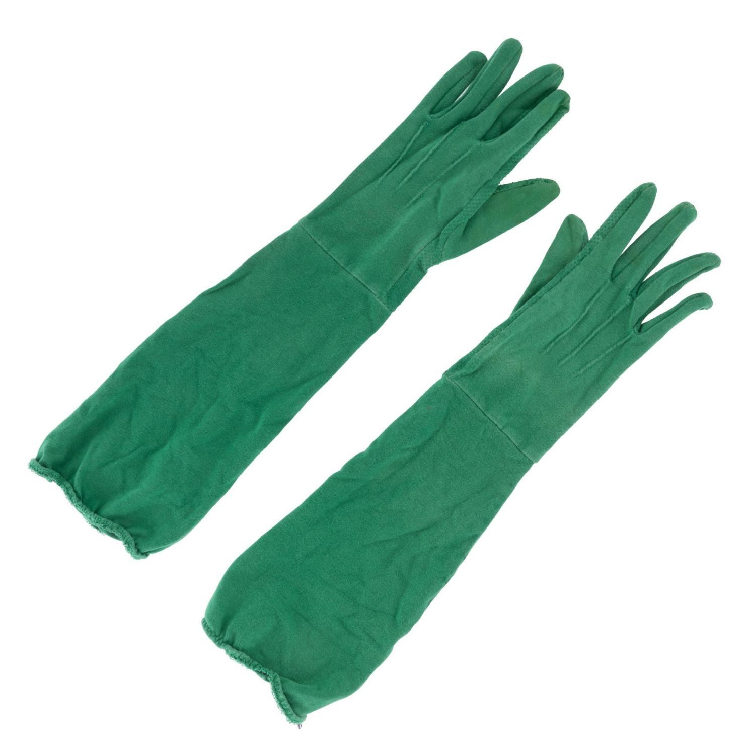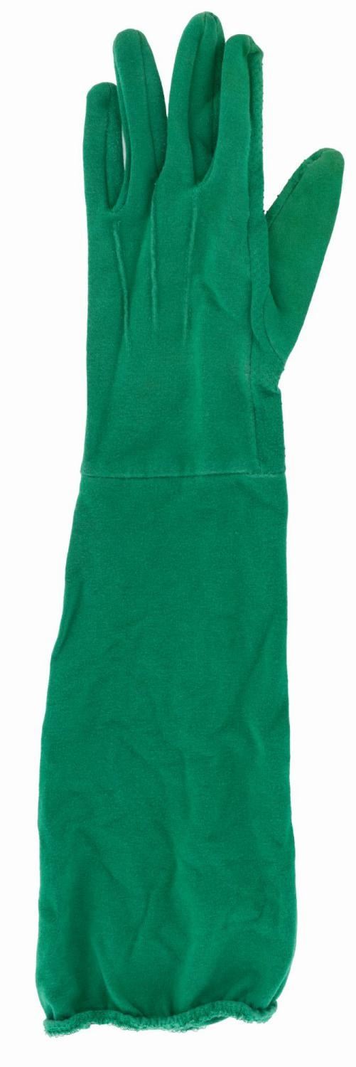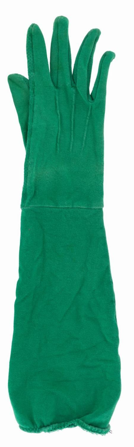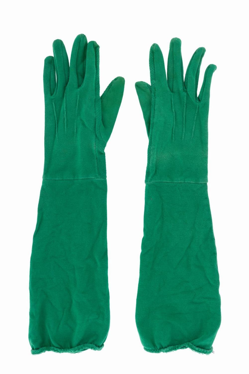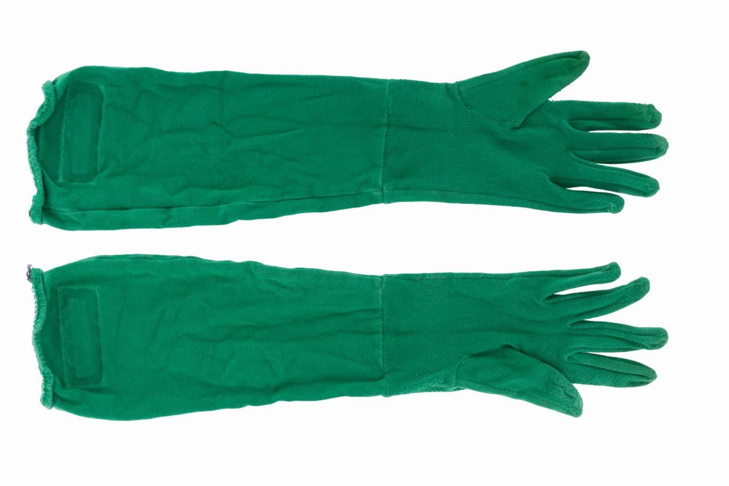 (Disney’s California Adventure, 2000s) A pair of “Toy Story” Green Army Man Cast Member gloves with Park Costume Department labels. The Green Army Patrol drummers entertain Guests throughout the Park and march with Sarge in Pixar-themed parades. Measuring 17” long, the gloves are in good condition with light discoloration and typical wear from Park use.Est. Opening Bid: $30.00