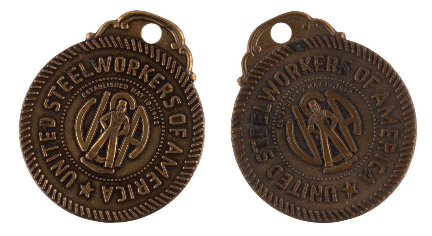 (Bastian Bros.Co., 1966) A pair of brass medallions from the seventh biennial conference of the United Steel Workers of America convention at Disneyland in April of 1966. Measuring 1.25” in diameter each, the medallions are in good to very good condition with light tarnish and scratches.