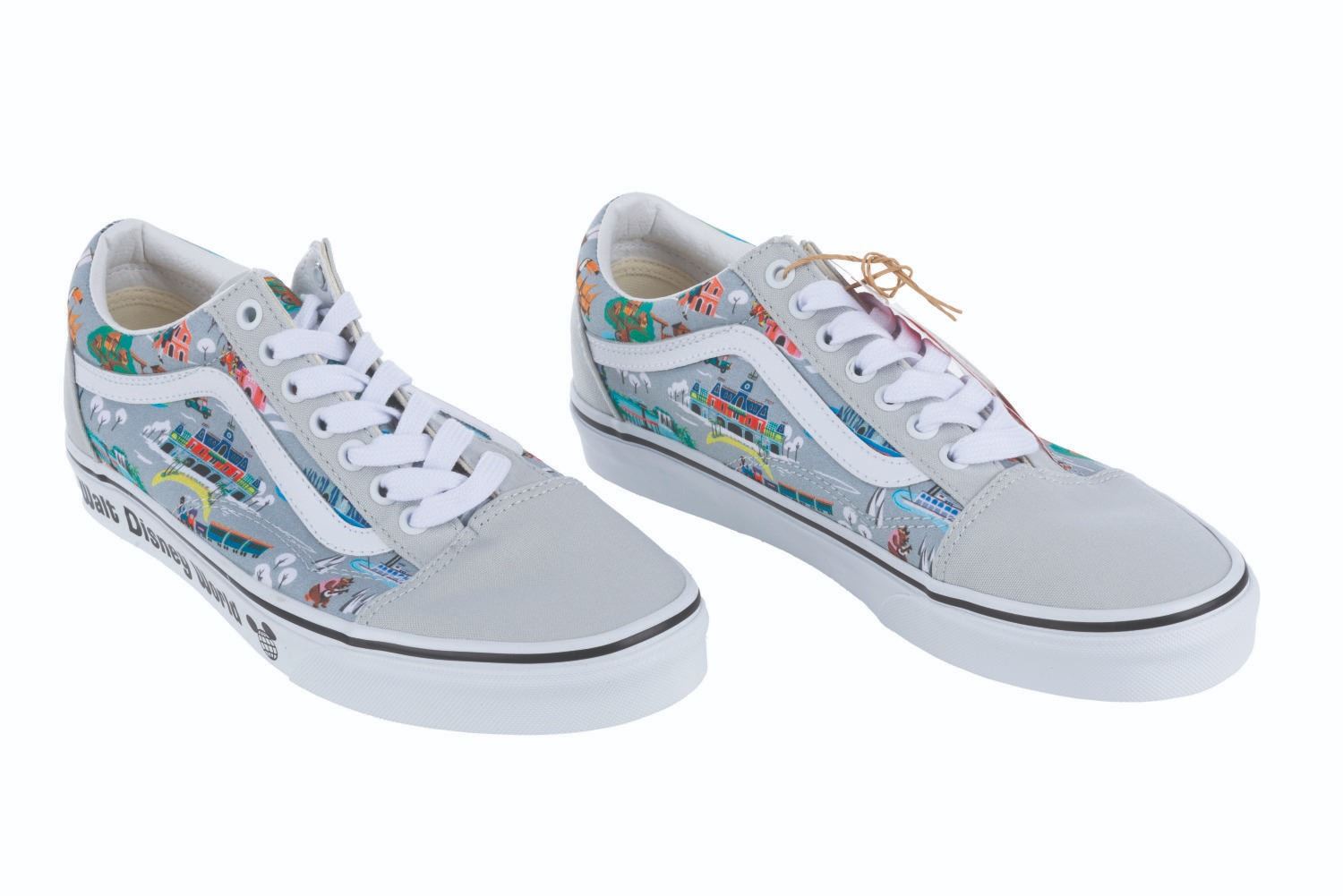 (Vans, 2022) A pair of Walt Disney World 50th anniversary Old Skool Vans sneakers patterned with Resort attractions. Labeled a size 8.0 US Men/ 9.5 women, the sneakers are in fine unused condition with the original tags and the original 12” x 5.75” x 4.75” box, in very good condition with minor wear.