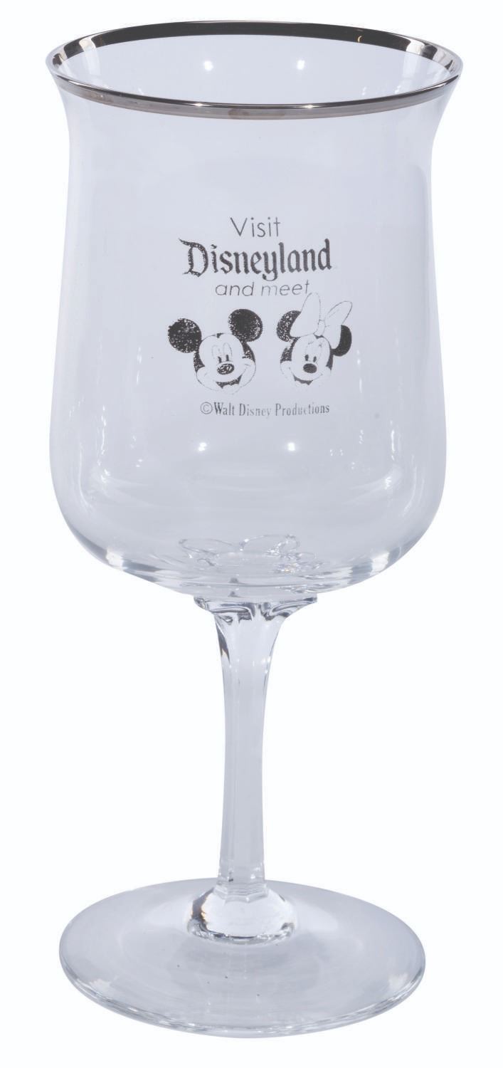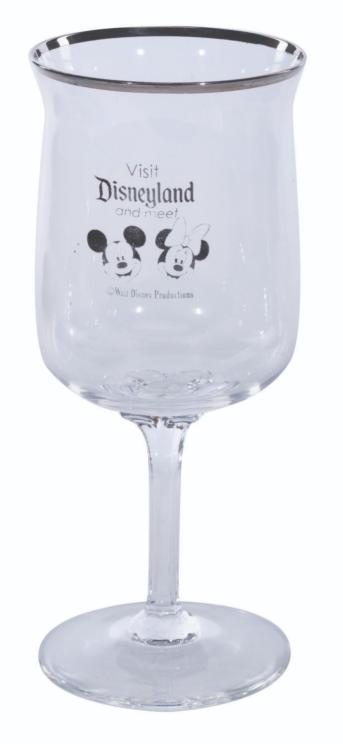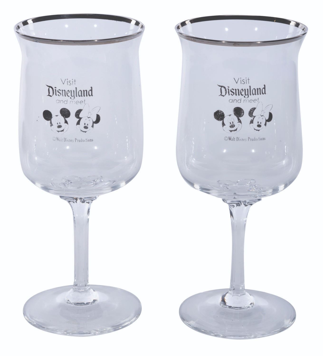(Disneyland, 1980s) A Pair of Visit Disneyland Water Glasses. The glasses feature a "Visit Disneyland and Meet" Mickey and Minnie graphic, accented with silver-toned edging. Measuring 7.25" tall and 3" in diameter, each glass is in good condition with minor wear to the graphics.