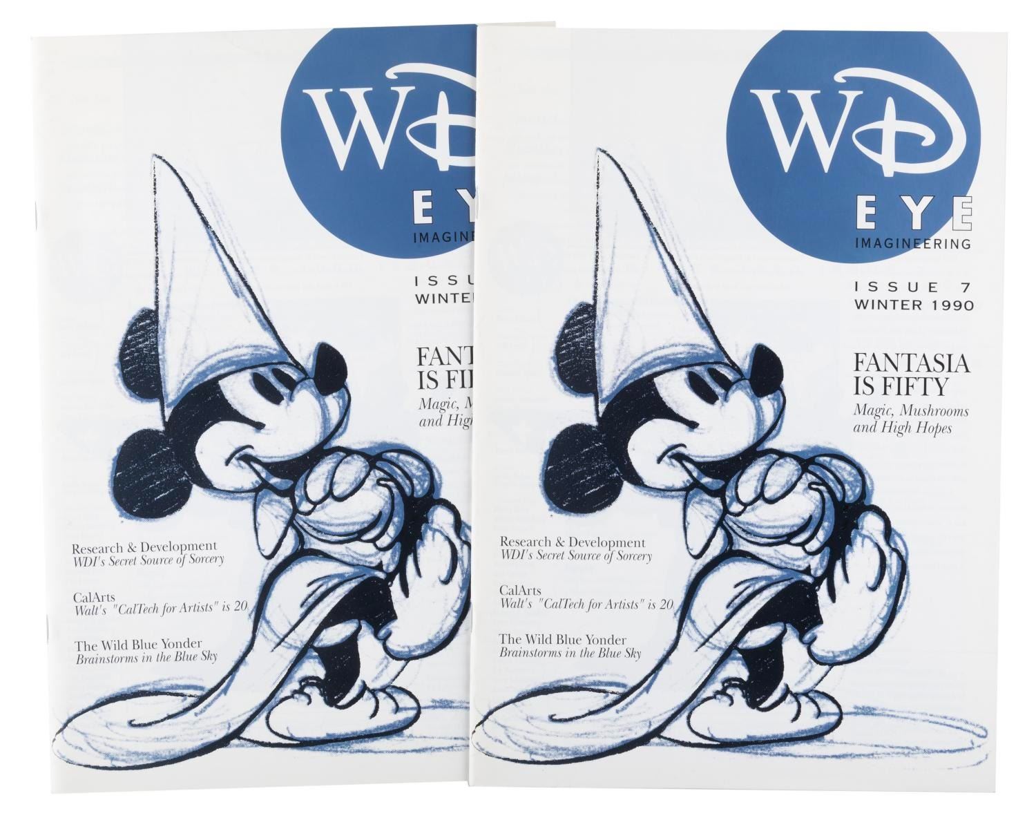 (WDI, 1990) Two copies of the Winter 1990 edition of WD Eye Imagineering, the in-house publication of Walt Disney Imagineering. Cover stories include Fantasia’s 50th anniversary, Research & Development, and Cal Arts. The magazines are in very good condition with light handling wear.