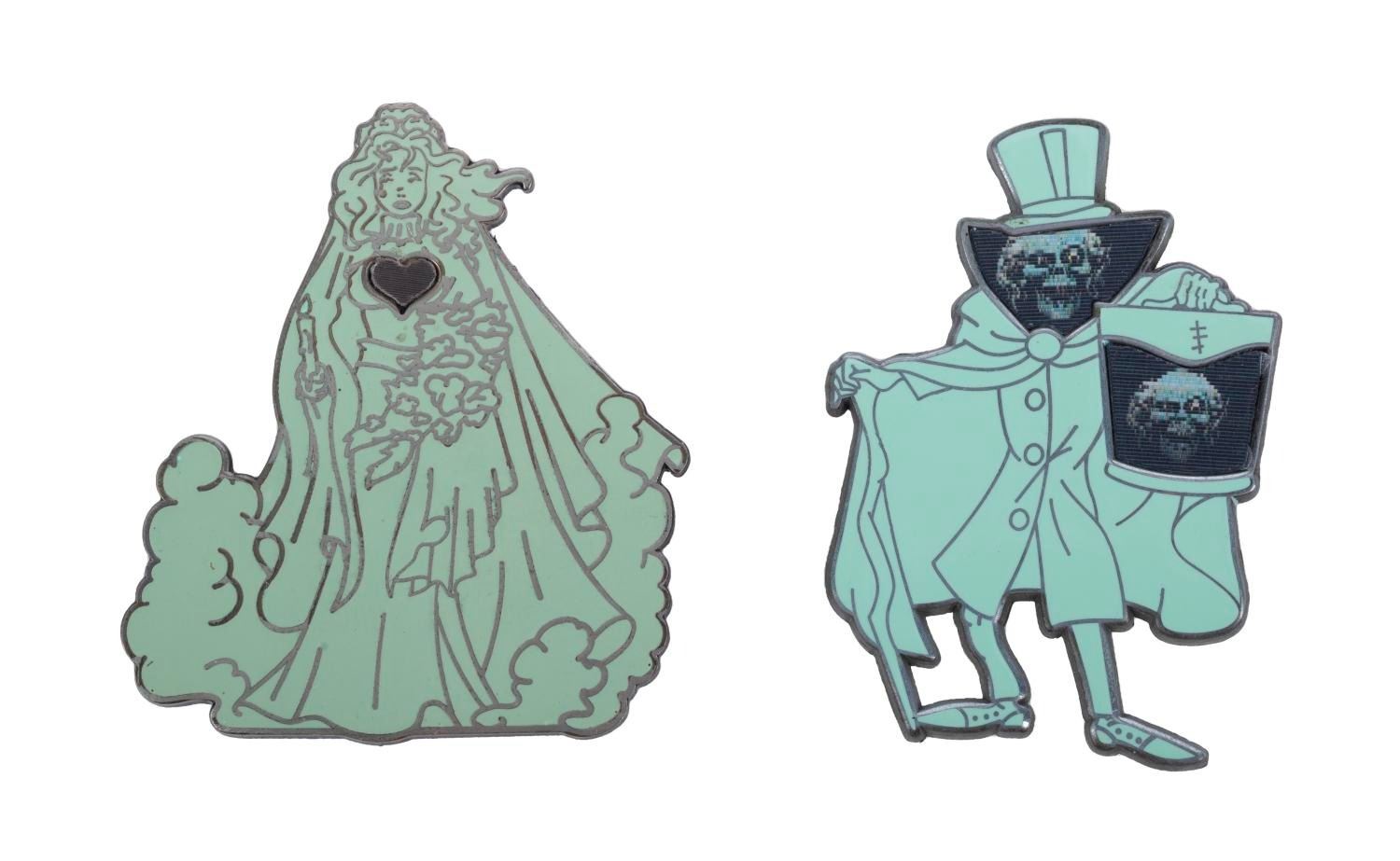 (WDI, 2000s) A rare pair of Walt Disney Imagineer Exclusive Haunted Mansion Lenticular Pins. This set includes the 2009 Hatbox Ghost (LE300) with “disappearing” head and Constance The Bride (LE300) with “beating” heart. Each pin is in fine condition with minor wear to its elements.