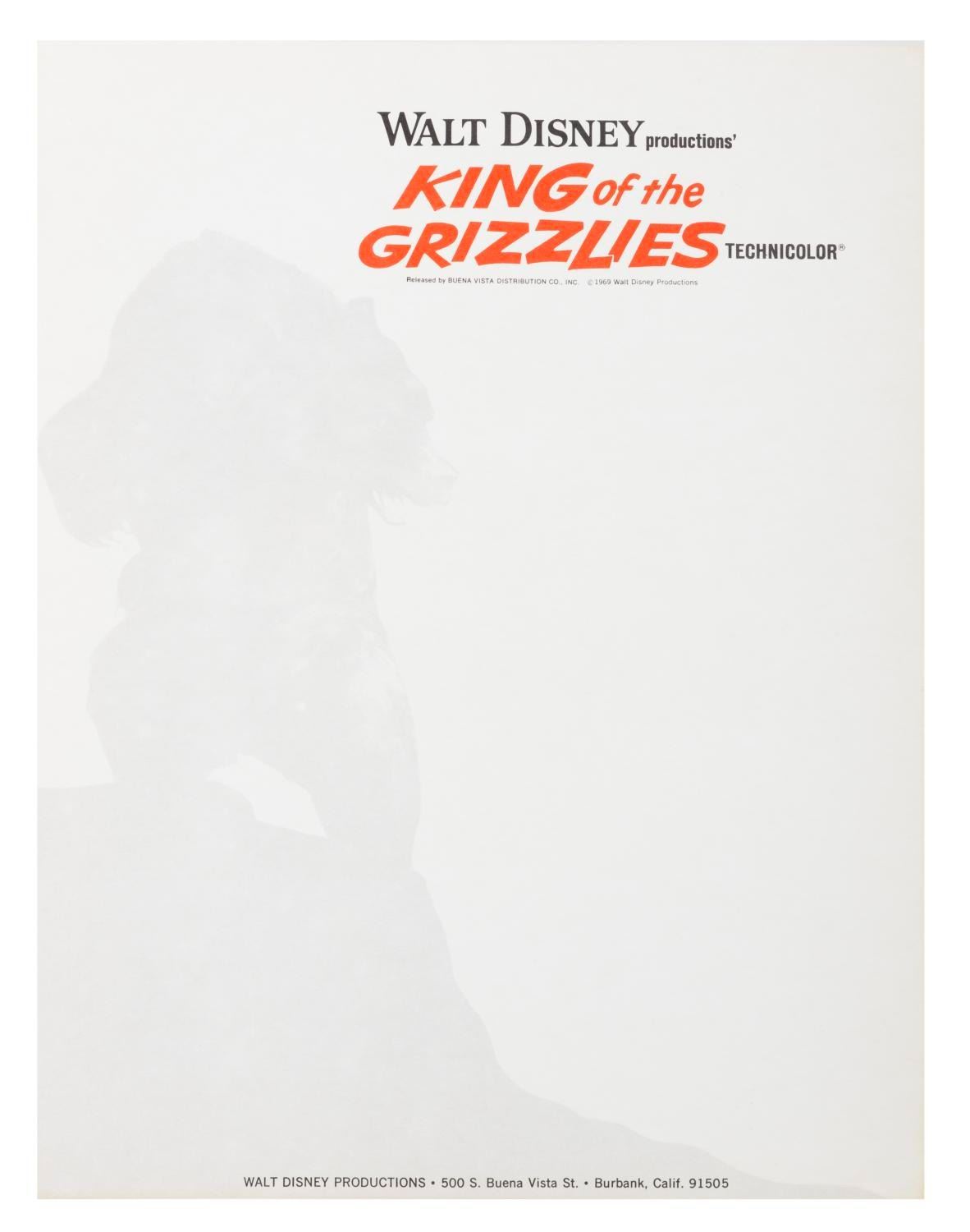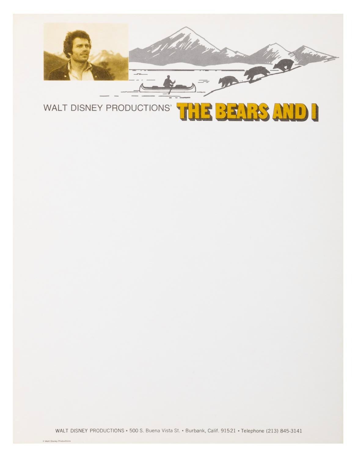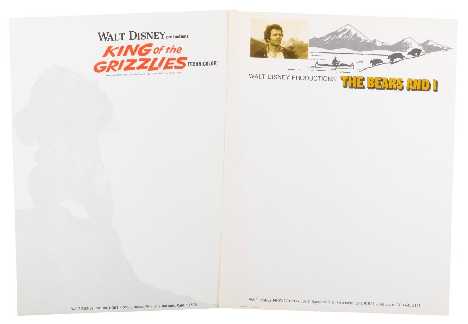 (Disney, 1970/74) A pair of stationery pages for the films "King of the Grizzlies" and "The Bears and I," created and used only for correspondences during production. Measuring 8.5" x 11" each, the pages are in fine condition.