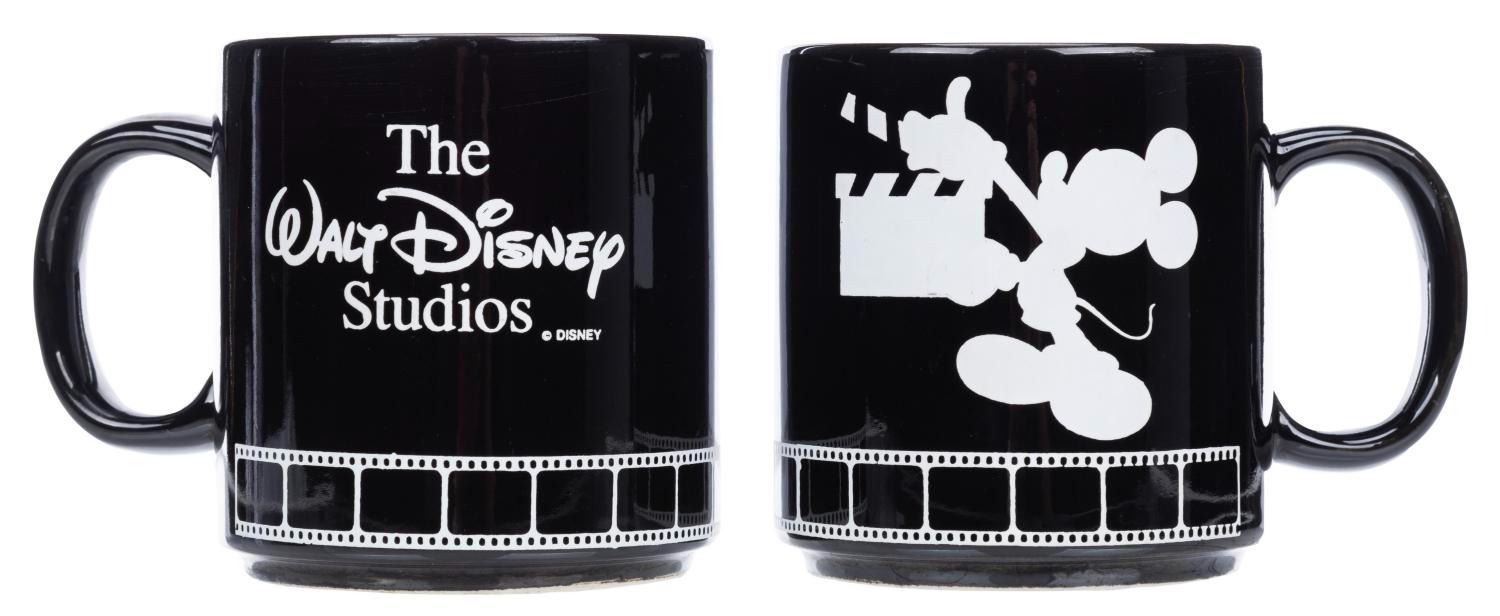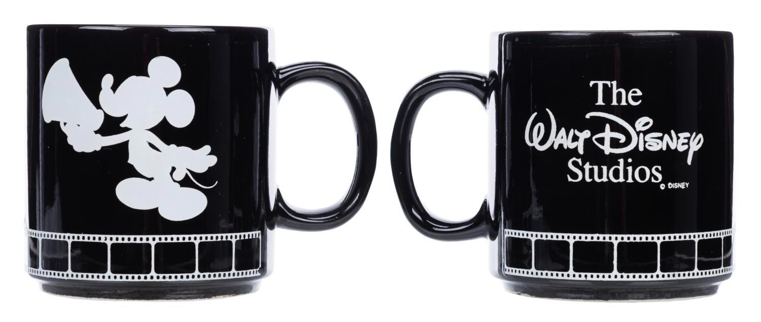 (Disney, 1980s-90s) A pair of ceramic Walt Disney Studios coffee mugs featuring a silhouette of Mickey holding a clapperboard. Measuring 3.25” in diameter and 3.5” tall each, the mugs are in good condition with spotting, scratches, and wear.