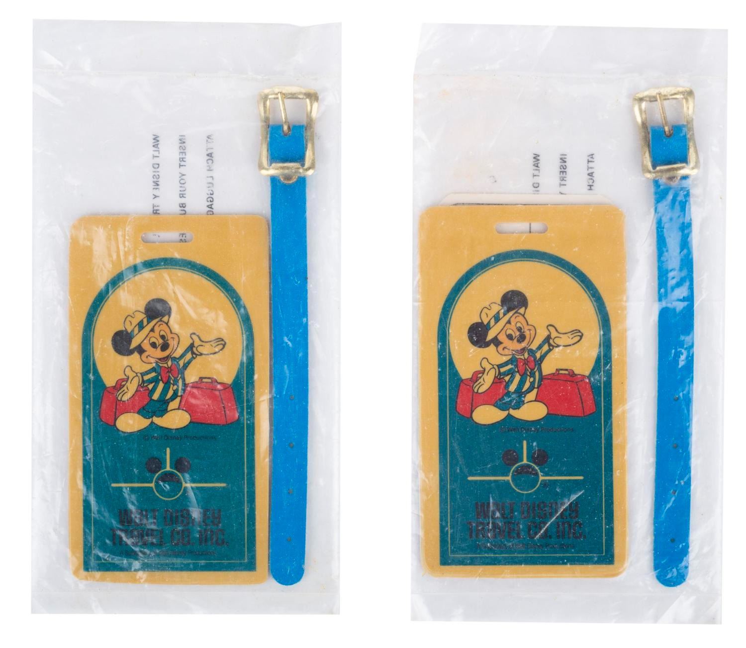 (Disney, 1987) A pair of Walt Disney Travel Company Mickey Mouse luggage tags, with ID card and strap. Measuring 2.25" x 4", the unopened tags are in very good condition, showing only handling wear to the wrappers, and color shift from age.