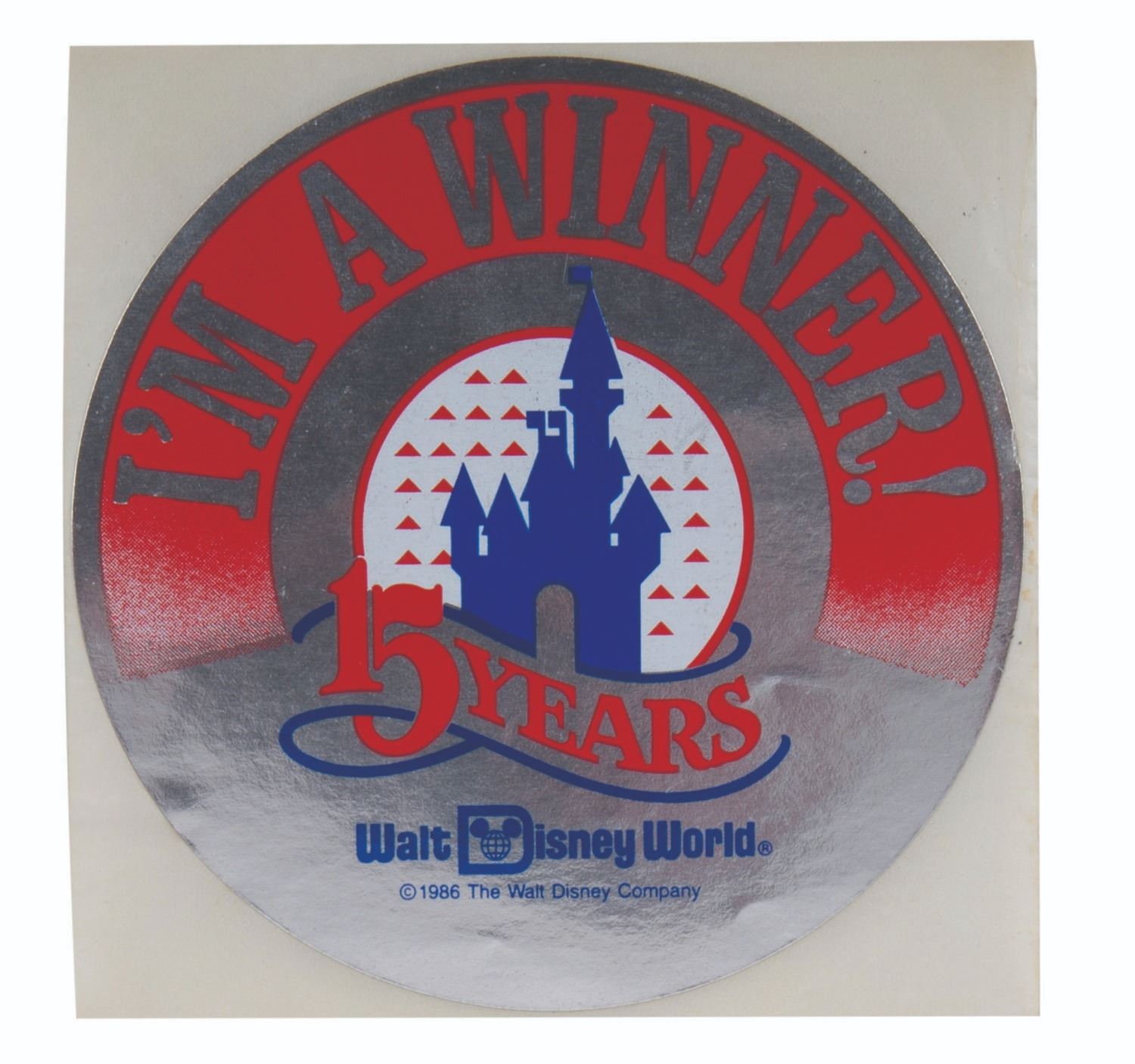 (Walt Disney World, 1986-87) An "I'm A Winner" sticker and a bumper sticker, each commemorating 15 years of Walt Disney World. Measuring 13.75" x 2.75" and 4" in diameter, the unused stickers are in fine condition with their wax paper backings.