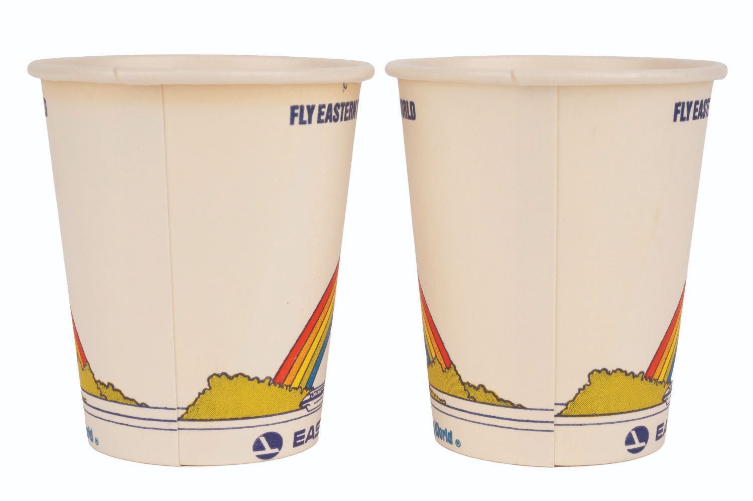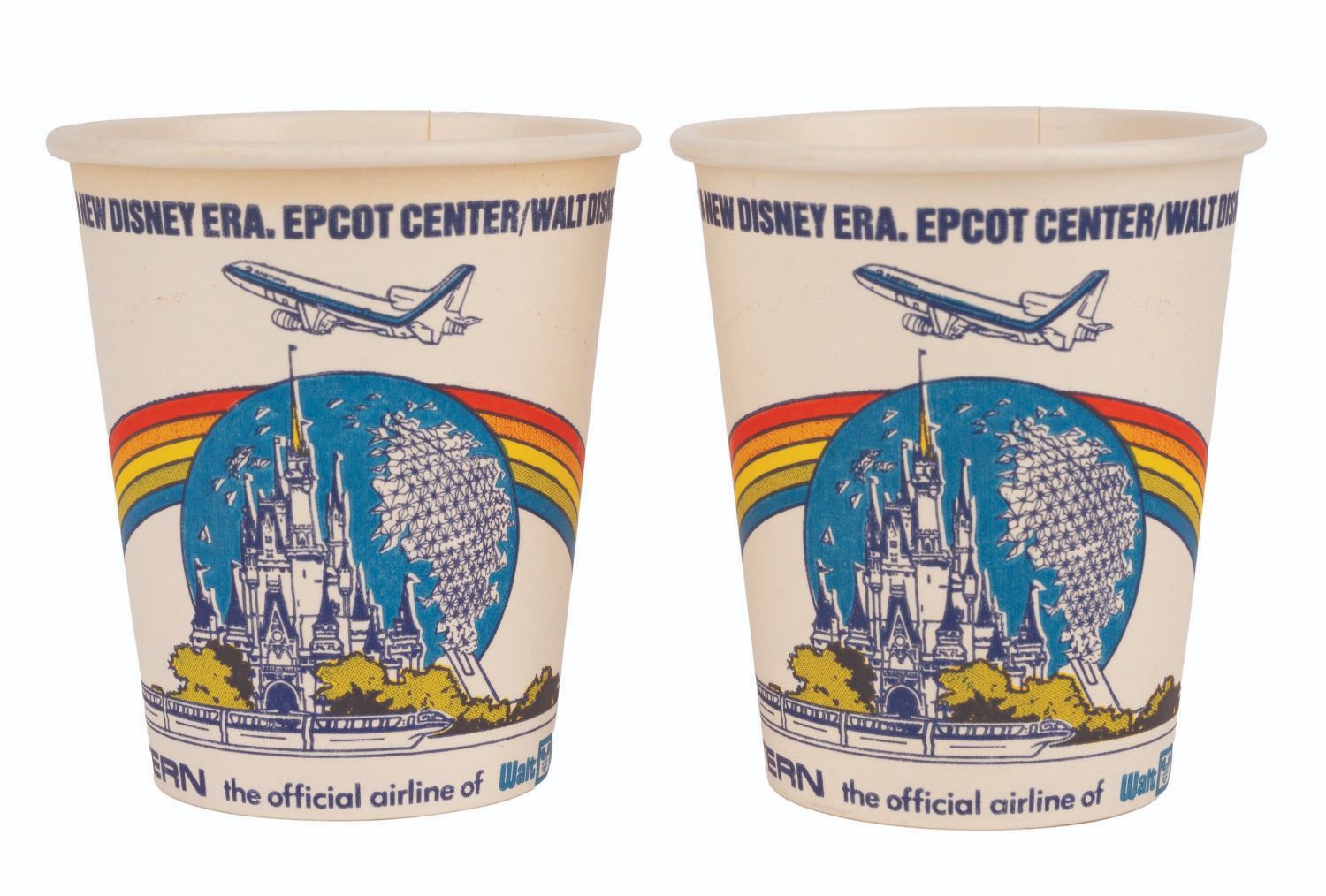 (Walt Disney World, 1970s) A pair of 1970s disposable paper cups from Eastern Airlines, the official airline partner of Walt Disney World at the time. Measuring 3" in diameter and 3" tall each, the cups are in very good condition with a small band of discoloration to the lip of one cup, and light handling wear.
