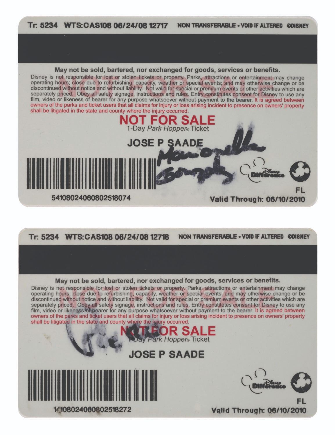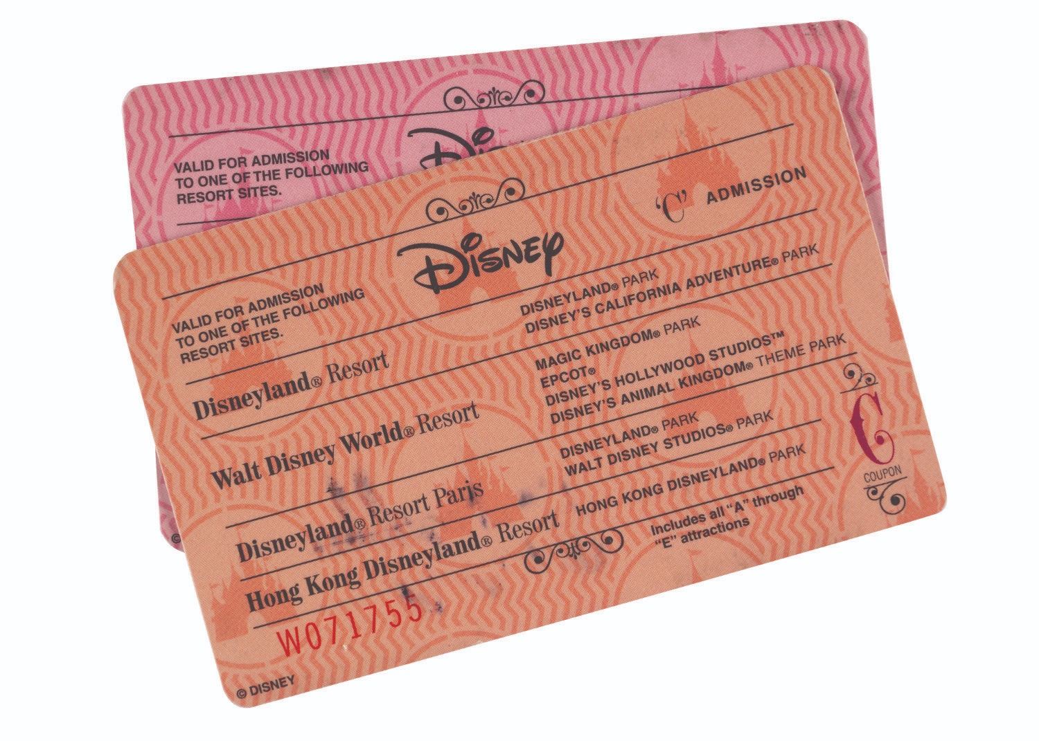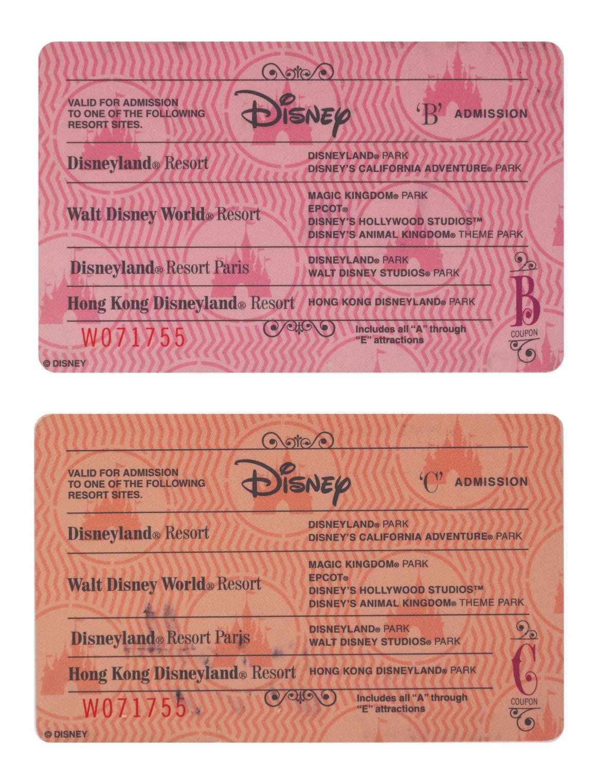 (Walt Disney World, 2010) A Pair of Walt Disney World Park Hopper Cards. This pair of 1-day Park Hopper Admission Cards are in the character of vintage “B” and “C” admission coupons and were once valid for Disneyland Resort, Walt Disney World Resort, Disneyland Resort Paris, and Hong Kong Disneyland Resort. Measuring approximately 3.25”x2.25”, each commemorative ticket is in very good condition with a few scuffs and minor wear.