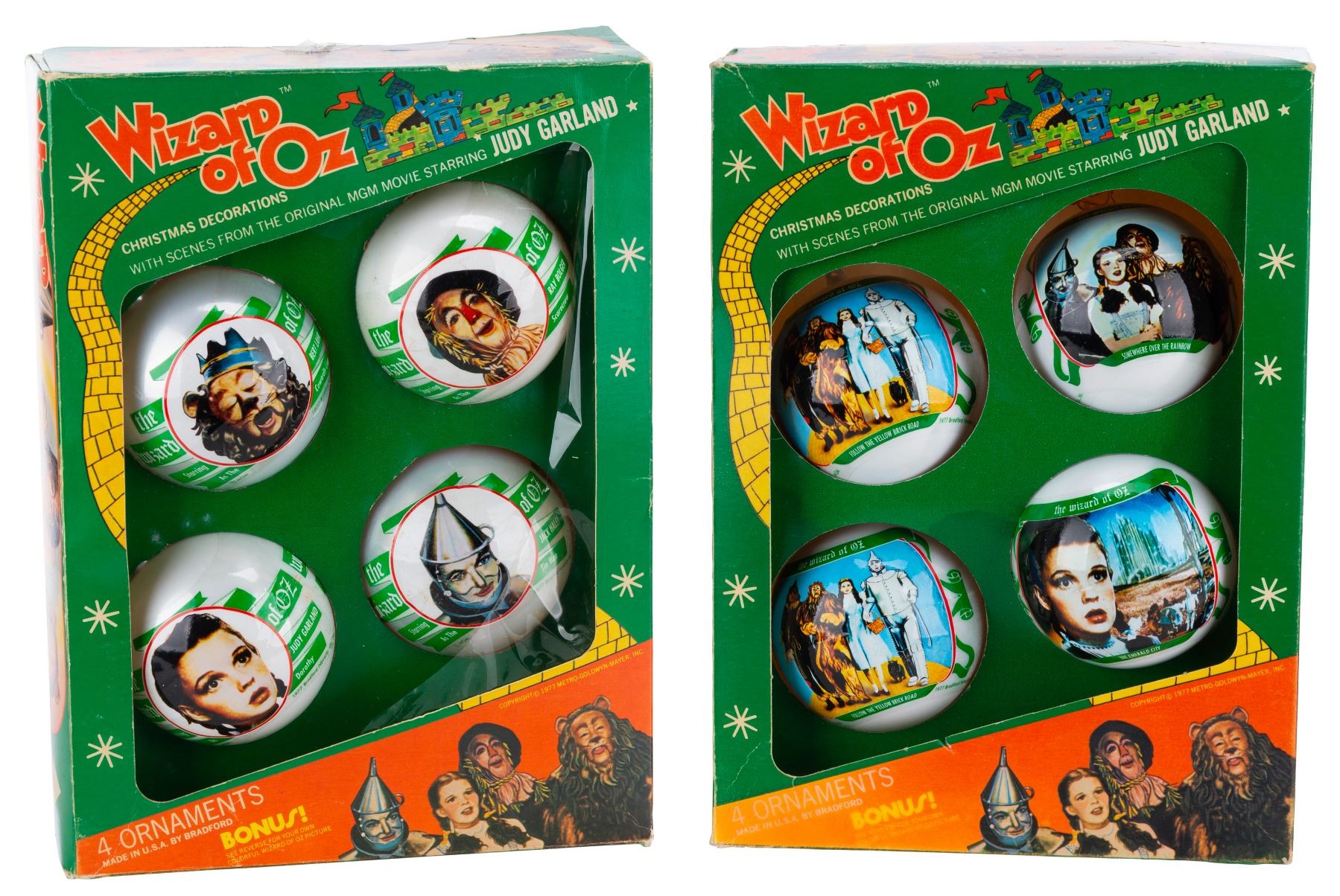 (Bradford, 1977) A pair of "The Wizard of Oz" ornament sets by the Bradford Novelty Company, each with four ornaments featuring imagery from the film. Measuring 2.75" in diameter, the ornaments come packaged in 10" x 7.25" x 2.5" window boxes and are in fair to good condition with spots of discoloration, cracks, and wear.