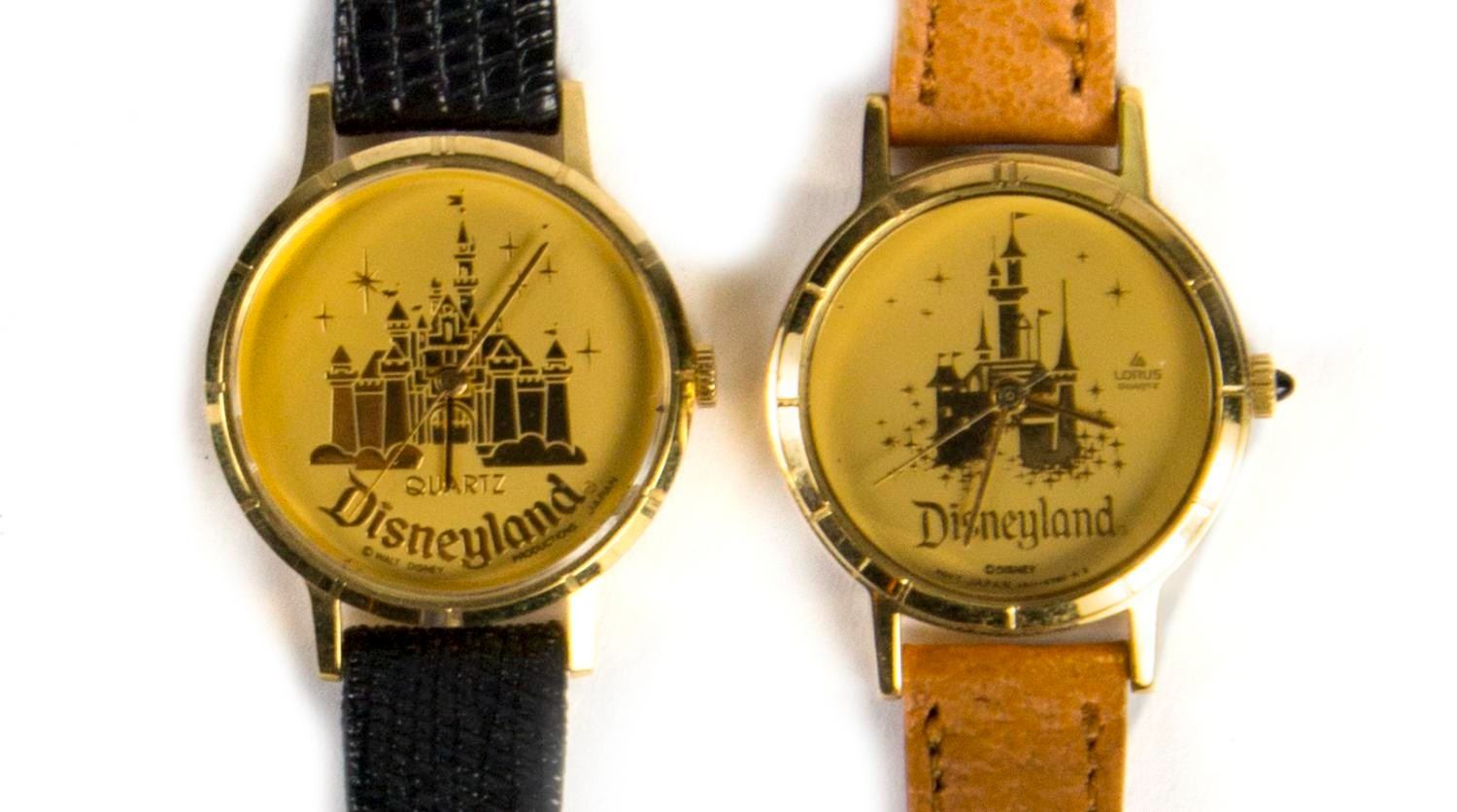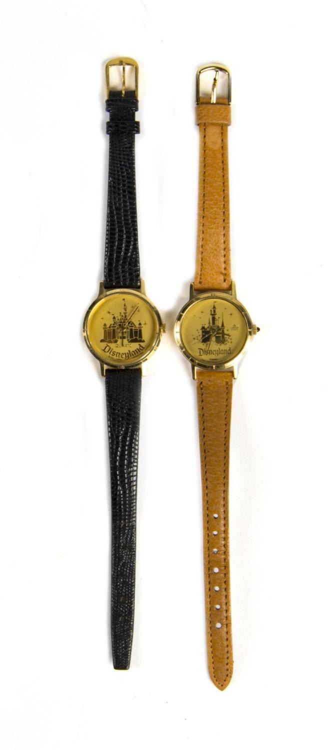 (Disneyland, 1980s) A pair of women's Disneyland wristwatches featuring Sleeping Beauty Castle. Measuring 8” long, the watches are in very good untested condition, with light wear and scratches on the reverse and requiring batteries and possibly service to function.