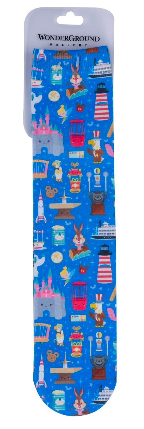 (Wonderground Gallery, 2000s) A pair of Kingdom of Cute socks designed by Jerrod Maruyama, featuring Jose from Walt Disney's Enchanted Tiki Room, Br’er Rabbit from Splash Mountain, and Eagle Sam from America Sings. Measuring 13.5" long, the soft polyester and spandex socks "fit most" and are in fine condition on their original card.