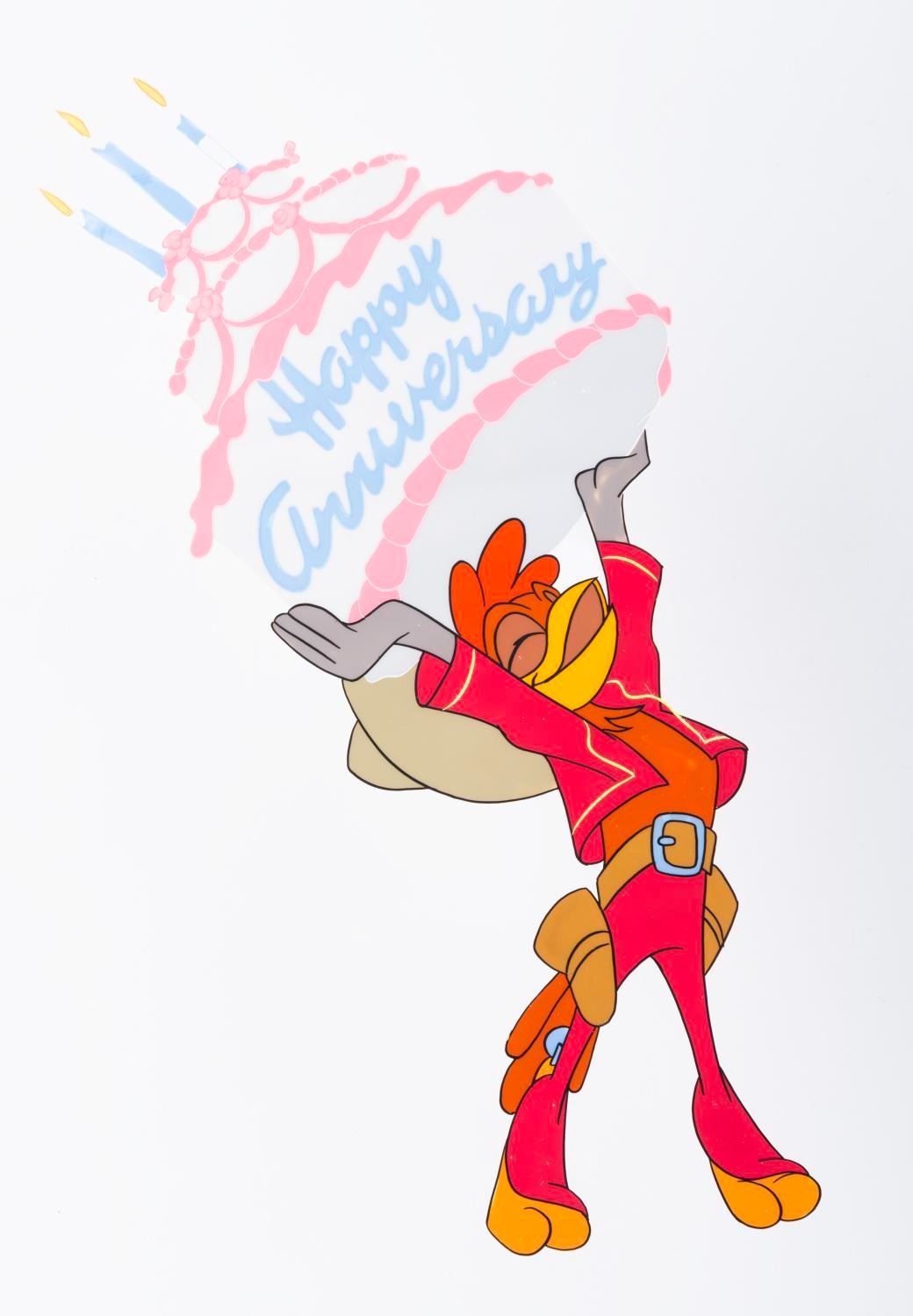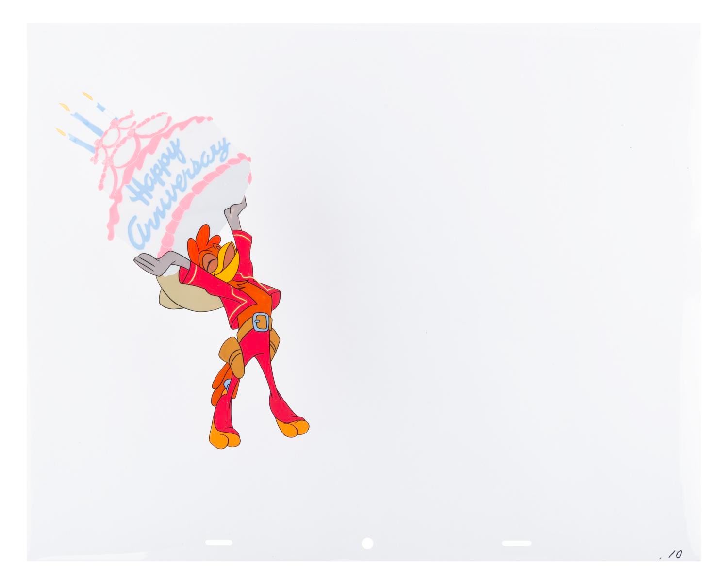 (Disney, 1960) An original hand-painted production cel of Panchito from the “The Magical World of Disney” episode “Donald’s Silver Anniversary.” With an image size of 5.5” x 8” on a 12.5” x 16” cel, the art displays in good condition with paint loss, scratches, wear, stains, and paper residue on the reverse, which is visible on the front between Panchito’s head and left arm.