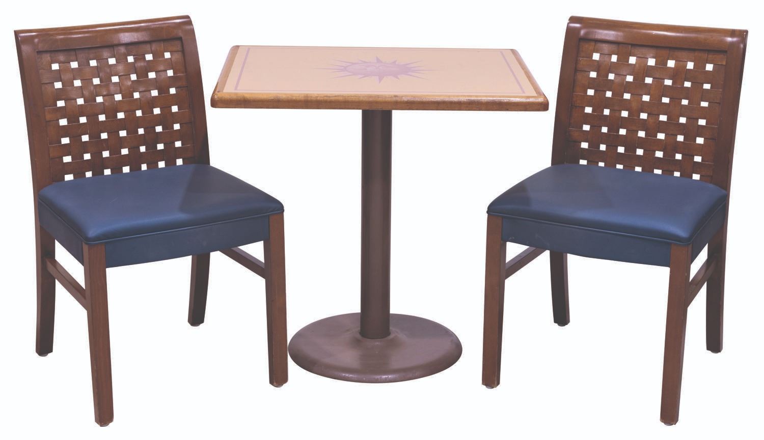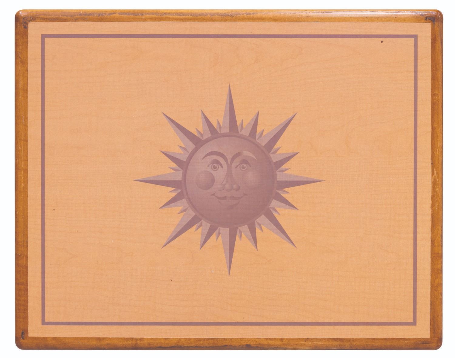 (Disney’s Paradise Pier Hotel, 2000s) A table and pair of chairs from Disney’s Paradise Pier Hotel. The table features a compass-style sun graphic and the chairs have woven wood backs. The table measures 30” x 23.75” x 29.75” and the chairs measure 19” x 17” x 33”. All are in good Hotel-used condition with typical light scratches and nicks and residue along the edges of the table.