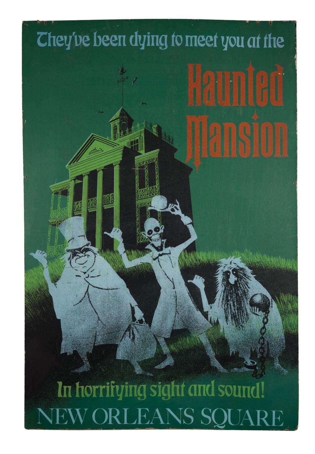 (Disneyland, 1969) A rare, original hand-silkscreened poster for The Haunted Mansion at Disneyland. Mounted on chipboard, this is one of a very few that survived being displayed in the park. Measuring 33.75"x53.5", the poster is in good park-used condition with scuffs and chips throughout and wear along all edges. Designed by Ken Chapman and Marc Davis, the poster spotlights the popular trio of the Hitchhiking Ghosts. Due to size, this item may require special shipping arrangements, please inquire for details and estimates before bidding.