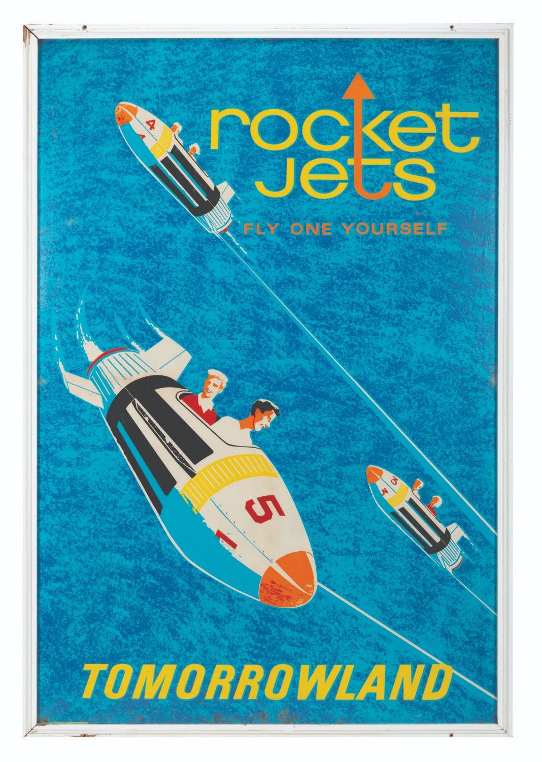 (Disneyland, 1967) A rare Park-used original hand-silkscreened poster for the Rocket Jets attraction. Designed by Ken Chapman, this poster borrows heavily from Bjorn Aronson's Astrojets poster design, which this attraction replaced. Measuring 36" x 54", this poster was mounted on board for display in the Park and framed in a thick white wood frame. The poster is in very good condition with light wear throughout. The frame is in fair condition with extensive wear and chipping from years of Park use.