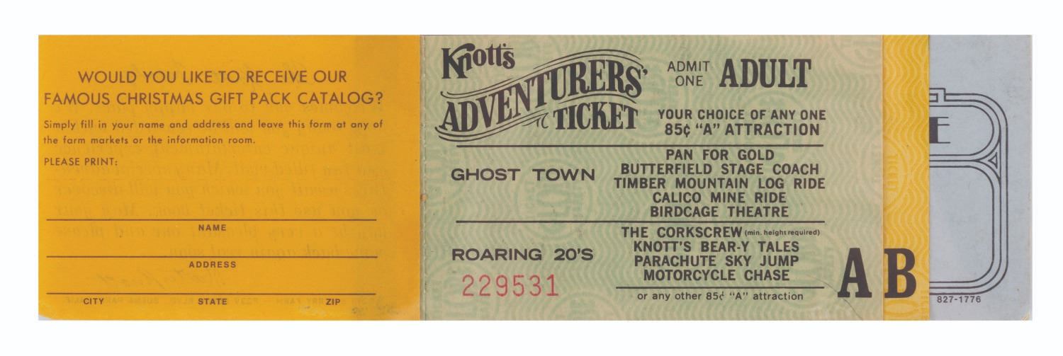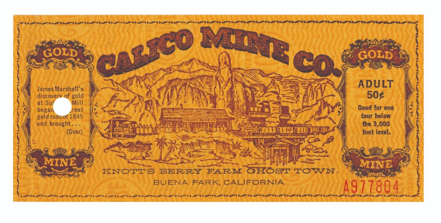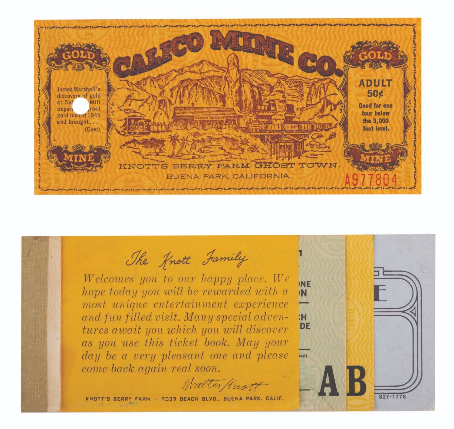 (Knott's, 1970's) A ticket book and Calico Mine Ride Ticket from Knott's Berry Farm. The ticket book includes (3) A tickets and (2) B tickets for attractions in the Ghost Town, Fiesta Village, and Roaring 20's areas of the Park. Measuring 2.5"x6", the ticket book and 2.5"x5.75" Mine ticket are in very good condition, with the Mine ticket punched to cancel it when used.