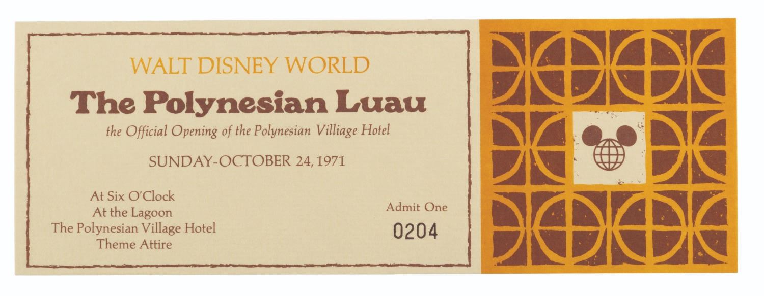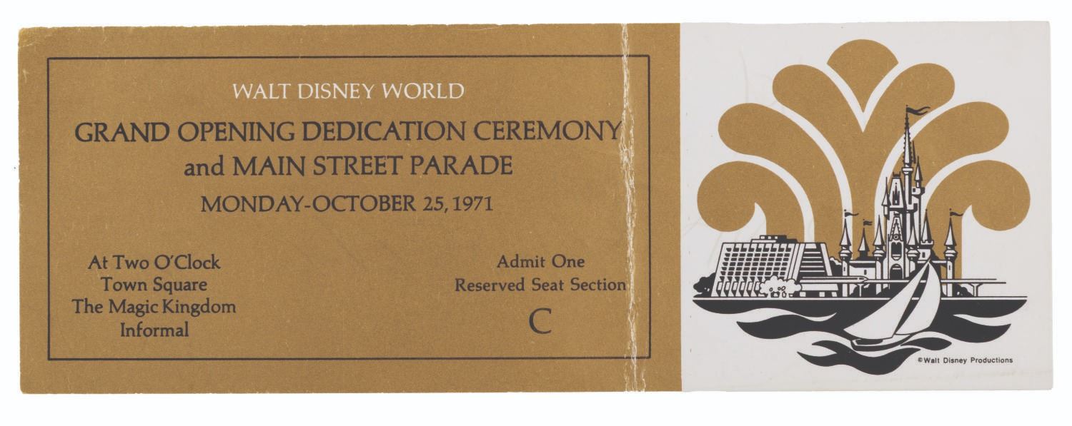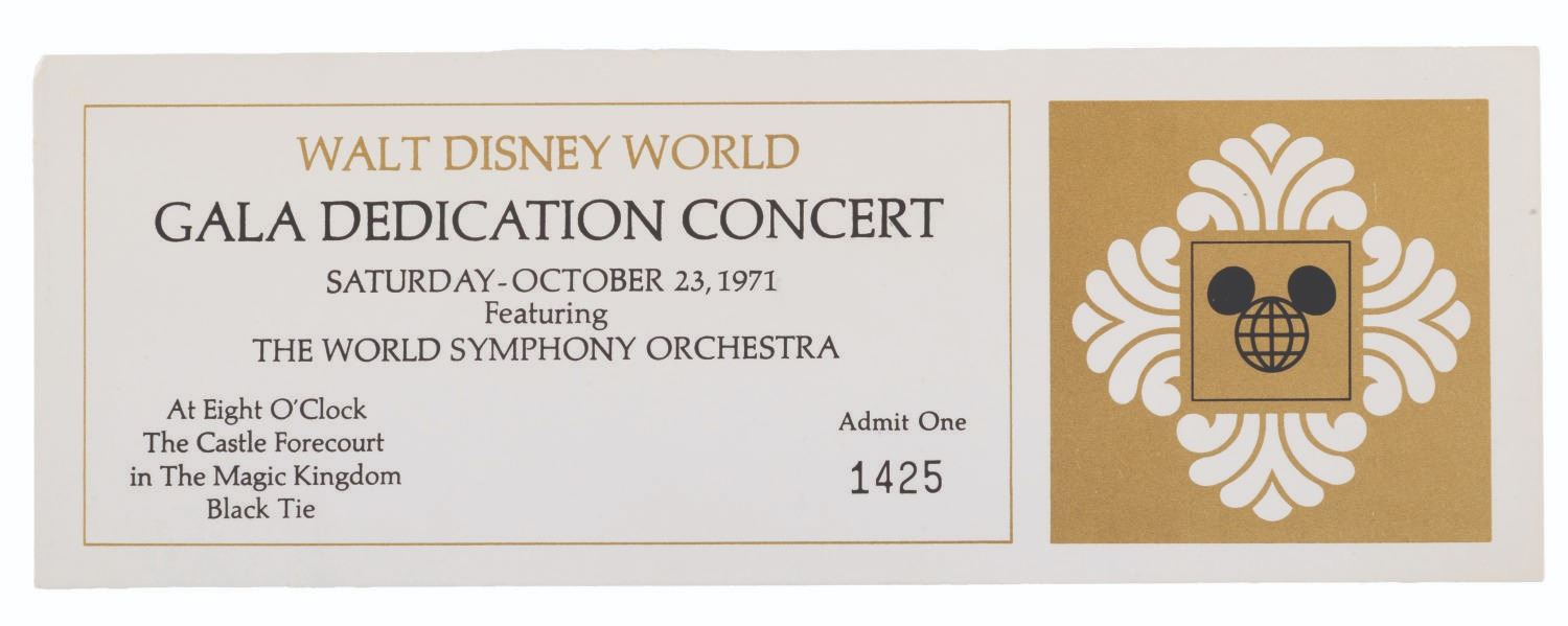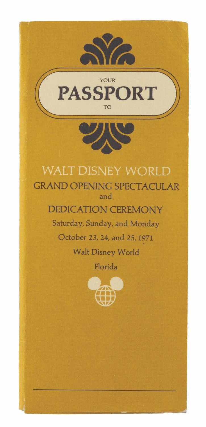 (Walt Disney World, 1971) A passport for the Grand Opening events for Walt Disney World on October 23, 24, and 25 of 1971. The folder contains three pockets holding tickets for events. For the 23rd, there are two tickets to the Gala Dedication Concert. For the 24th, there are two tickets each for the Contemporary Resort lunch buffet and Polynesian Luau dinner. For the 24th, a single ticket for the Grand Opening Ceremony on Main Street U.S.A. The 3.5" x 8.5" passport folder is in very good condition with light handling wear. The 3" x 8" tickets are overall in fine condition, with the Grand Opening Ceremony ticket in fair condition with handling wear, a vertical fold, and writing in ink on the back.