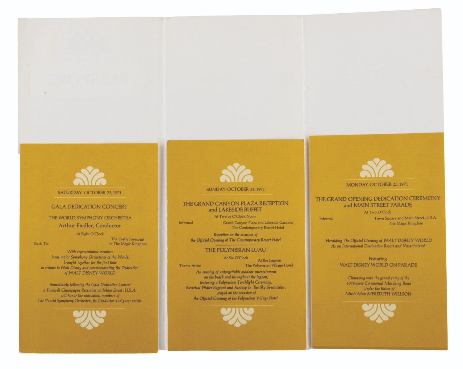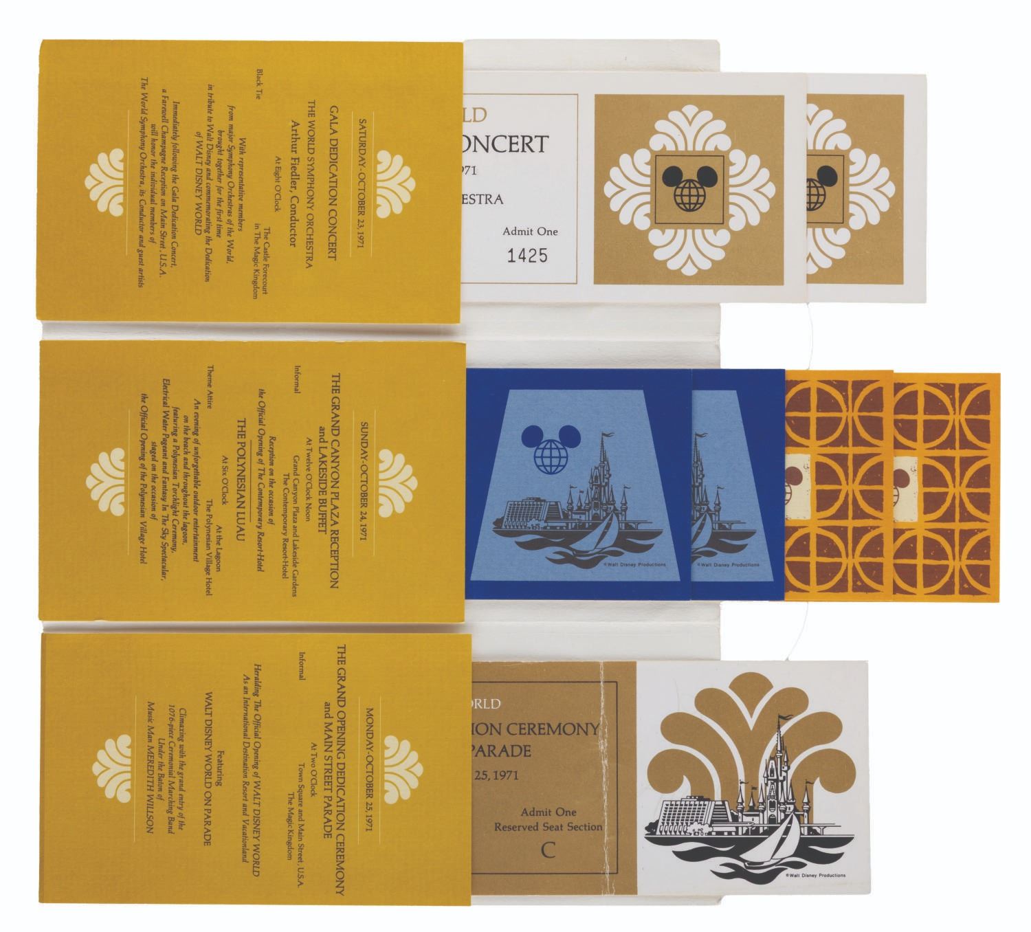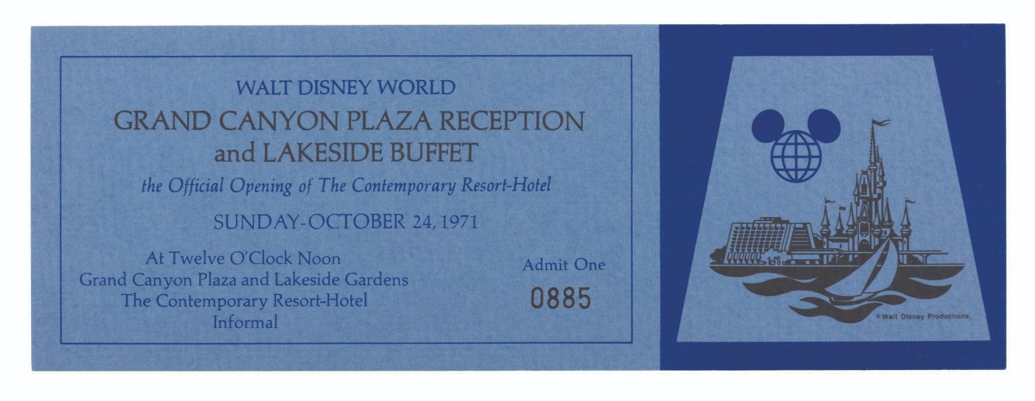 (Walt Disney World, 1971) A passport for the Grand Opening events for Walt Disney World on October 23, 24, and 25 of 1971. The folder contains three pockets holding tickets for events. For the 23rd, there are two tickets to the Gala Dedication Concert. For the 24th, there are two tickets each for the Contemporary Resort lunch buffet and Polynesian Luau dinner. For the 24th, a single ticket for the Grand Opening Ceremony on Main Street U.S.A. The 3.5" x 8.5" passport folder is in very good condition with light handling wear. The 3" x 8" tickets are overall in fine condition, with the Grand Opening Ceremony ticket in fair condition with handling wear, a vertical fold, and writing in ink on the back.