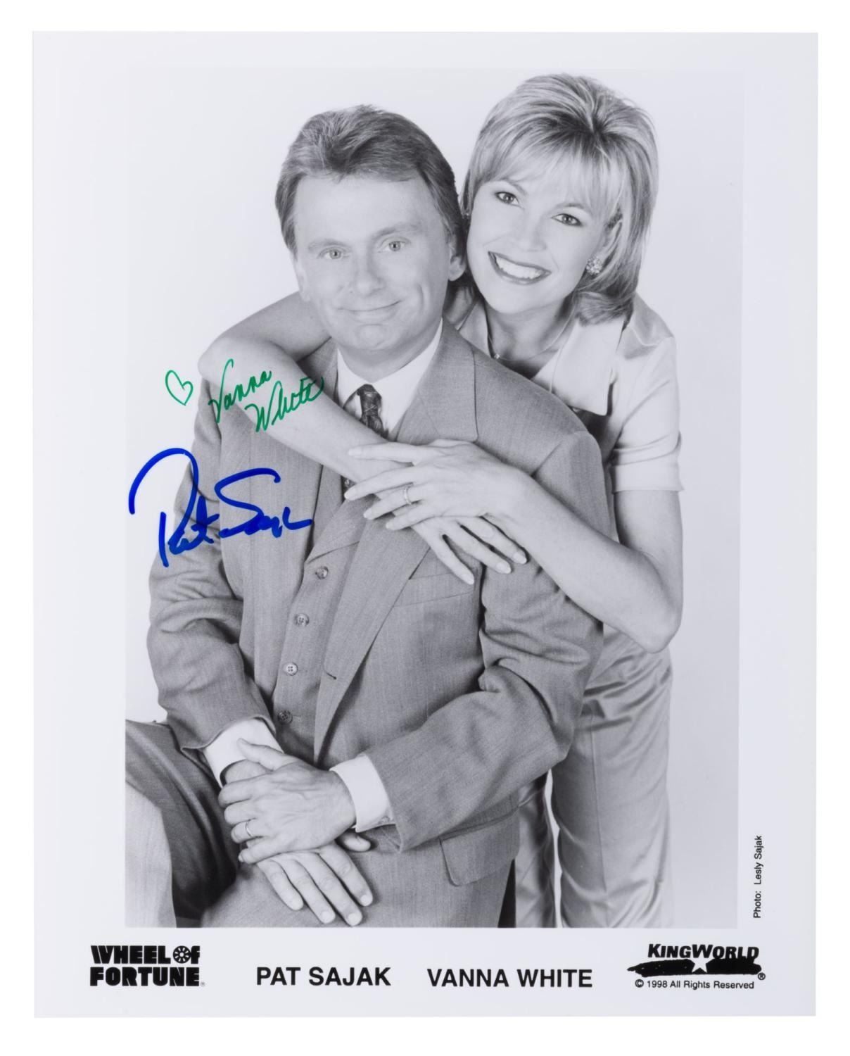(King World, 1998) A publicity photo for "Wheel of Fortune" signed by the hosts Pat Sajak and Vanna White. Measuring 8" x 10", the photo is in fine condition.