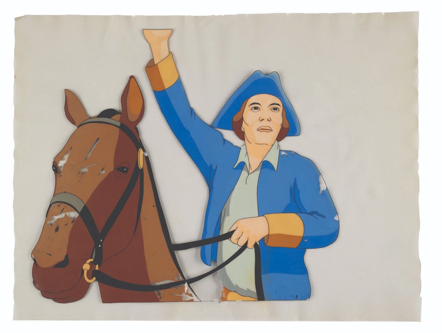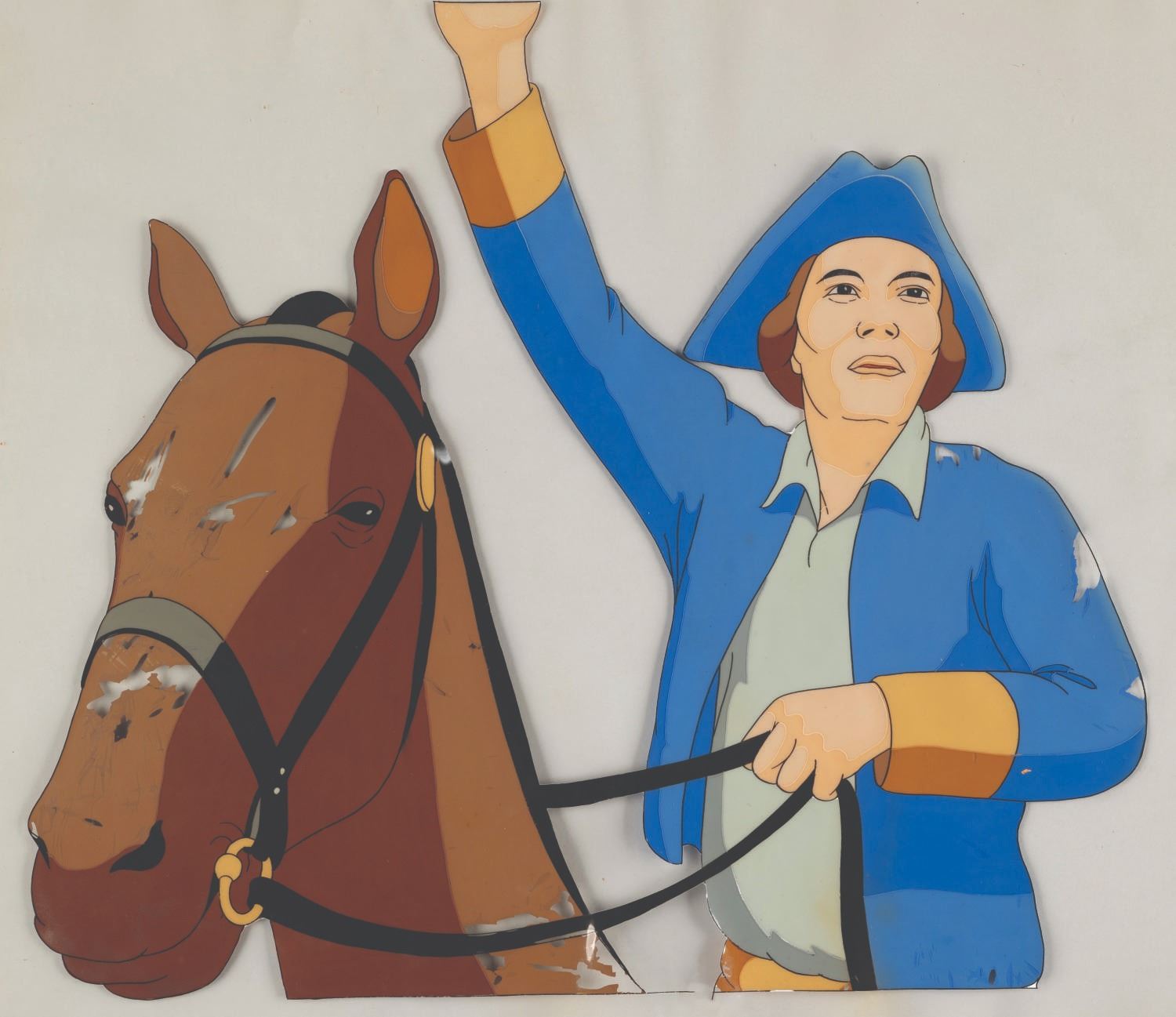 (Schlesinger, 1939) An original hand-painted production cel of Paul Revere from “Old Glory.” The patriotic short, directed by Chuck Jones, features Uncle Sam teaching Porky Pig about U.S. history and why he should learn the Pledge of Allegiance. With a character image size of 8” x 9” on a 9” x 11.75” cel, the piece is in fair condition with heavy paint loss, scratches, and warping.