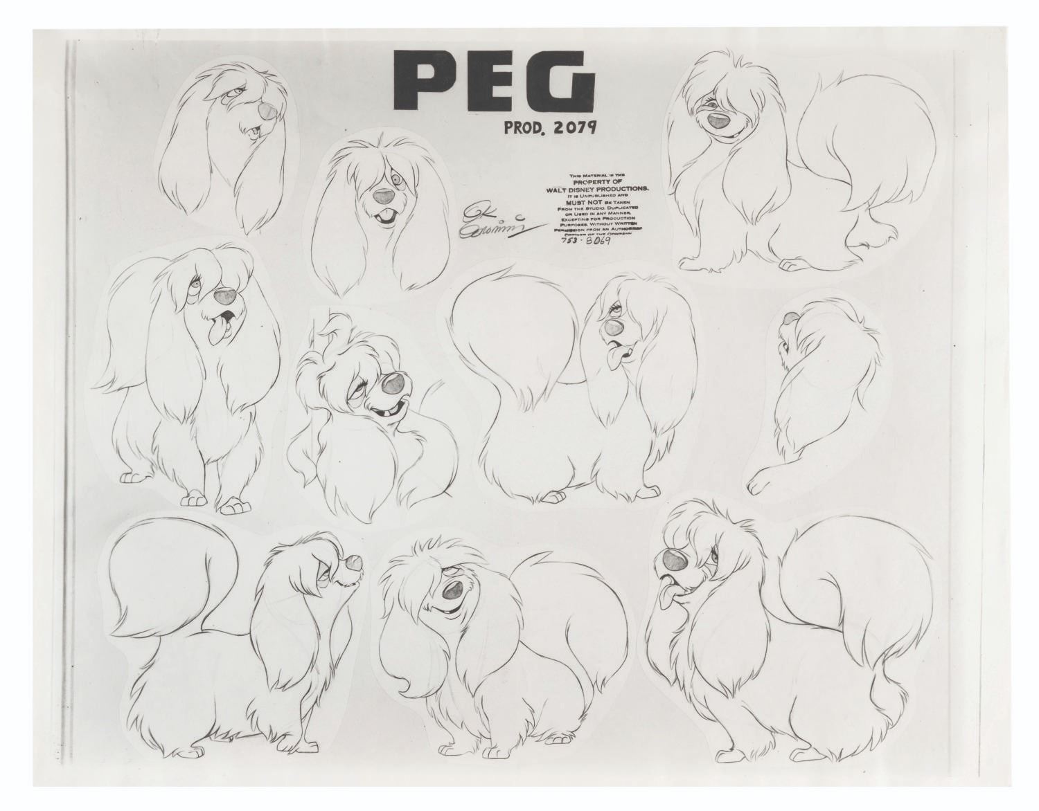 (Disney, 1955) A production used photostat model sheet of Peg from “The Lady and the Tramp.” Model sheets such as these were distributed to animators and crew working on the film to ensure character design continuity. The 11” x 14” model sheet is in very good condition with light wear from production use.