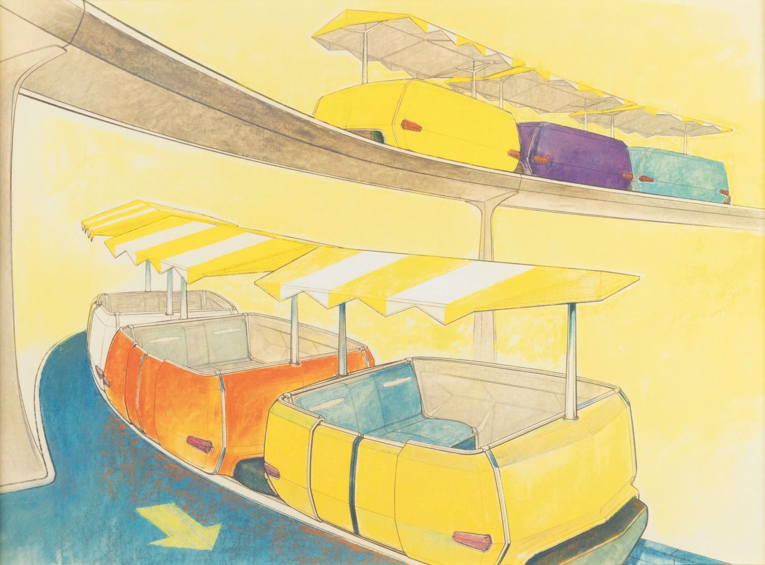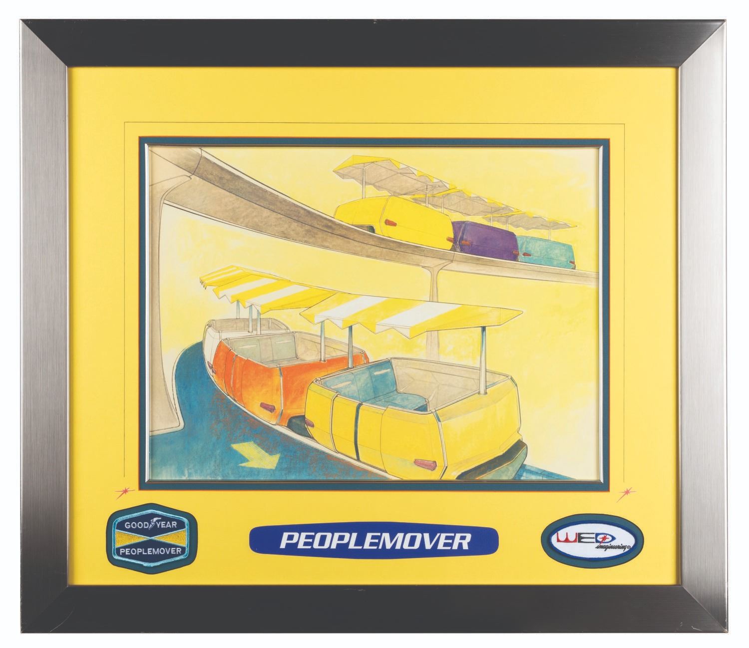 (Disneyland, 1990s-2000s) A gorgeous framed print of concept art for the PeopleMover attraction in Tomorrowland. Included in the frame are two patches, one that reads “Goodyear PeopleMover” and one that reads “WED Imagineering.” With a 14” x 19” image size on a matte in a 25.75” x 29.5” frame, the print displays in fine condition with scratches, scuffs, and wear on the frame.