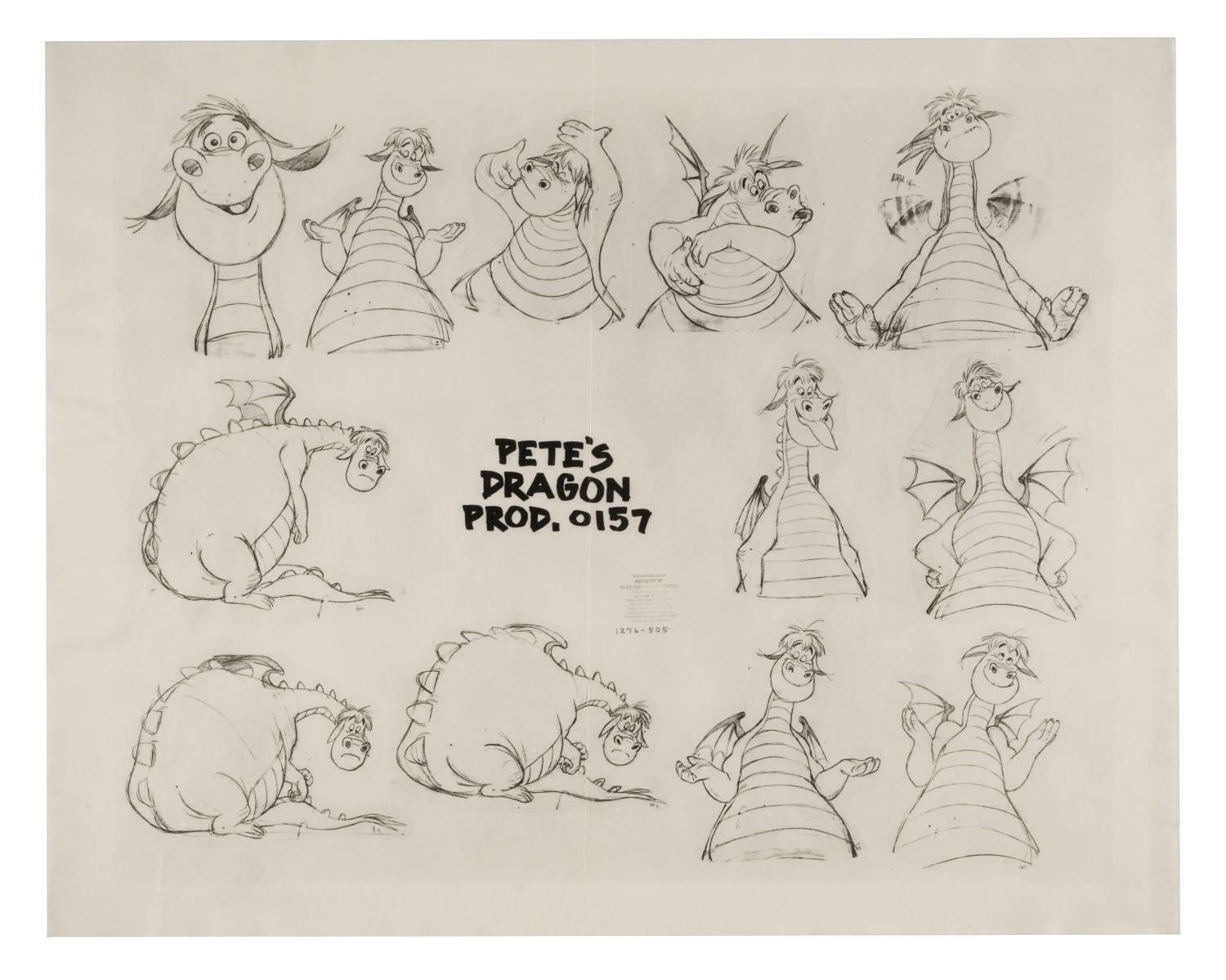 (Disney, 1977) A photographic model sheet of Elliott from Walt Disney's "Pete's Dragon." The sheet was used by animators during the film's production. Measuring 11"x14", the sheet is in very good condition, despite slight wear to edges and corners.