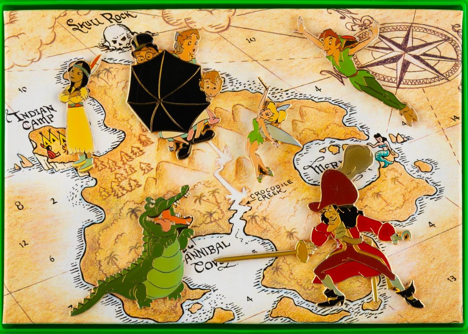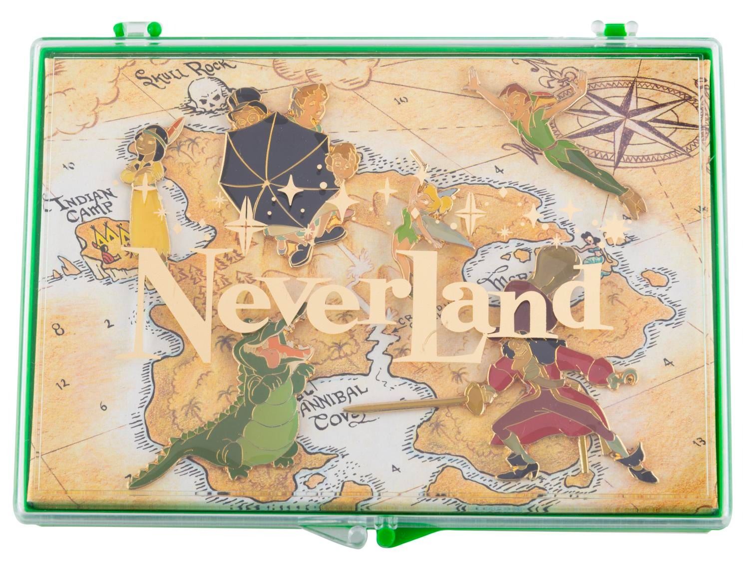 (Disney Store, 1993) A Never Land pin set for the 40th anniversary of "Peter Pan." Pins include Captain Hook, Pan, Tinker Bell, Tick-Tock, Tiger Lily, and the Darling children, displayed on a map of Never Land. The set is in fine condition with typical discoloration from age.