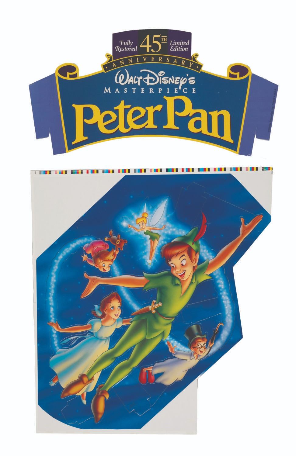 (Disney, 1998) A store standee for the limited edition release of the 1953 film "Peter Pan " on DVD. The kit includes a guide with assembly options to hold 24, 28, or 96 DVDs. Unassembled, the kit is in very good condition with light creases, tape residue, and wear, with partially-punched pieces.