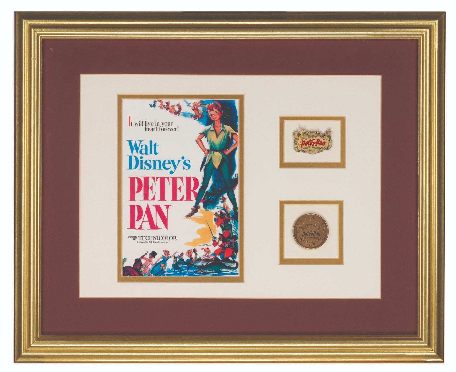 (Disney, 2003) A print, pin, and medallion framed by the Disney Gallery to celebrate the 50th anniversary of Walt Disney’s animated classic “Peter Pan." Measuring 18.25" x 22.25" overall, the piece displays in very good condition with very light wear to the frame from display.