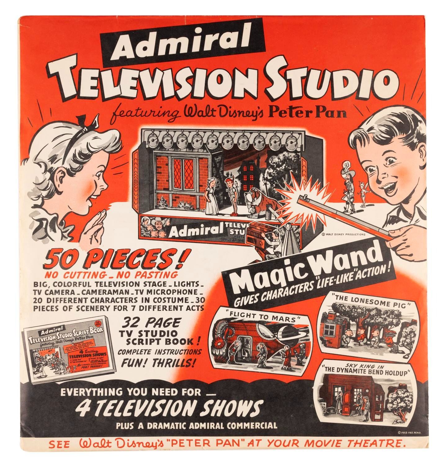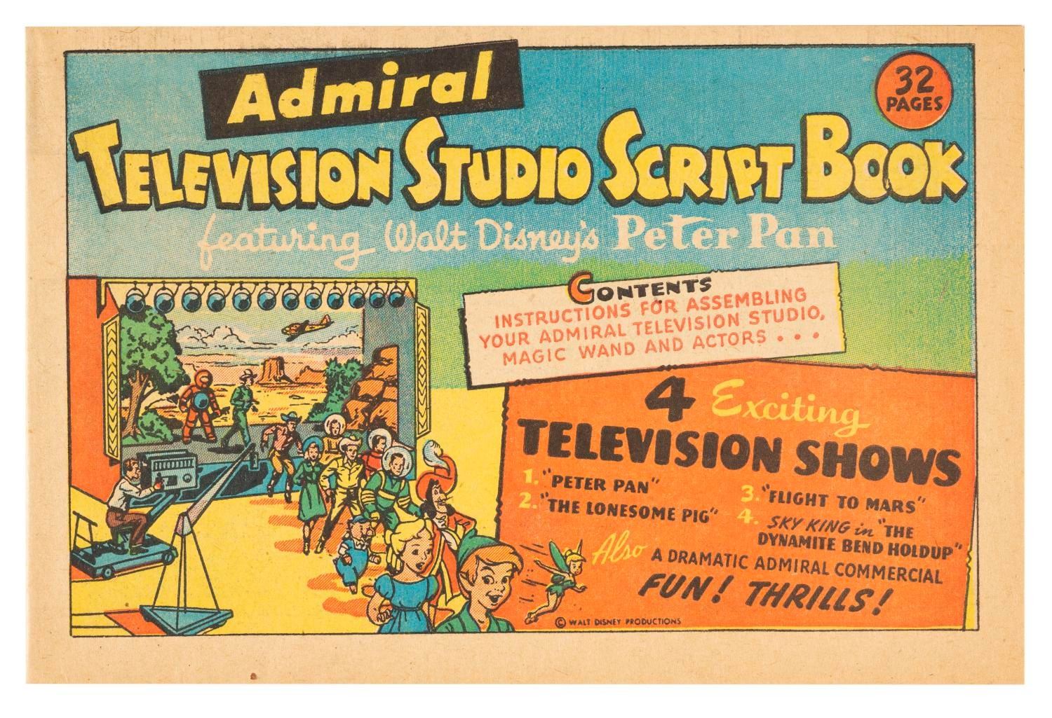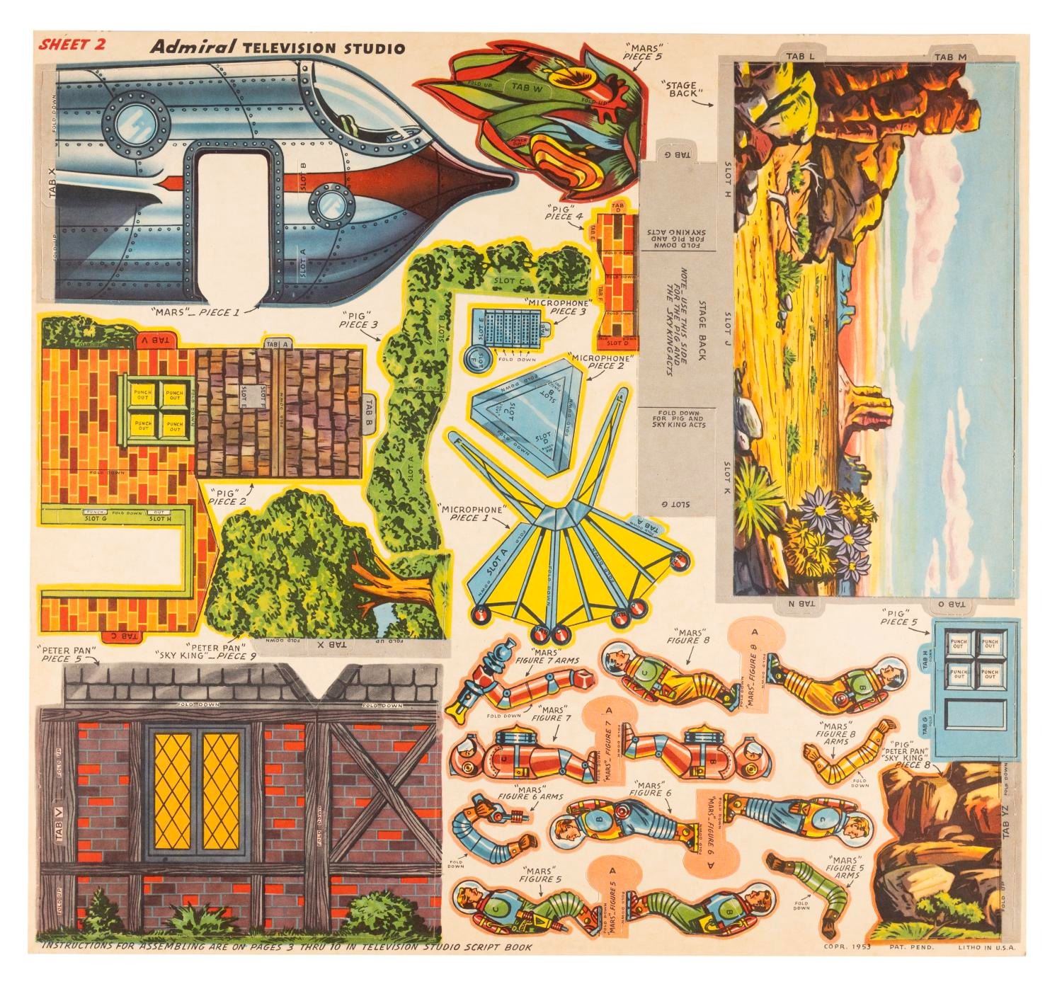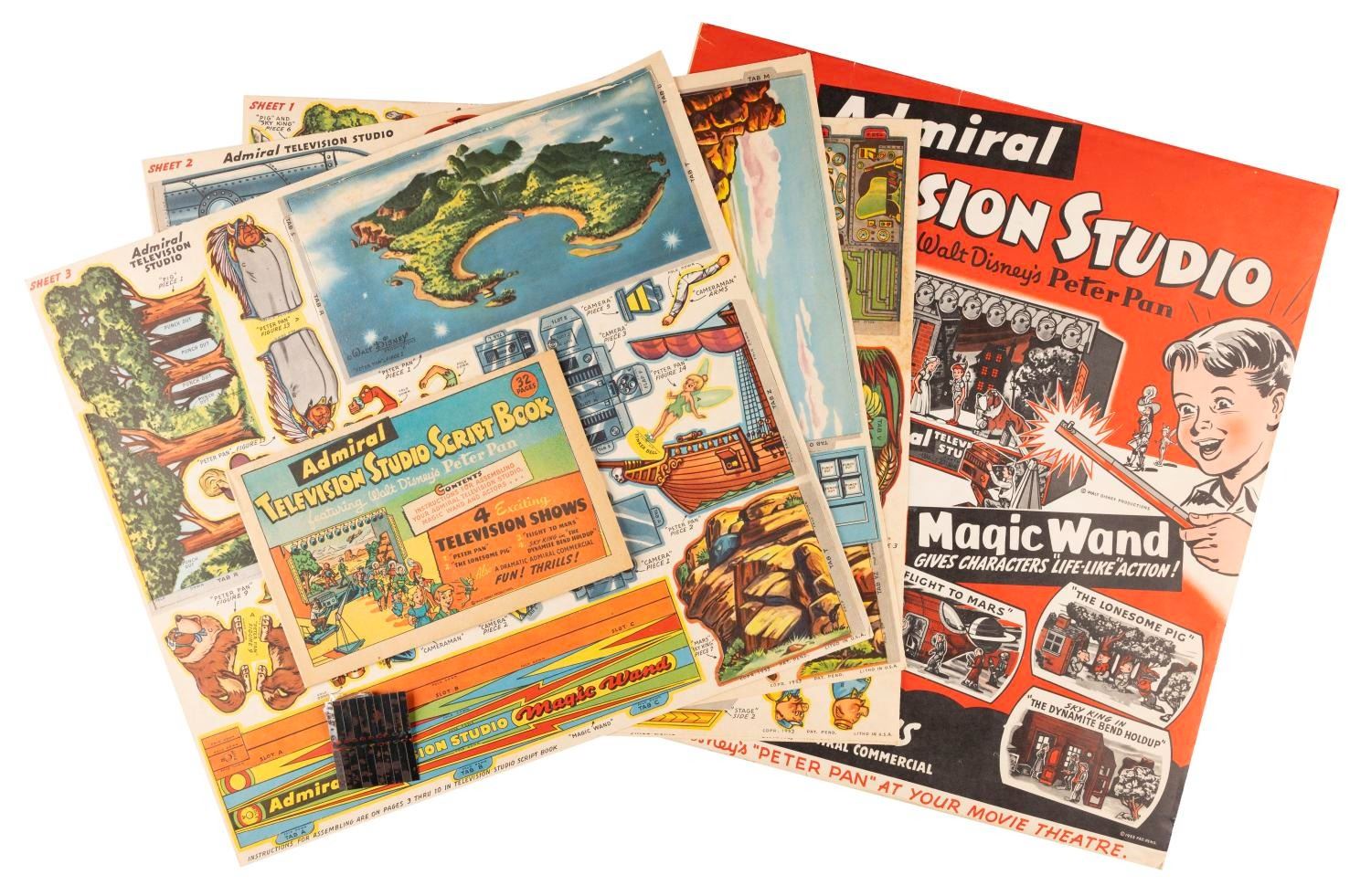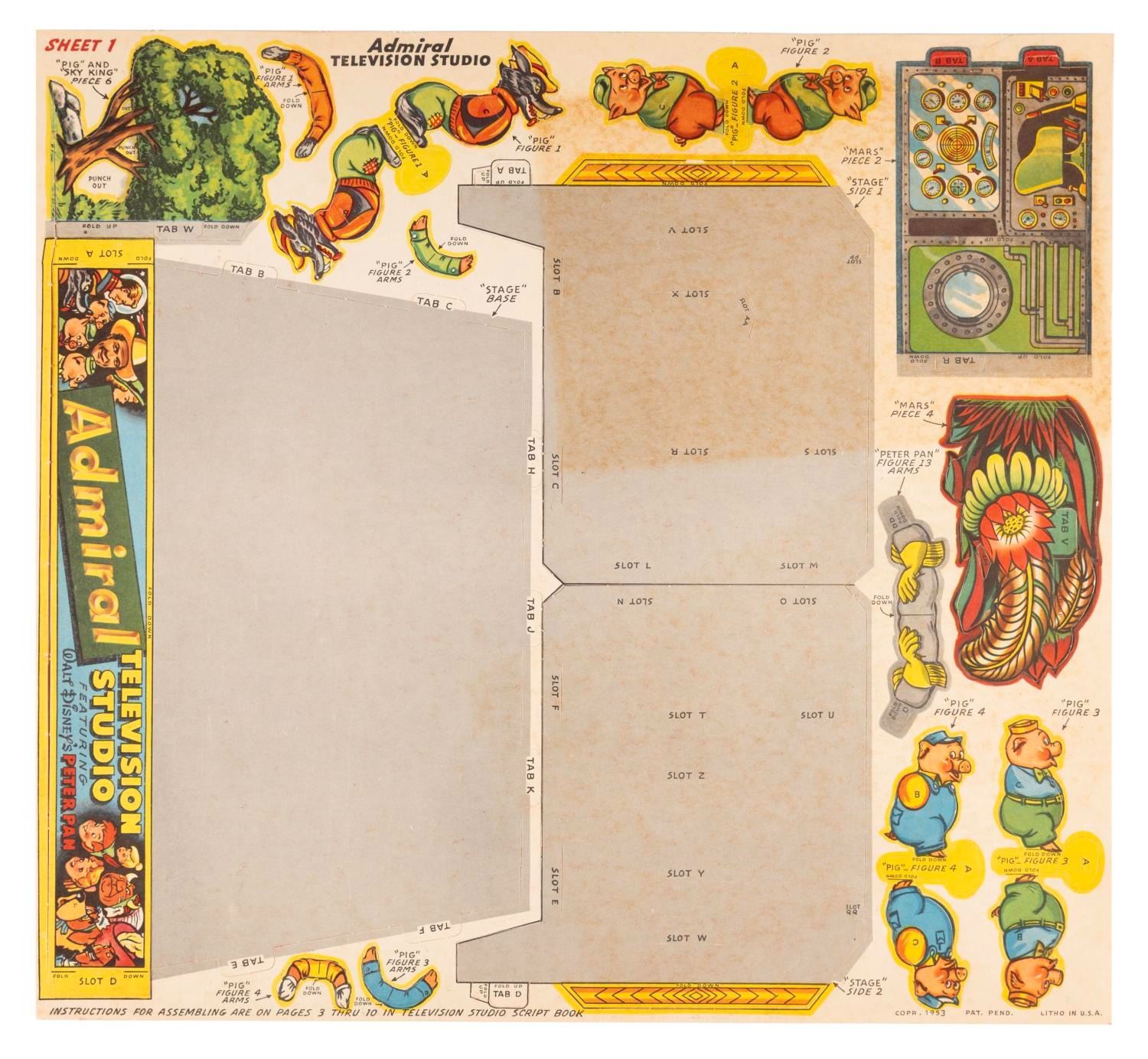 (Admiral, 1953) A “Peter Pan” Admiral Television Studio manufactured for Admiral Electronics. The set contains the Television Studio Script Book, four unpunched lithographic cards with punch-out pieces, and metal and magnetic components to assemble the television stage, props, and "Magic Wand." Ranging in size from the 14.5” x 16” cards to the 15.25” x 16.5” envelope the items are in very good condition with light wear, tears on the envelope’s edges, and oxidation.