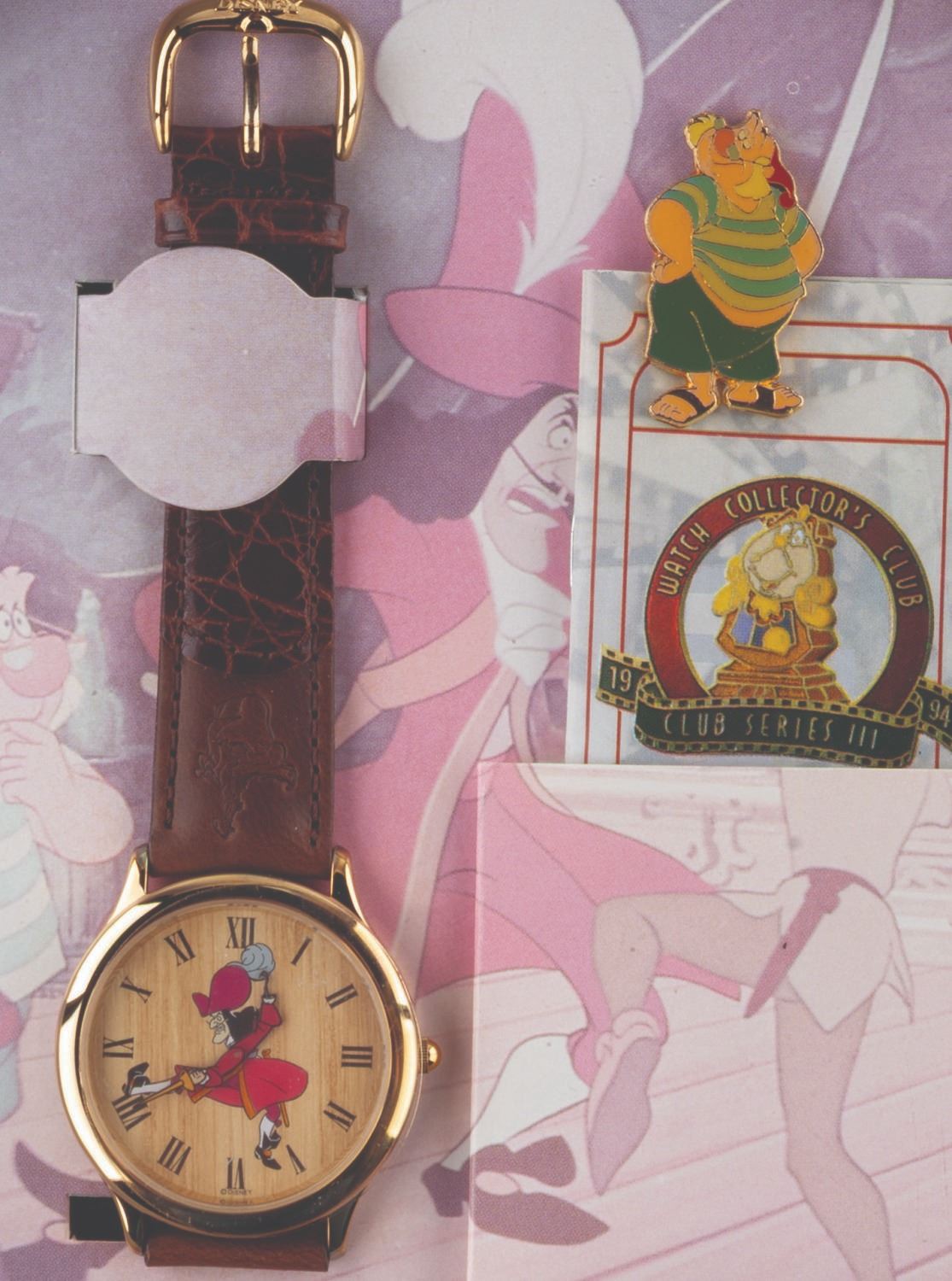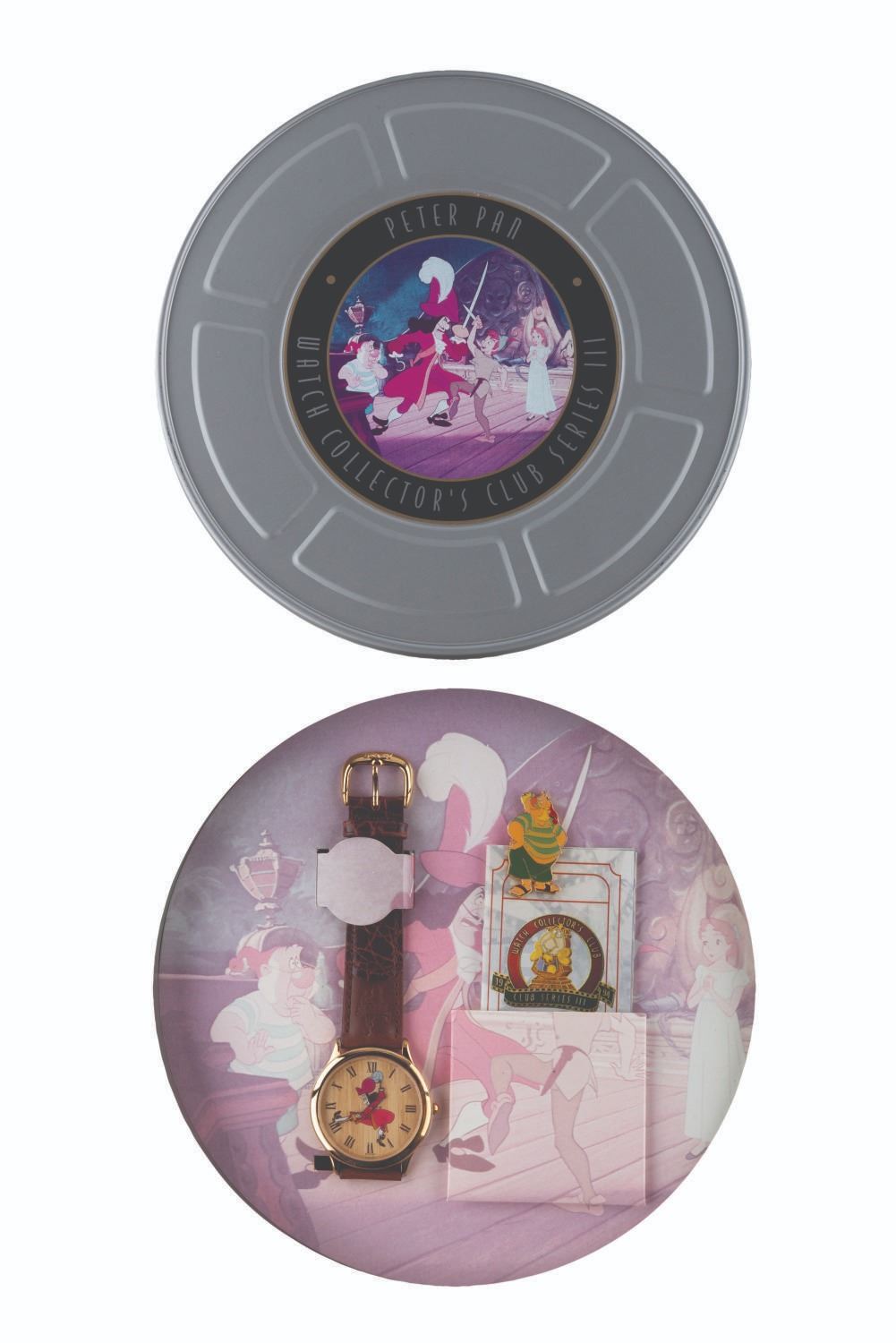 (Disney Store/ Fossil, 1994) A limited edition "Peter Pan " Captain Hook wristwatch released through the Series III Watch Collector’s Club and The Disney Store. The watch was limited to an edition of 7,500, comes with a Smee pin, and is packaged within a film canister-style tin. The set is in fine condition, with the watch requiring a battery and possibly service to function.