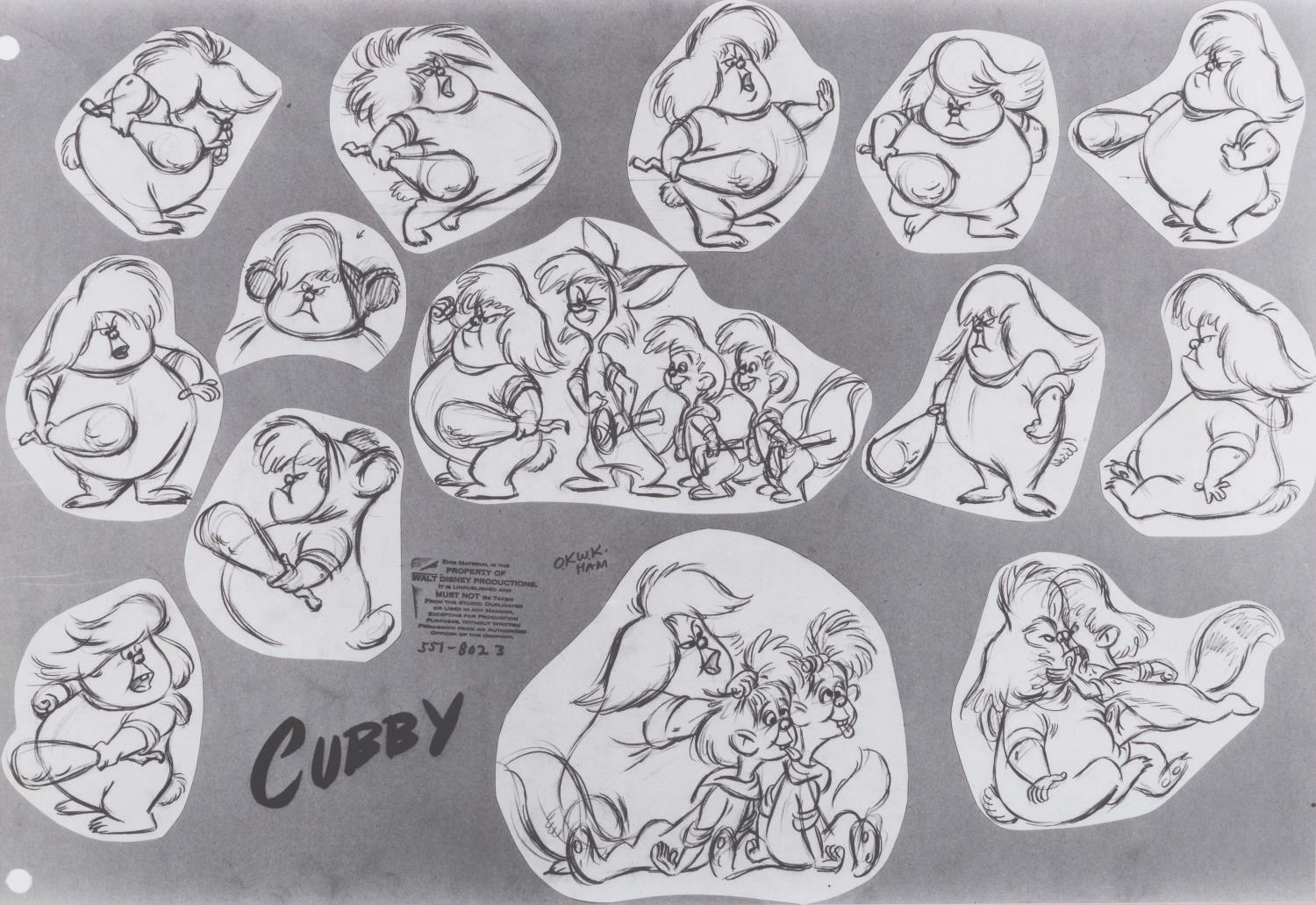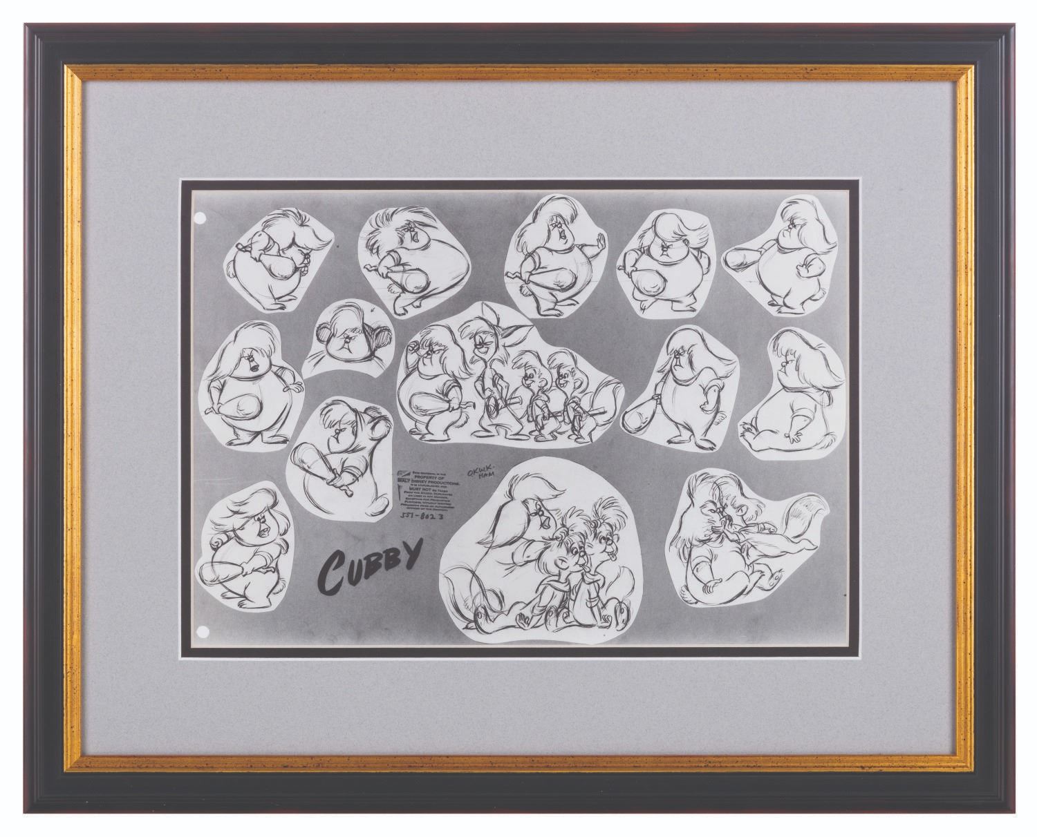 (Disney, 1953) A Studio produced photostat model sheet of Cubby for the 1953 feature film, “Peter Pan.” Model sheets such as these were distributed to animators and crew working on the film so that everyone could draw the character the same way. Measuring 9.25” x 13.5” on a 14.5” x 18.75” matte, the art is in very good condition with light scratches and discoloration from age.