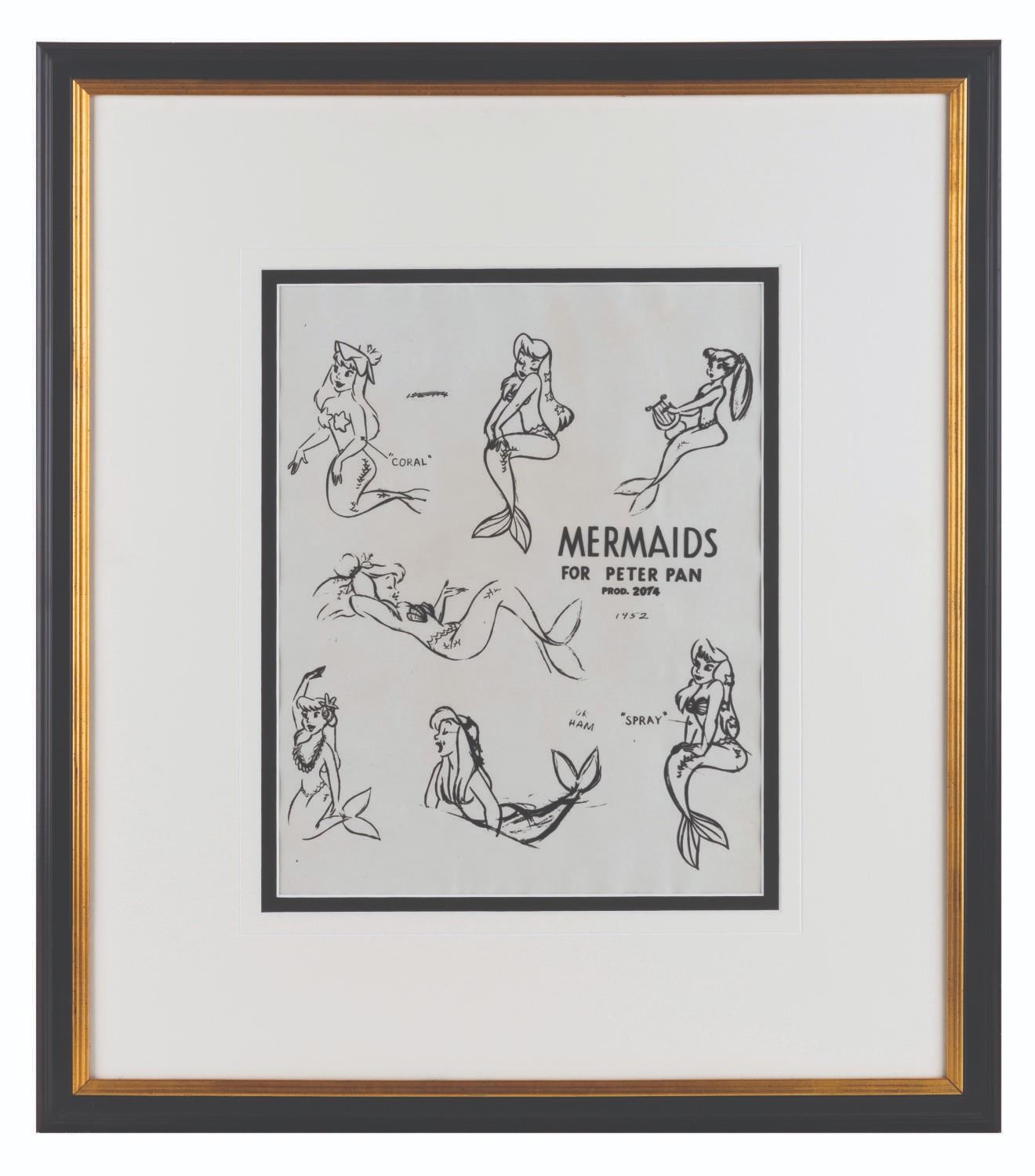 (Disney, 1953) A Studio produced photostat model sheet of mermaids for the 1953 feature film, "Peter Pan." Model sheets such as these were distributed to animators and crew working on the film so that everyone would draw the character the same way. The sheet with 10.75" x 13.5" visible inside the 19.5” x 22” matte is in good condition with some wear from original production use including a pencil mark across one reference number.