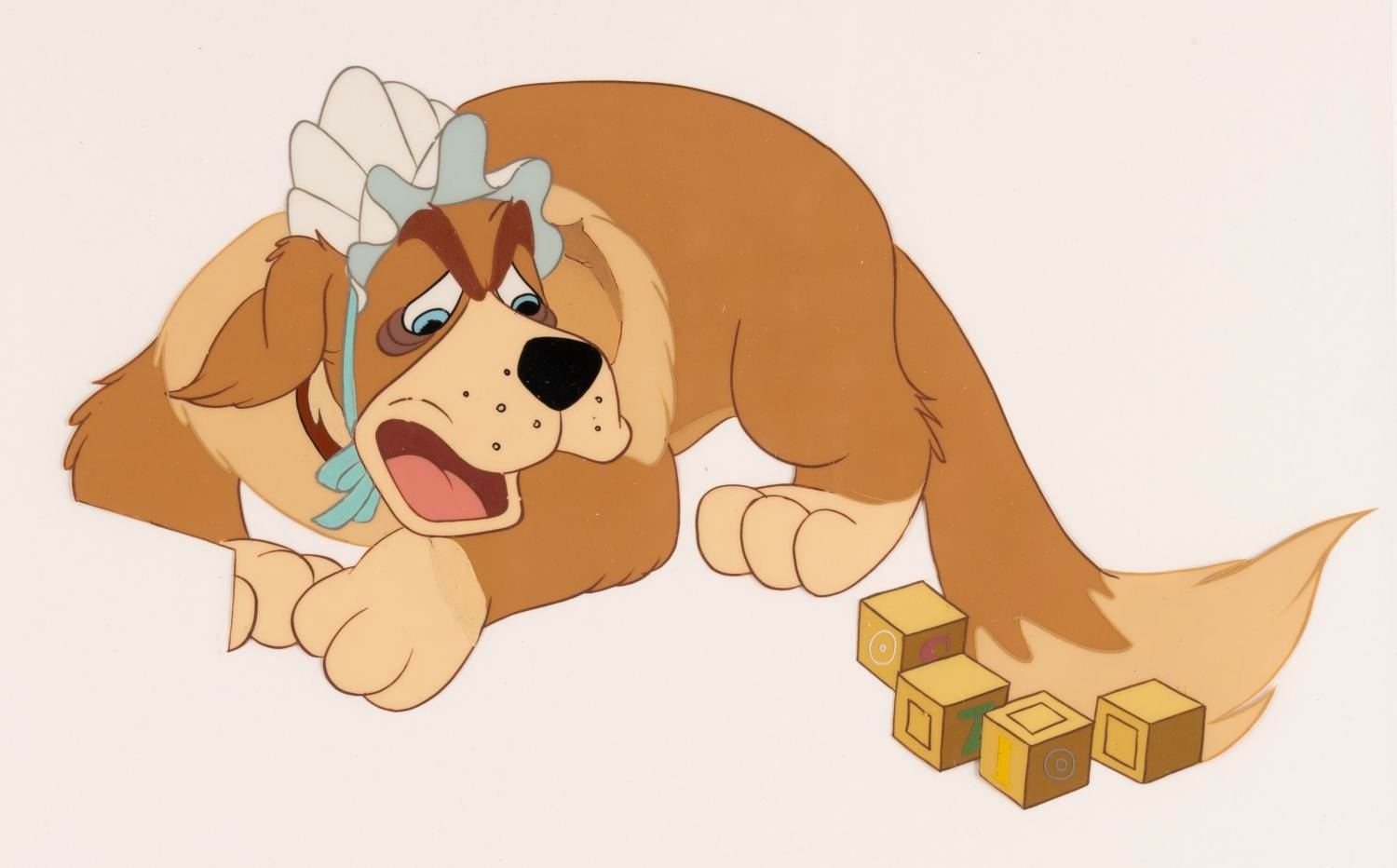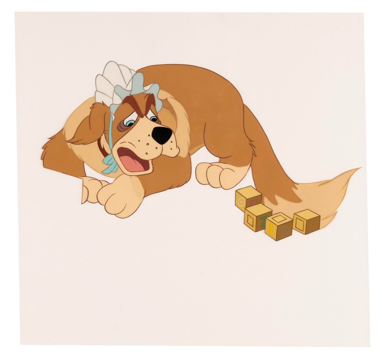 (Disney, 1953) An original production cel of Nana from Disney’s "Peter Pan." With a character image size of 4.25” x 7.5” on a 8” x 8.5” trimmed cel, Nana displays in very good condition with light paint separation, paint loss, scuffs, and scratches.